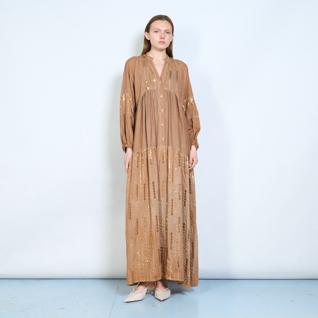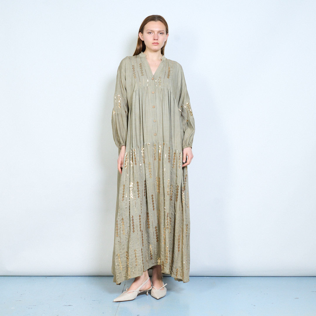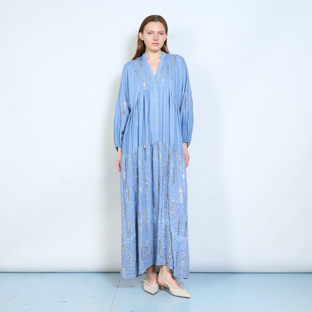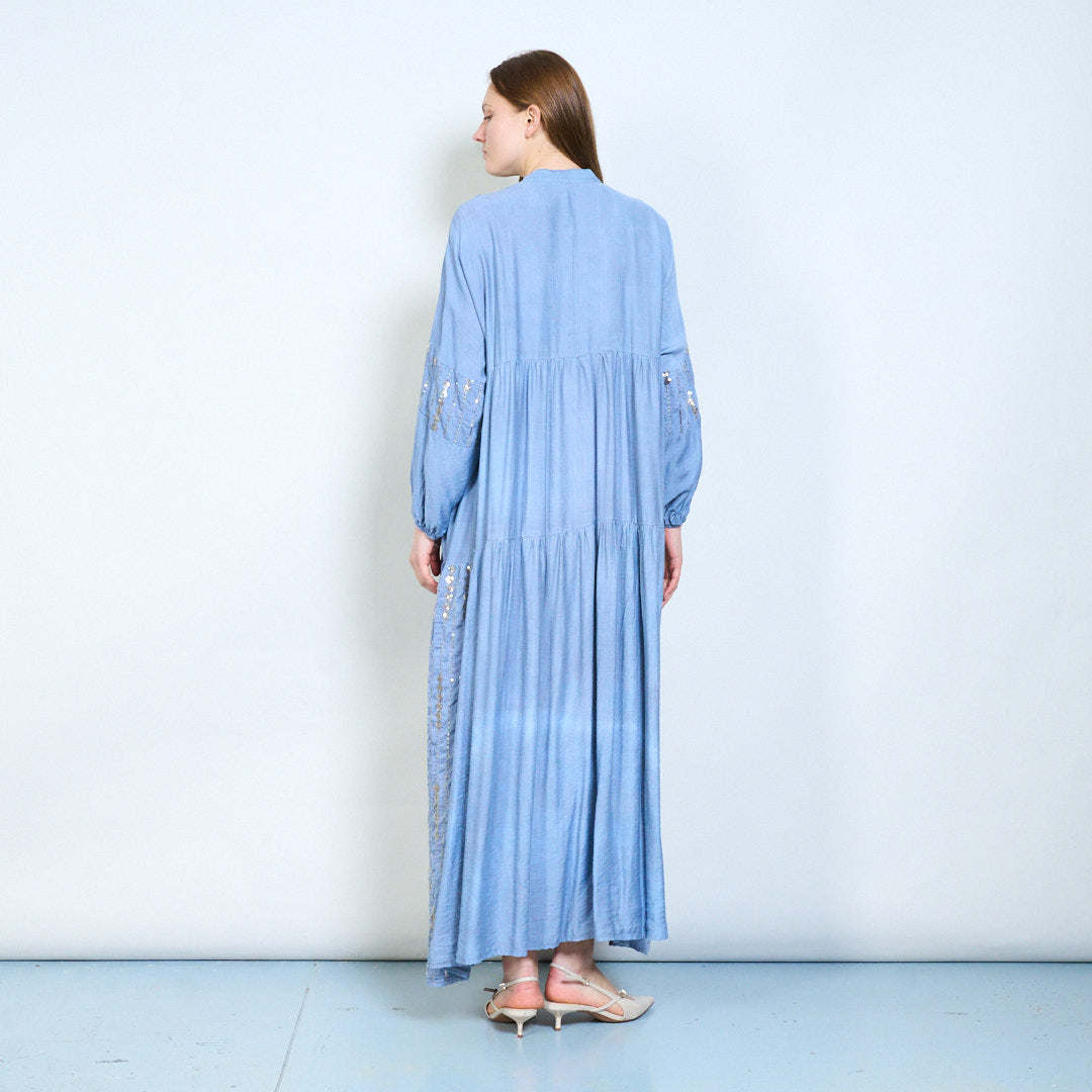 Robe midi en lin à panneaux brodés avec niveaux doux en gros