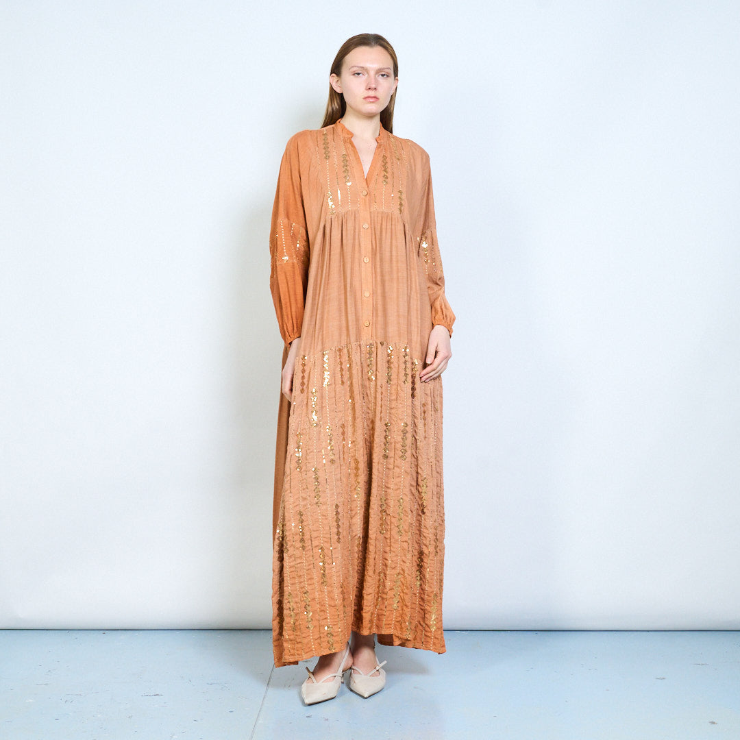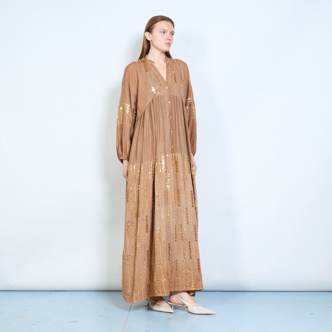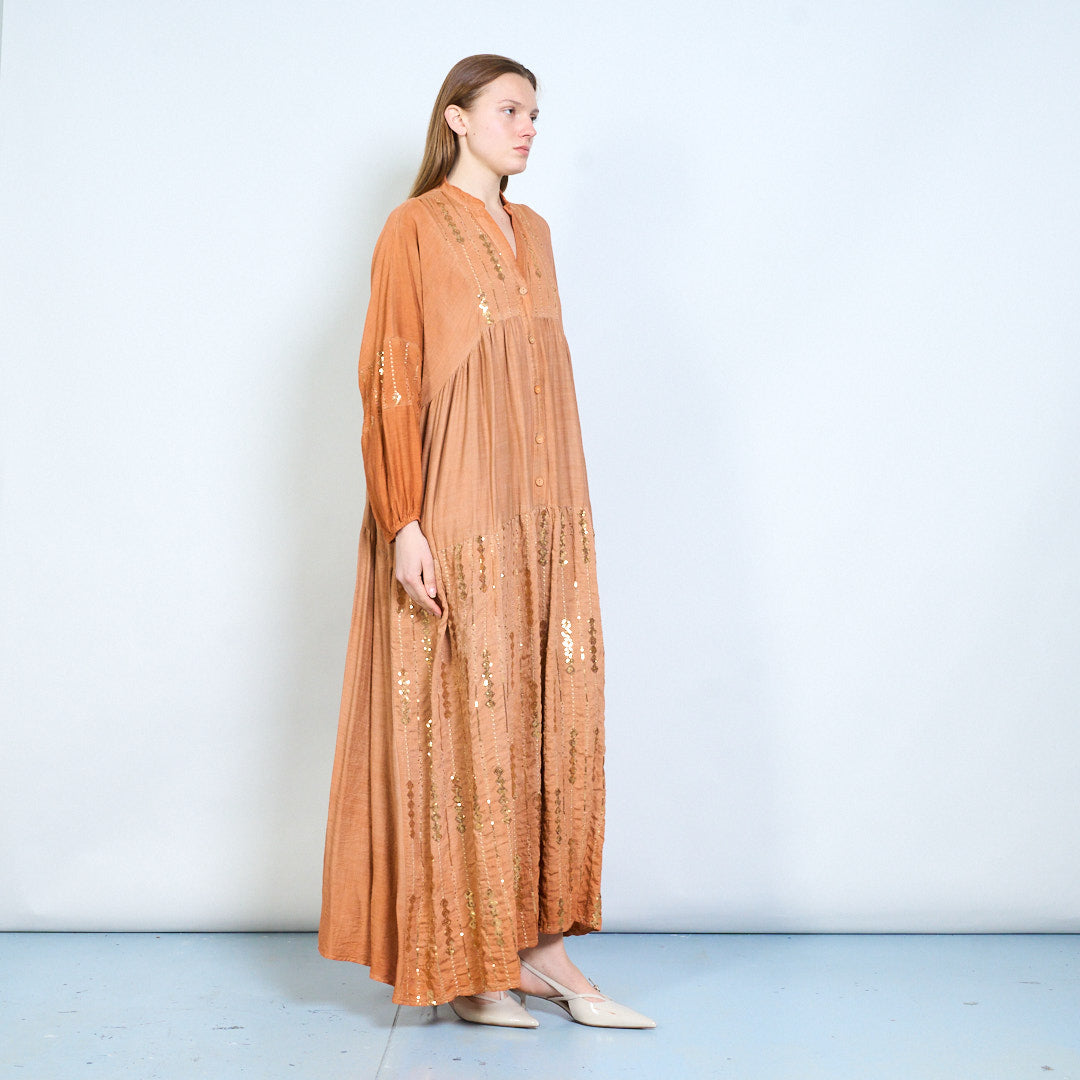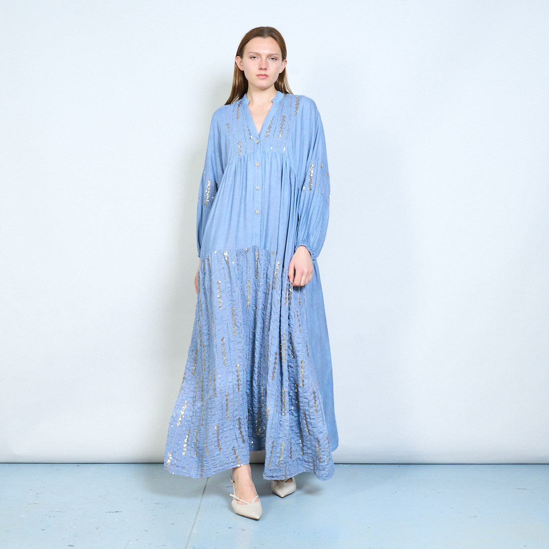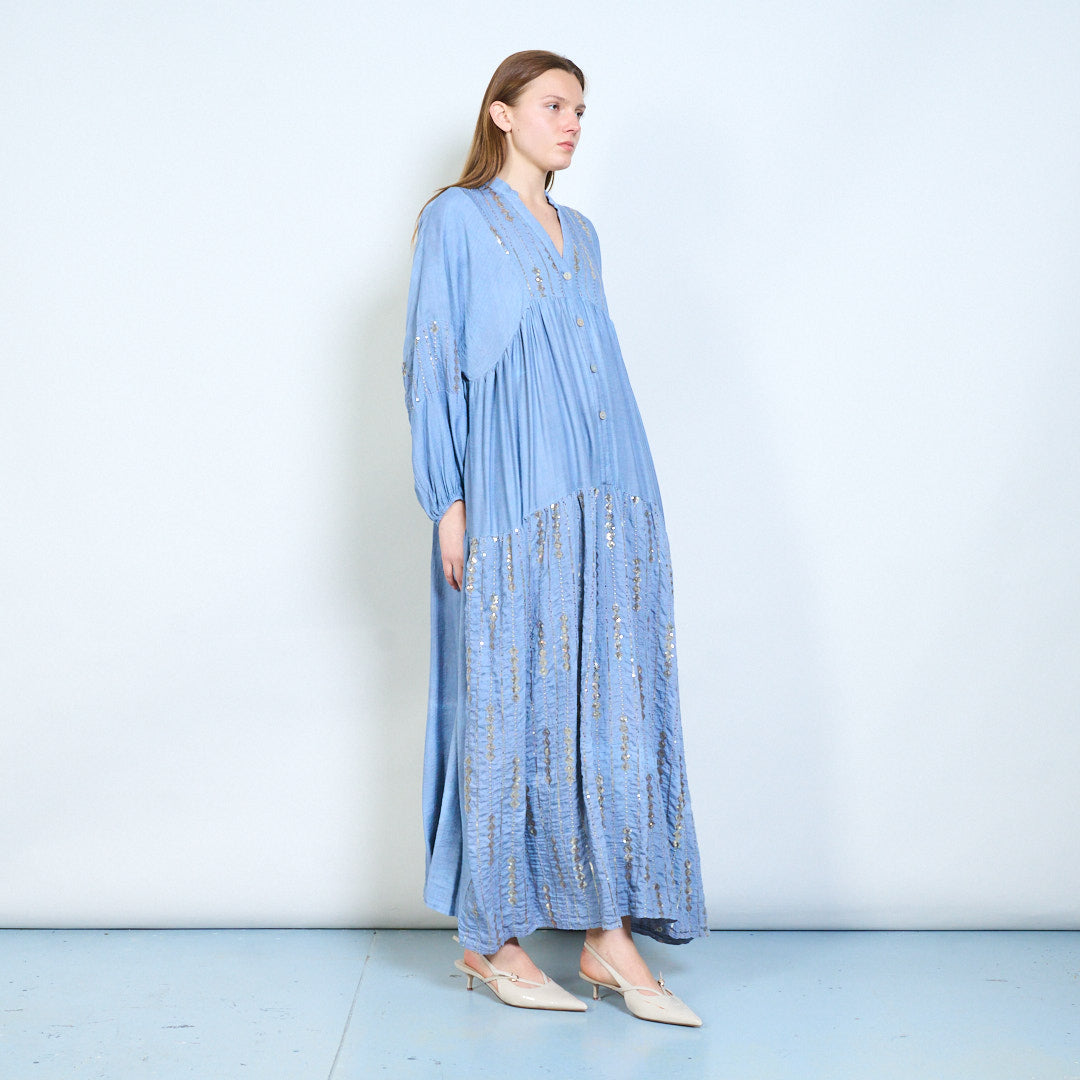 Robe midi en lin à panneaux brodés avec niveaux doux en gros