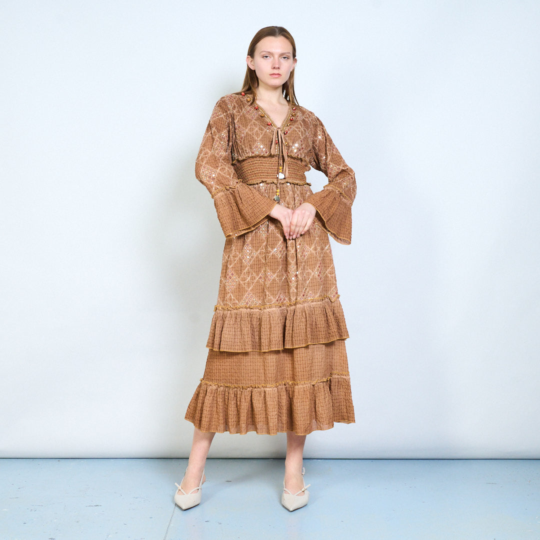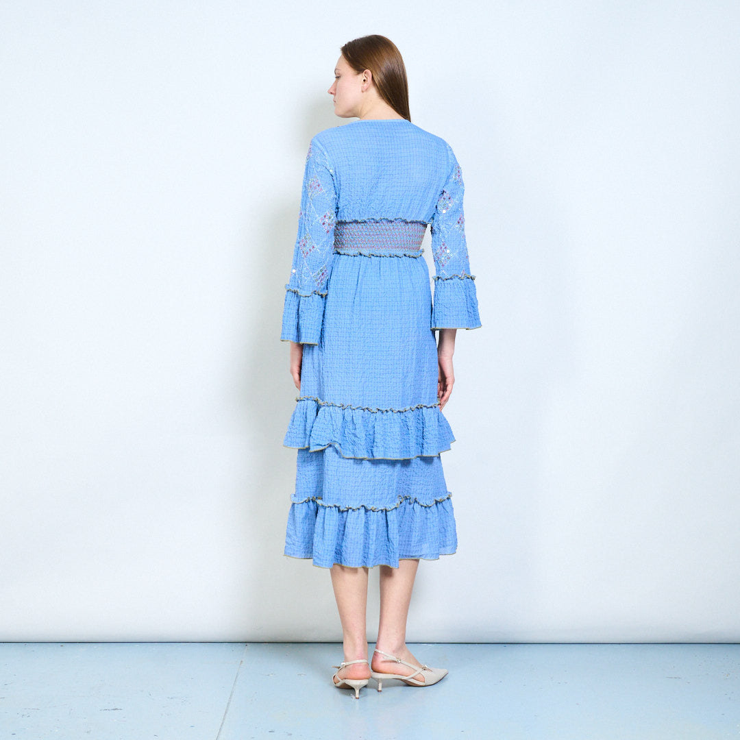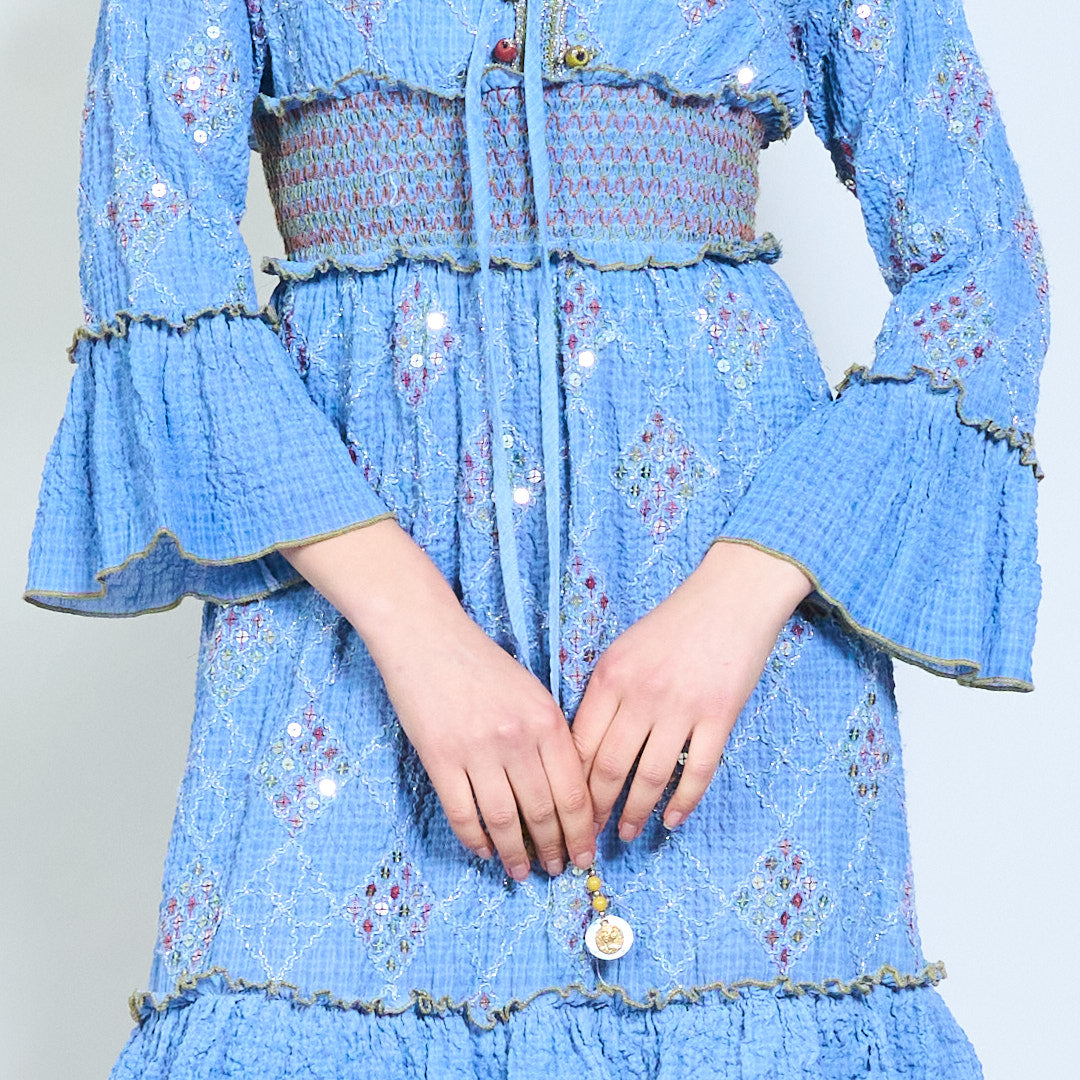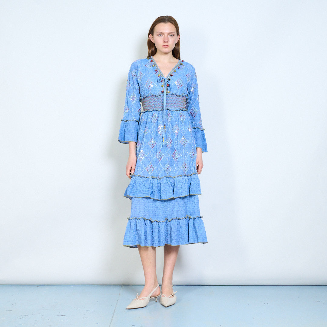 Robe texturée à plusieurs niveaux avec encolure ornée et taille smockée en gros