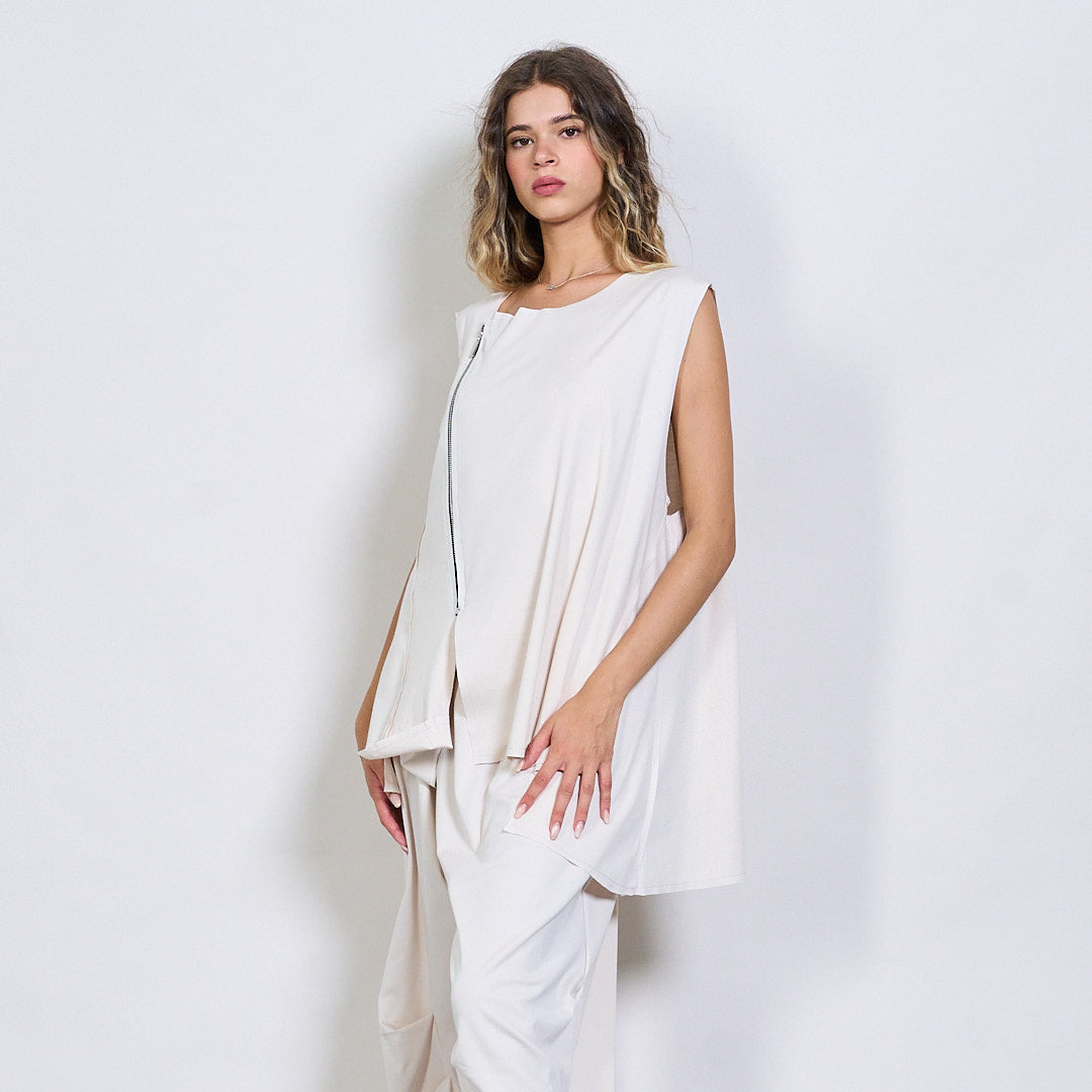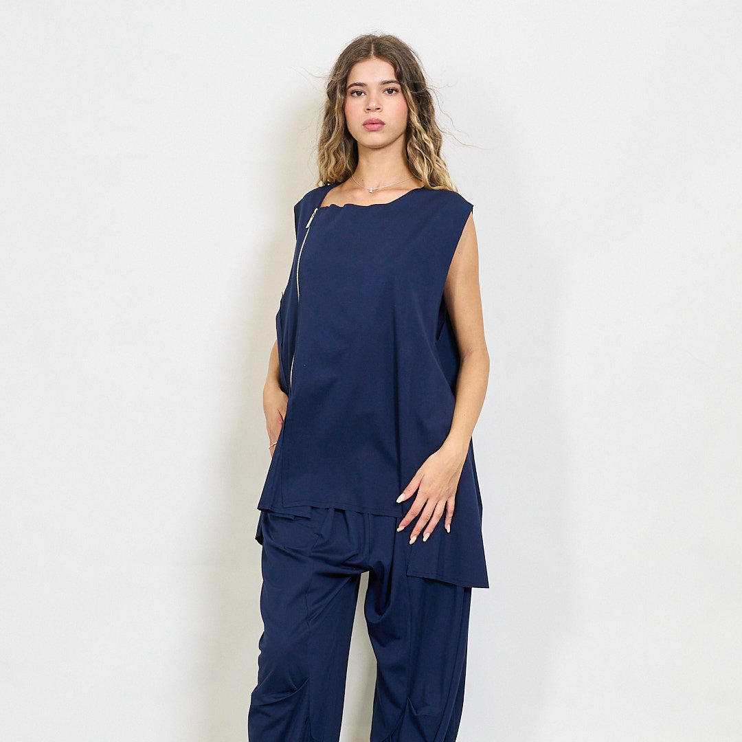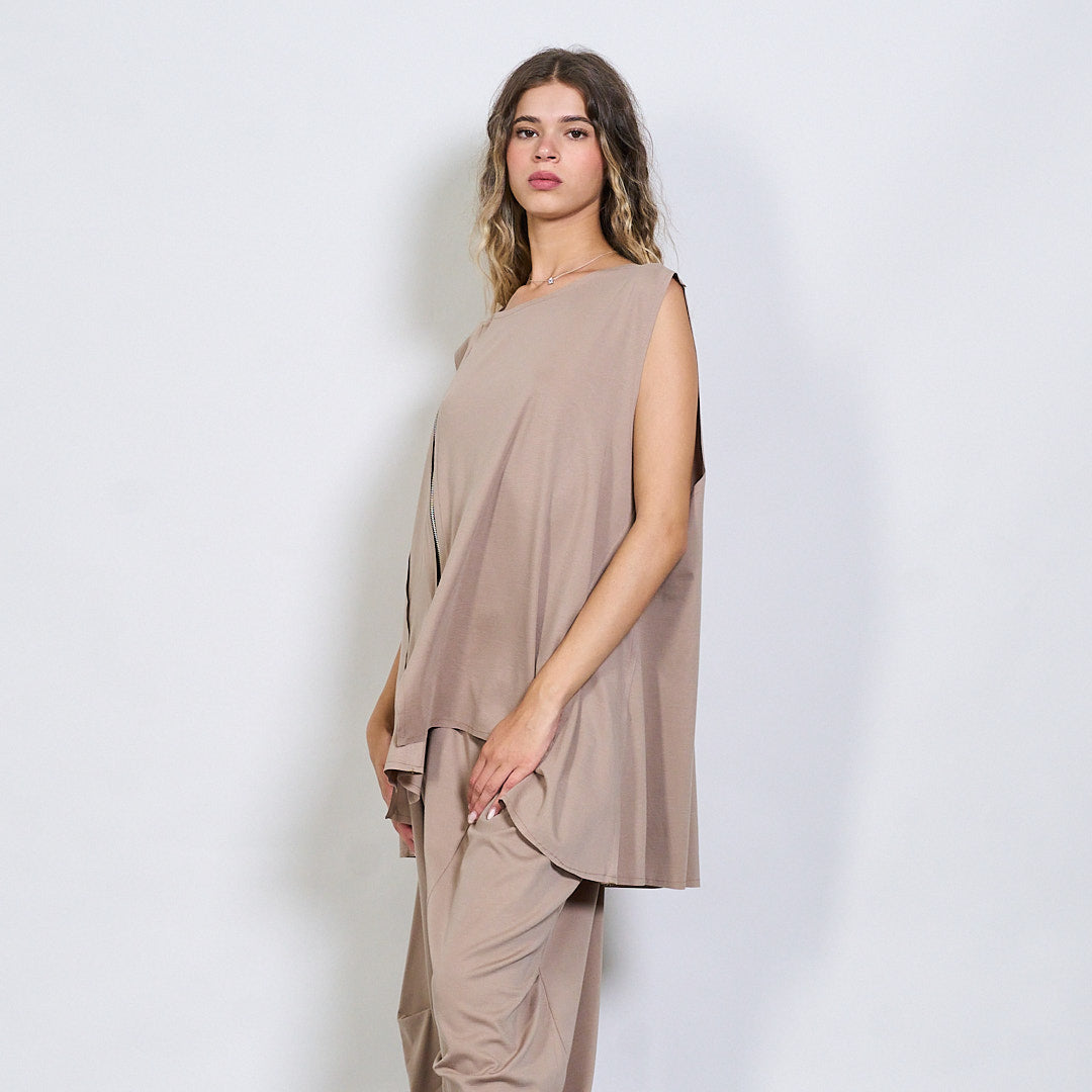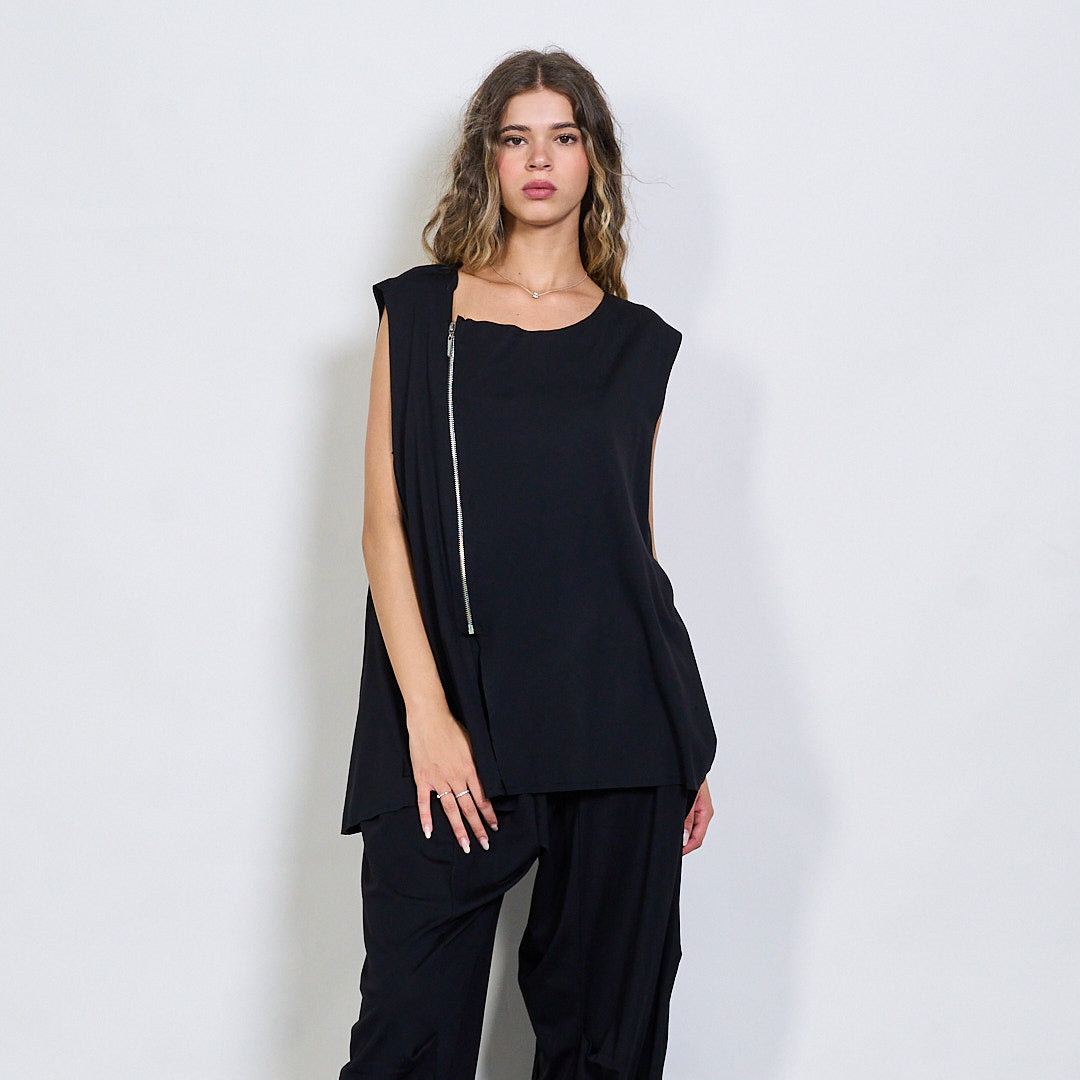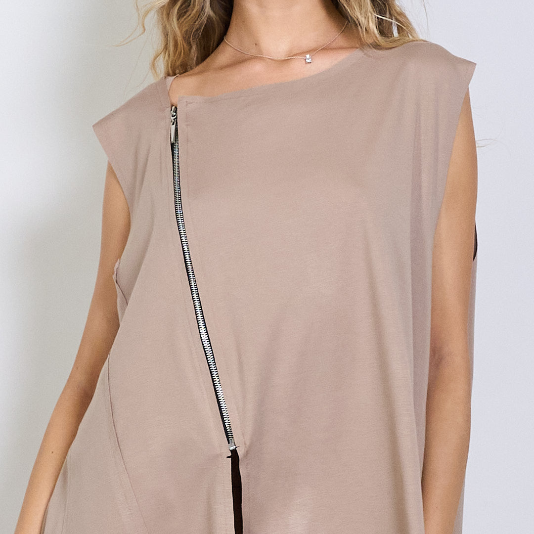 Blús zip sleeveless neamhshiméadrach le mórdhíola gearrtha sreabhach