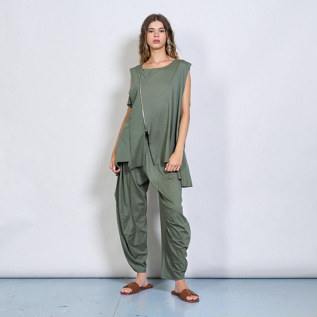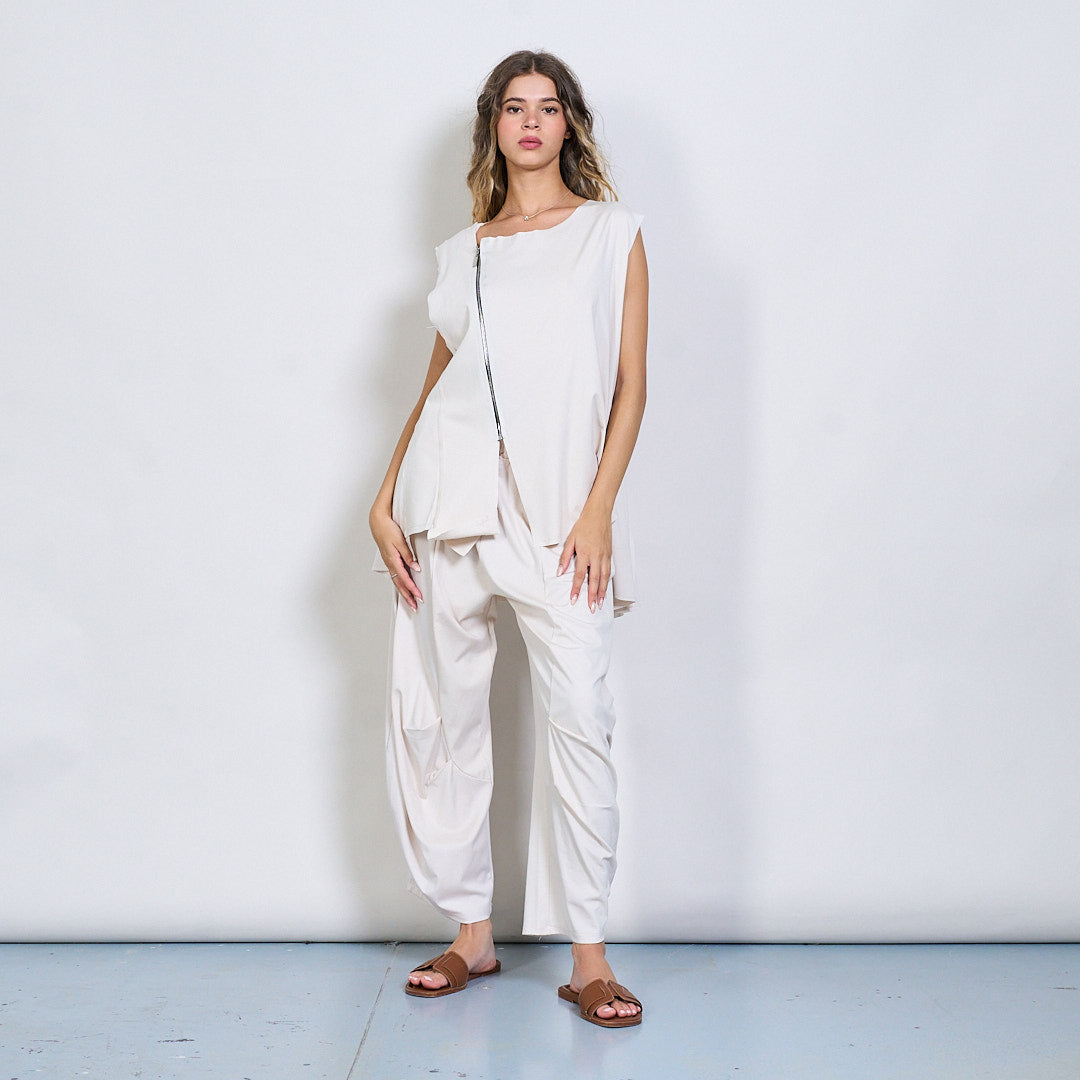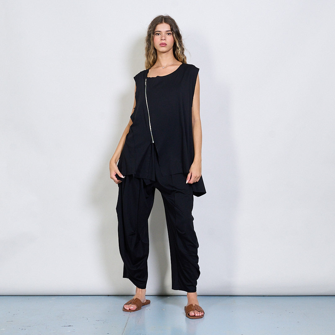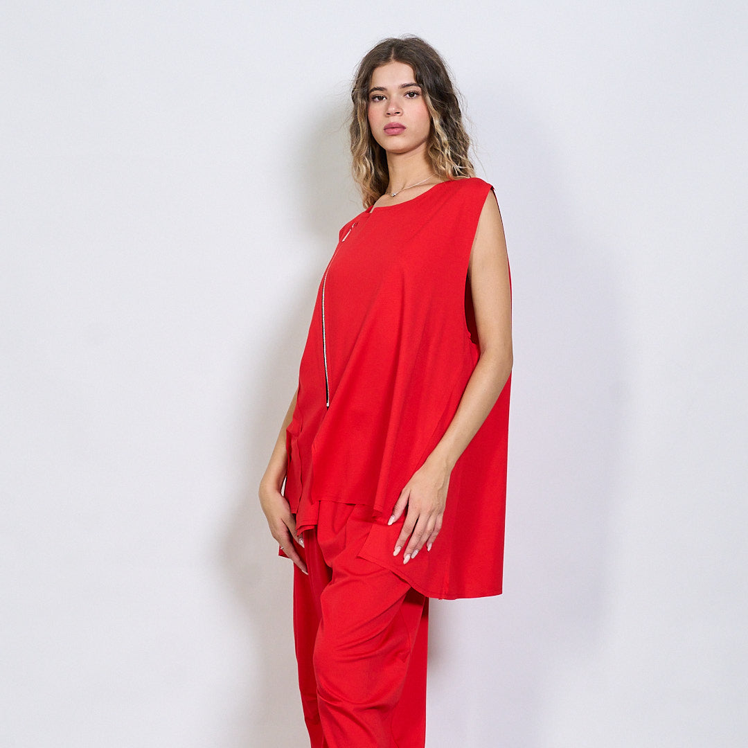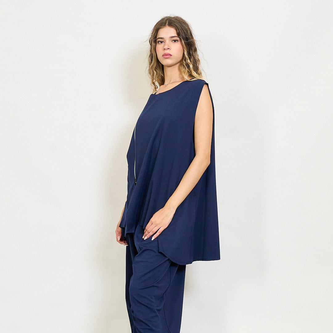 Blús zip sleeveless neamhshiméadrach le mórdhíola gearrtha sreabhach
