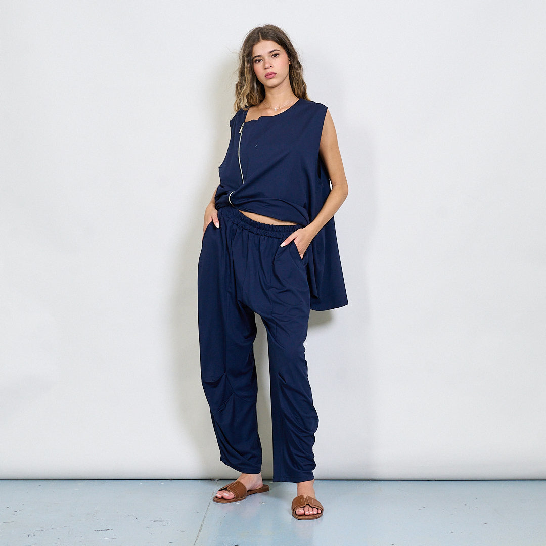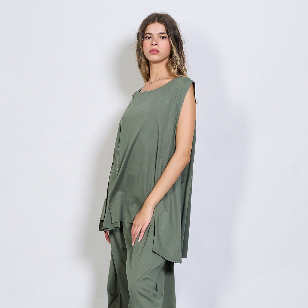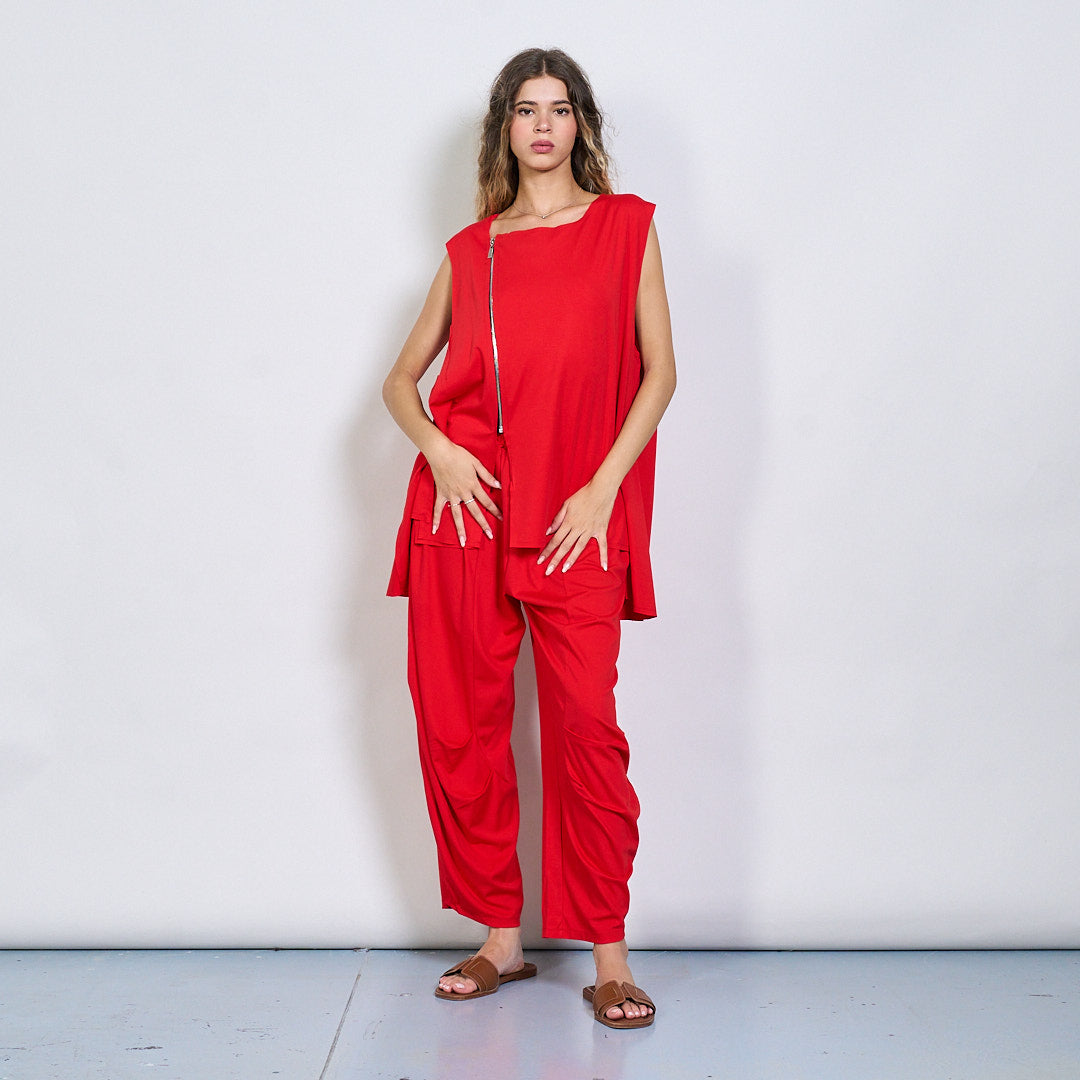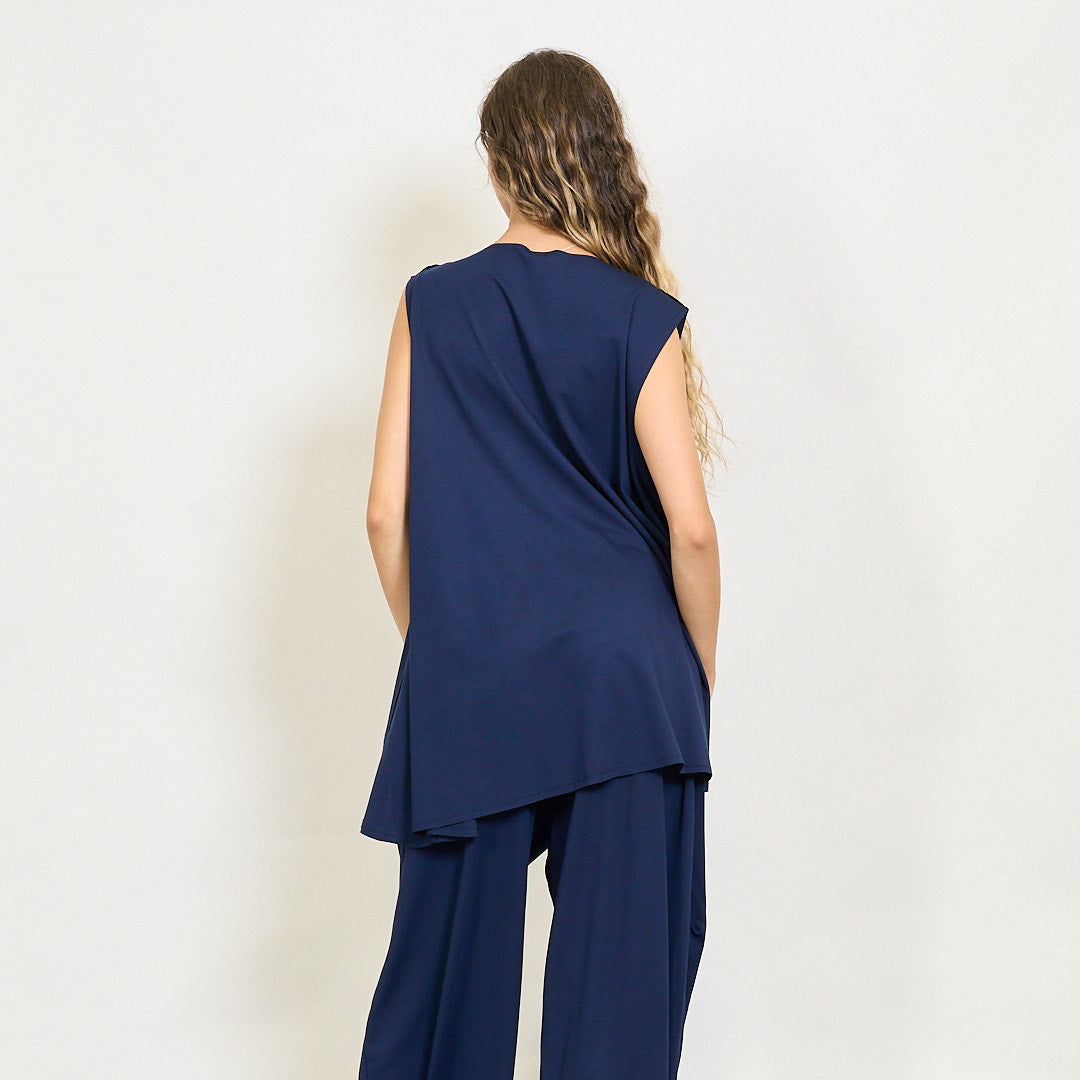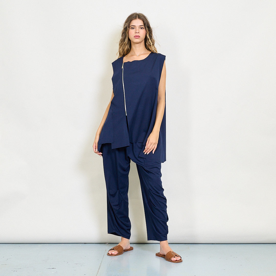 Blús zip sleeveless neamhshiméadrach le mórdhíola gearrtha sreabhach