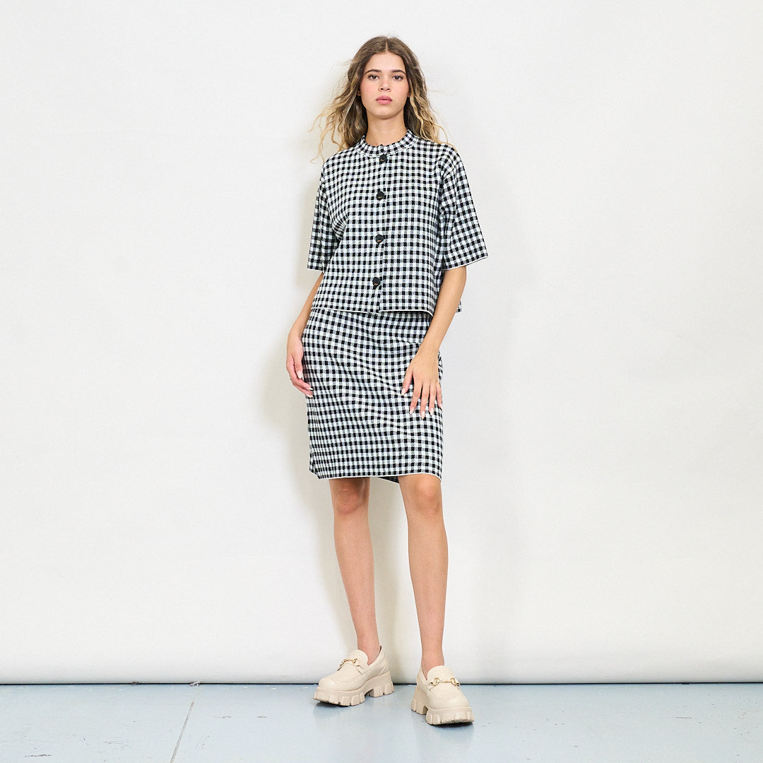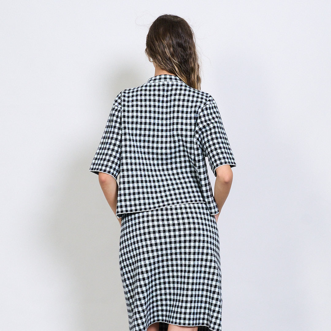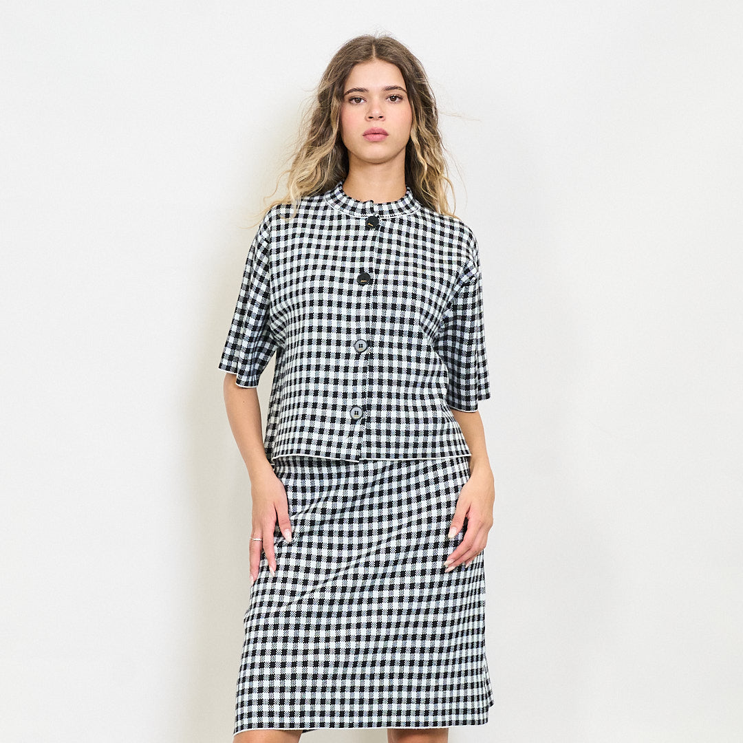 Gingham gearr-sleamhnáin cniotáilte le cnaipí tosaigh mórdhíola