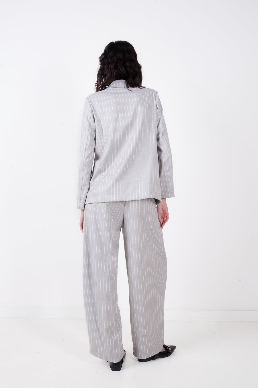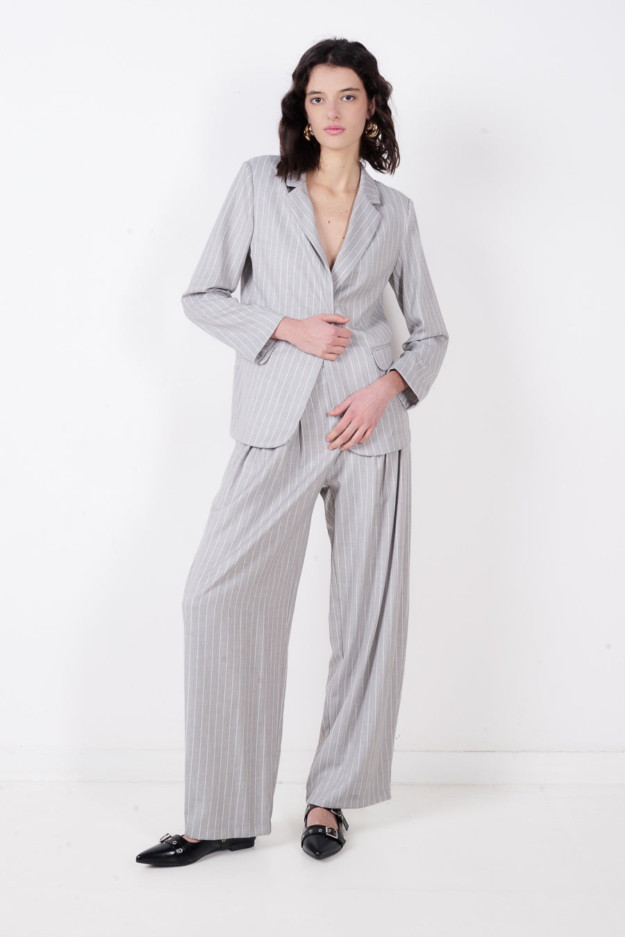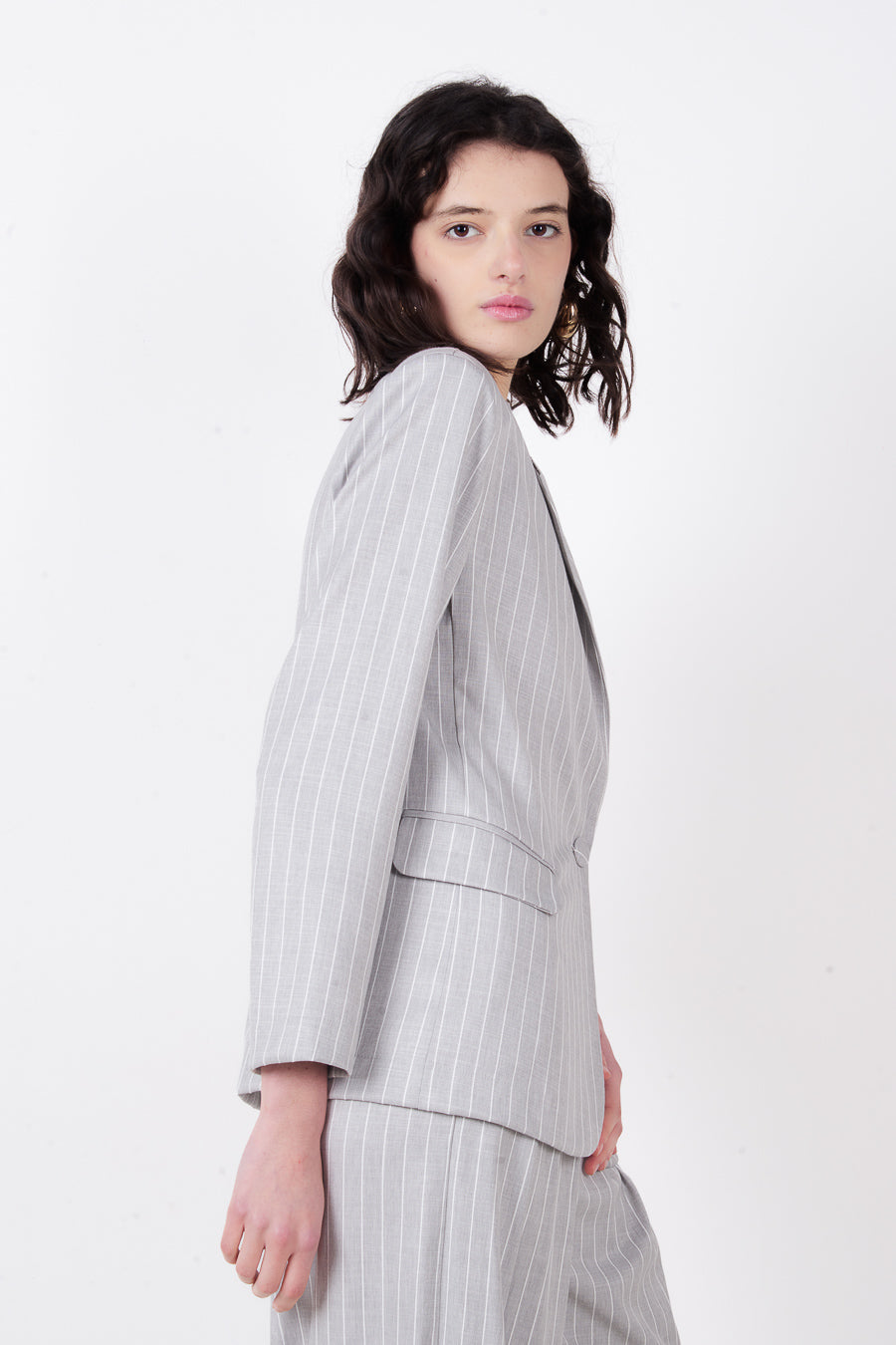 Pinstripe blazer cnaipe aonair oiriúnaithe mórdhíola