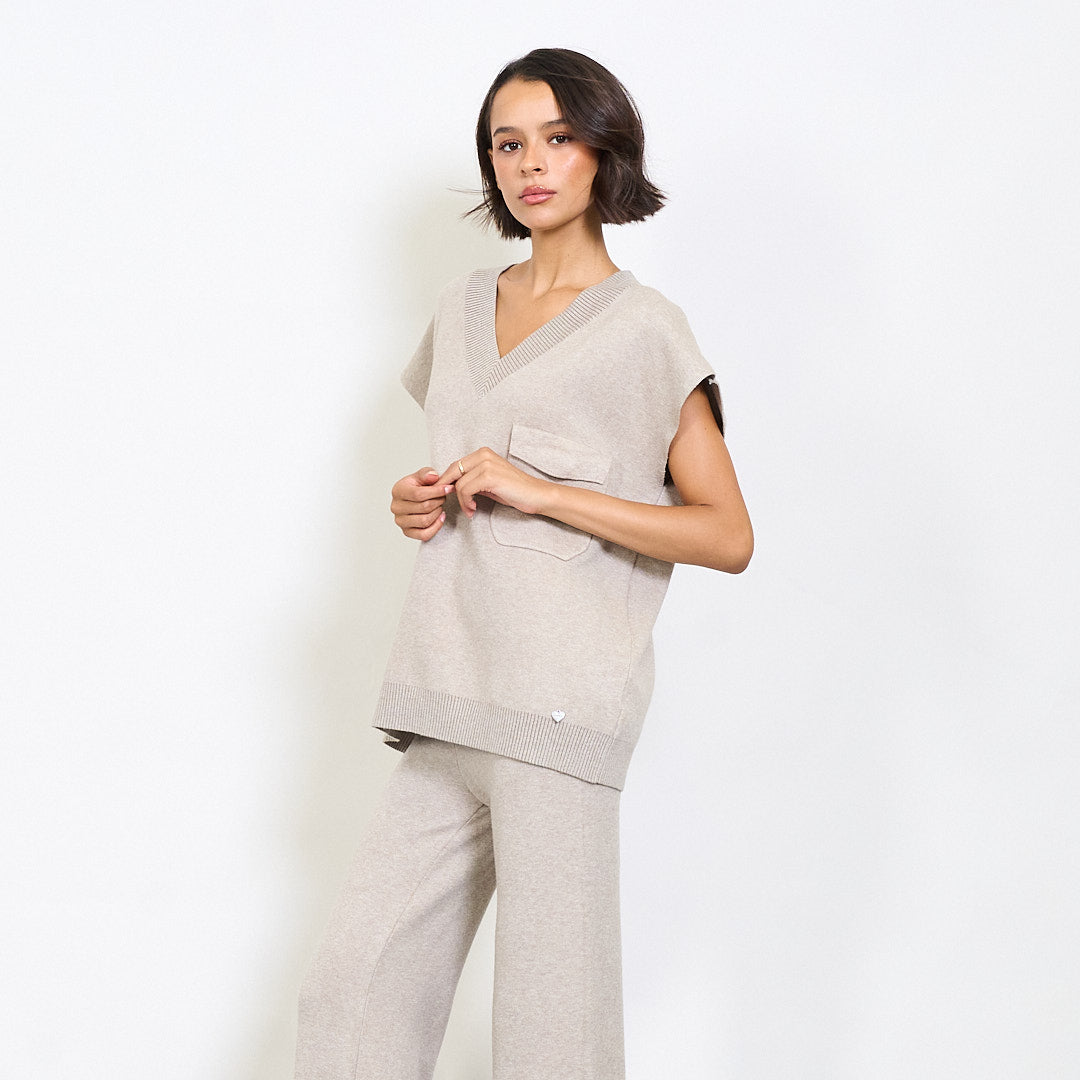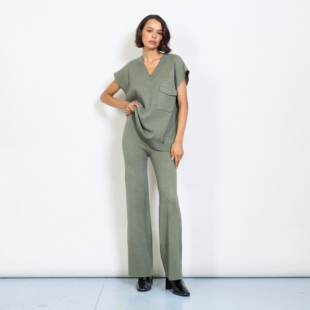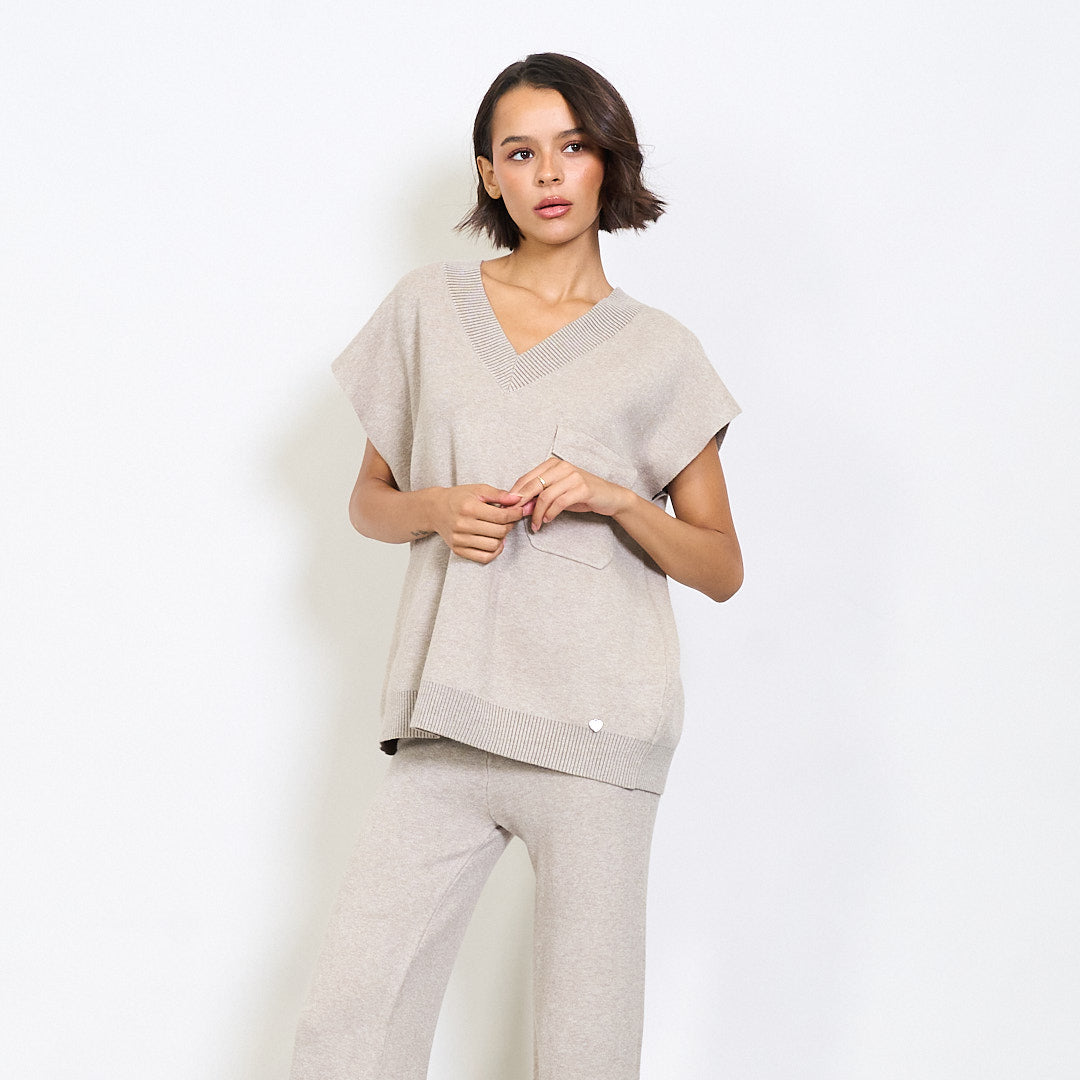 V-neck cniotáilte barr agus brístí cos leathana atá leagtha síos le clib phóca agus miotail mórdhíola mórdhíola