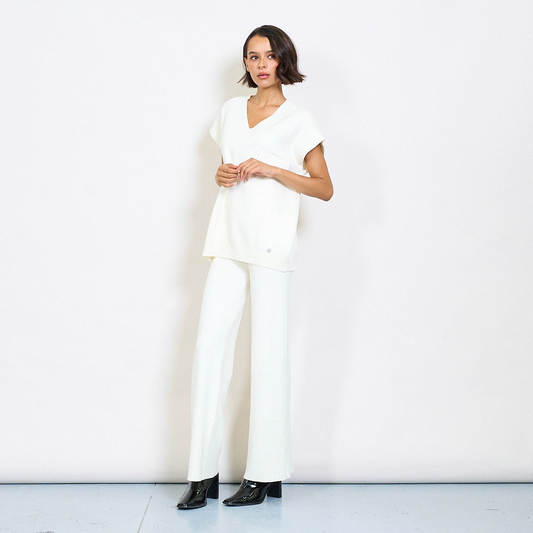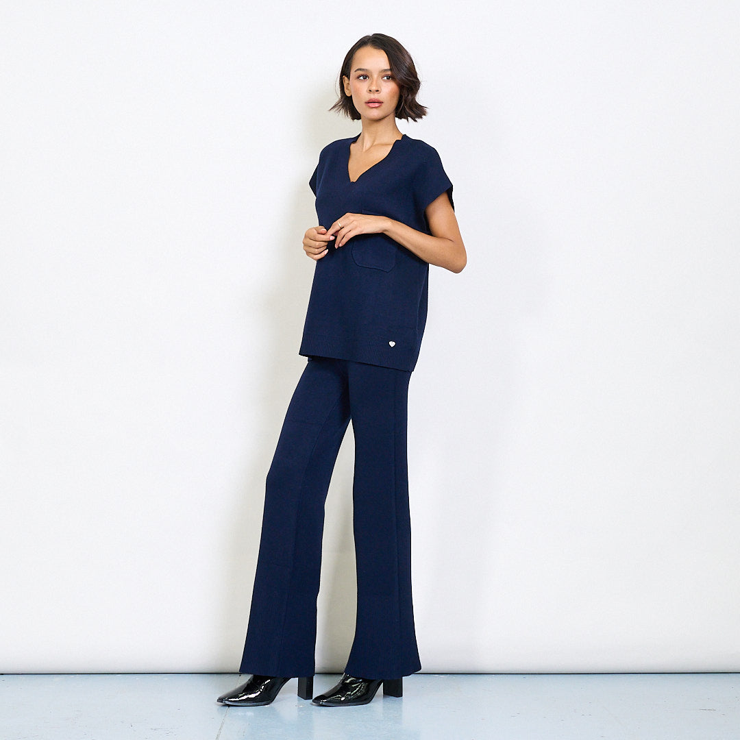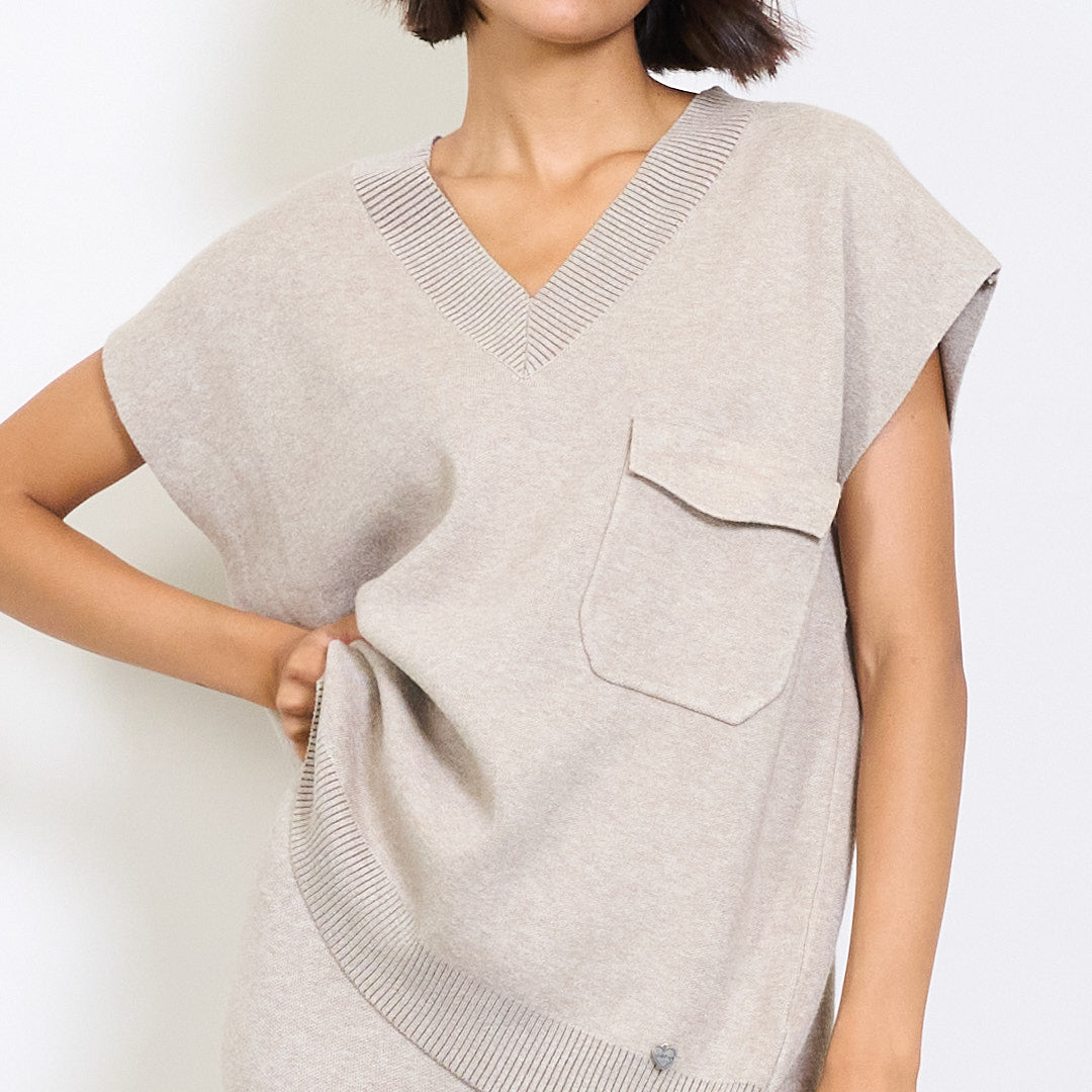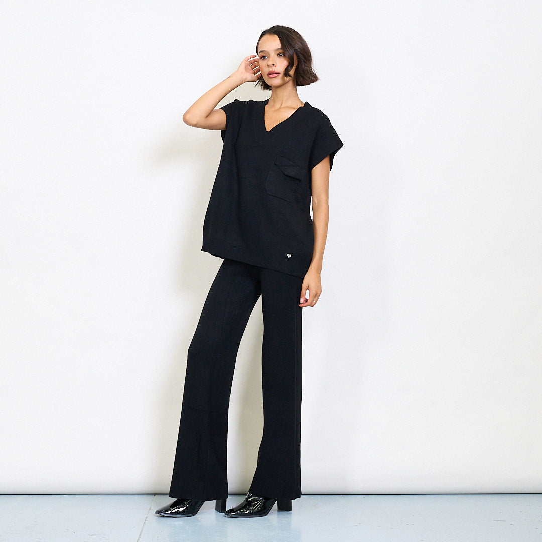 V-neck cniotáilte barr agus brístí cos leathana atá leagtha síos le clib phóca agus miotail mórdhíola mórdhíola