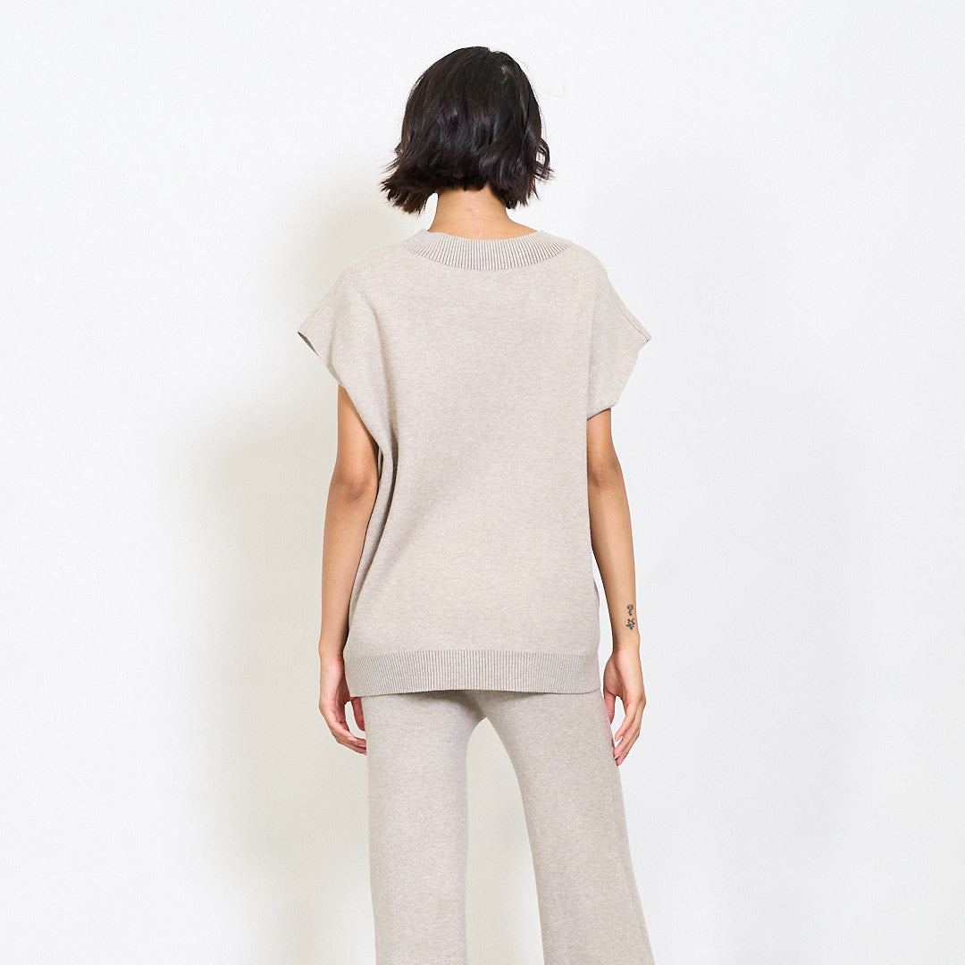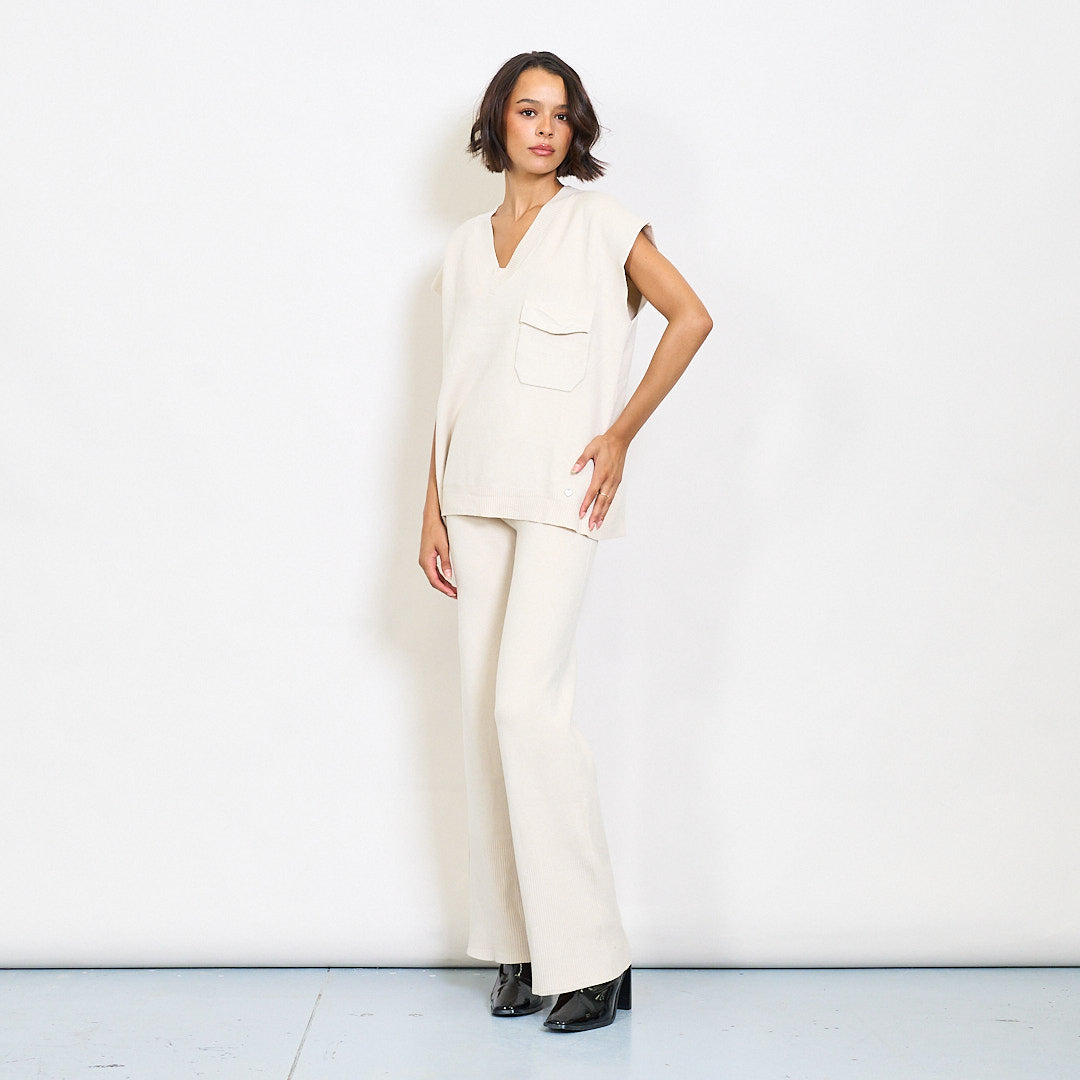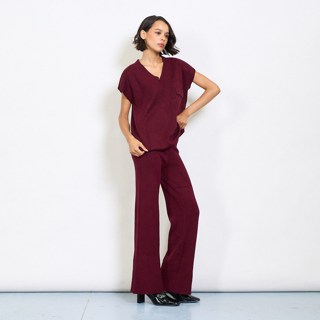 - Tacar cniotáilte dhá phíosa ina bhfuil barr suaimhneach sleeveless agus bríste meaitseála