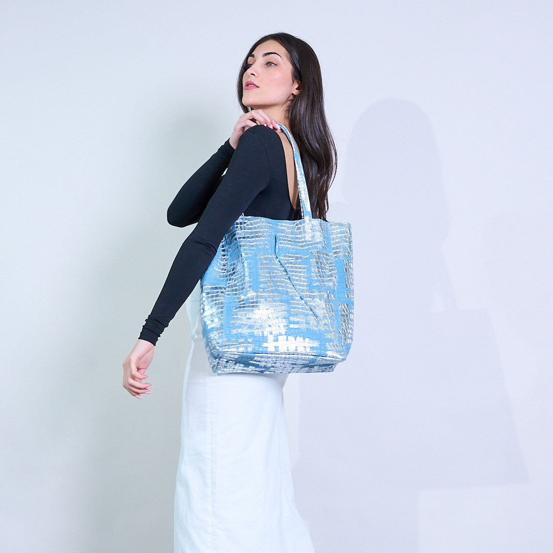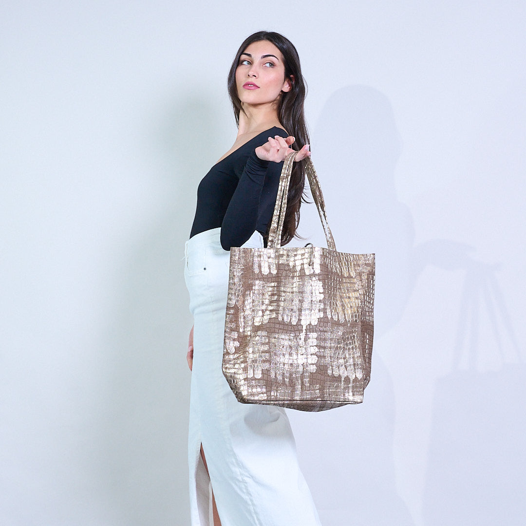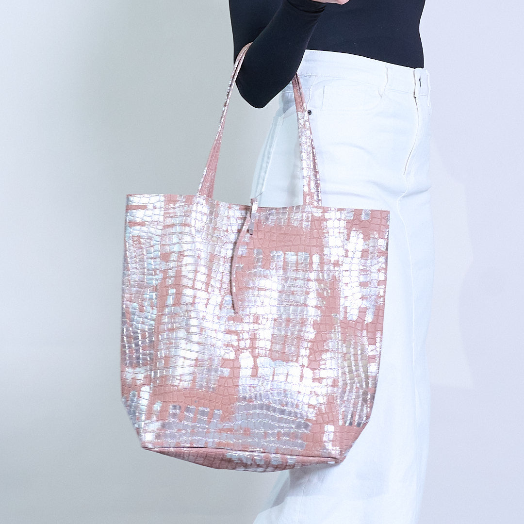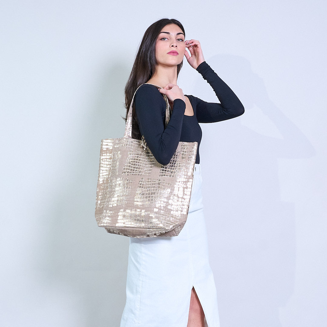 - Crafted ó leathar préimhe le bailchríoch sleek croc-uigeach agus sheen mhiotalach trom