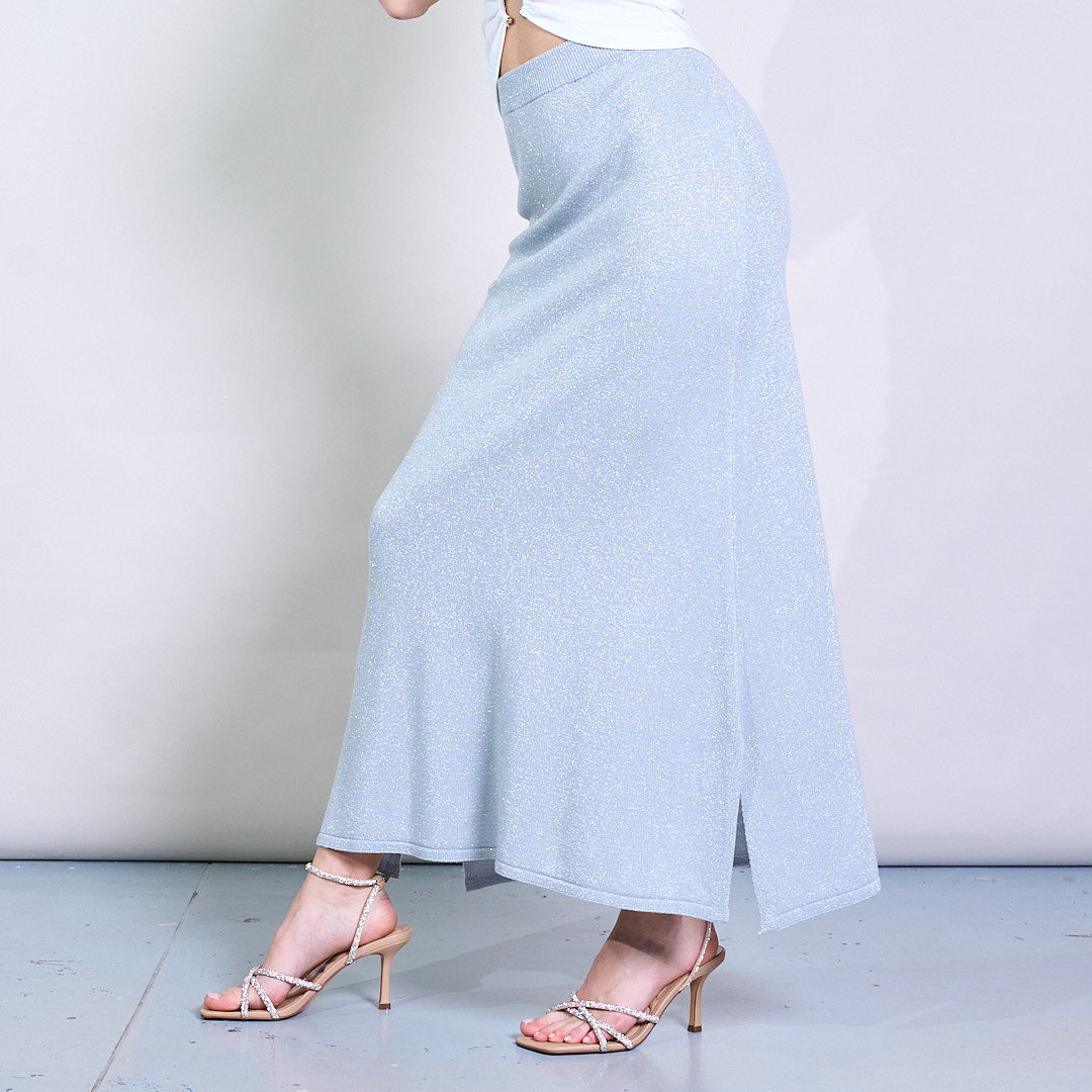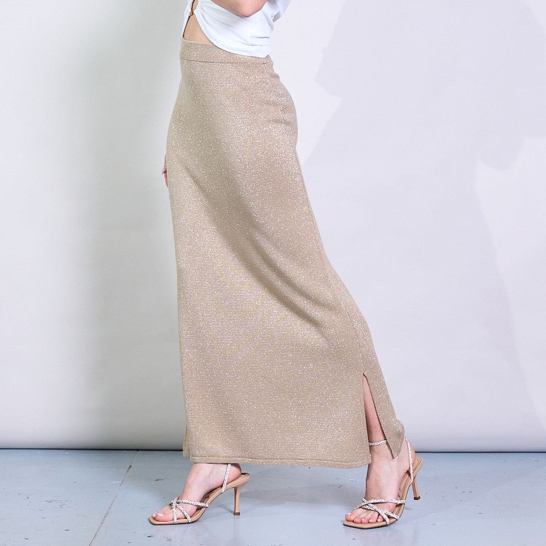 - Sciorta midi cniotáilte sleek le bailchríoch subtle shimmer