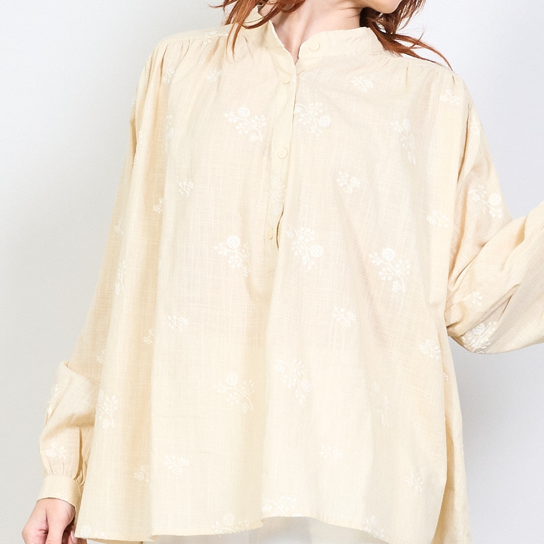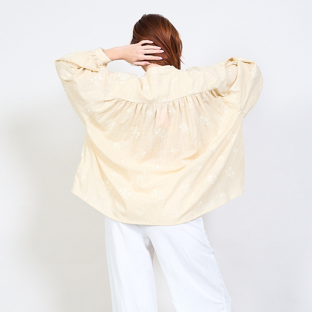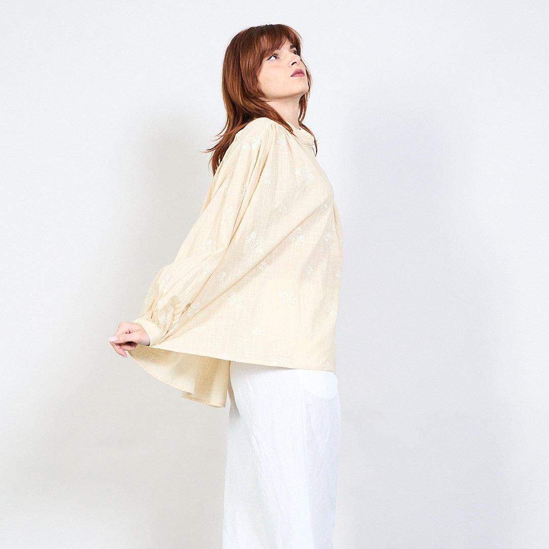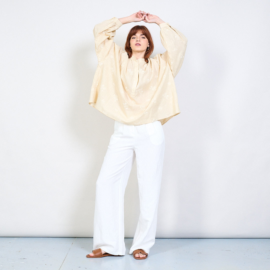 Blús V-muineál Floral bróidnithe le mórdhíola gualainn pleated