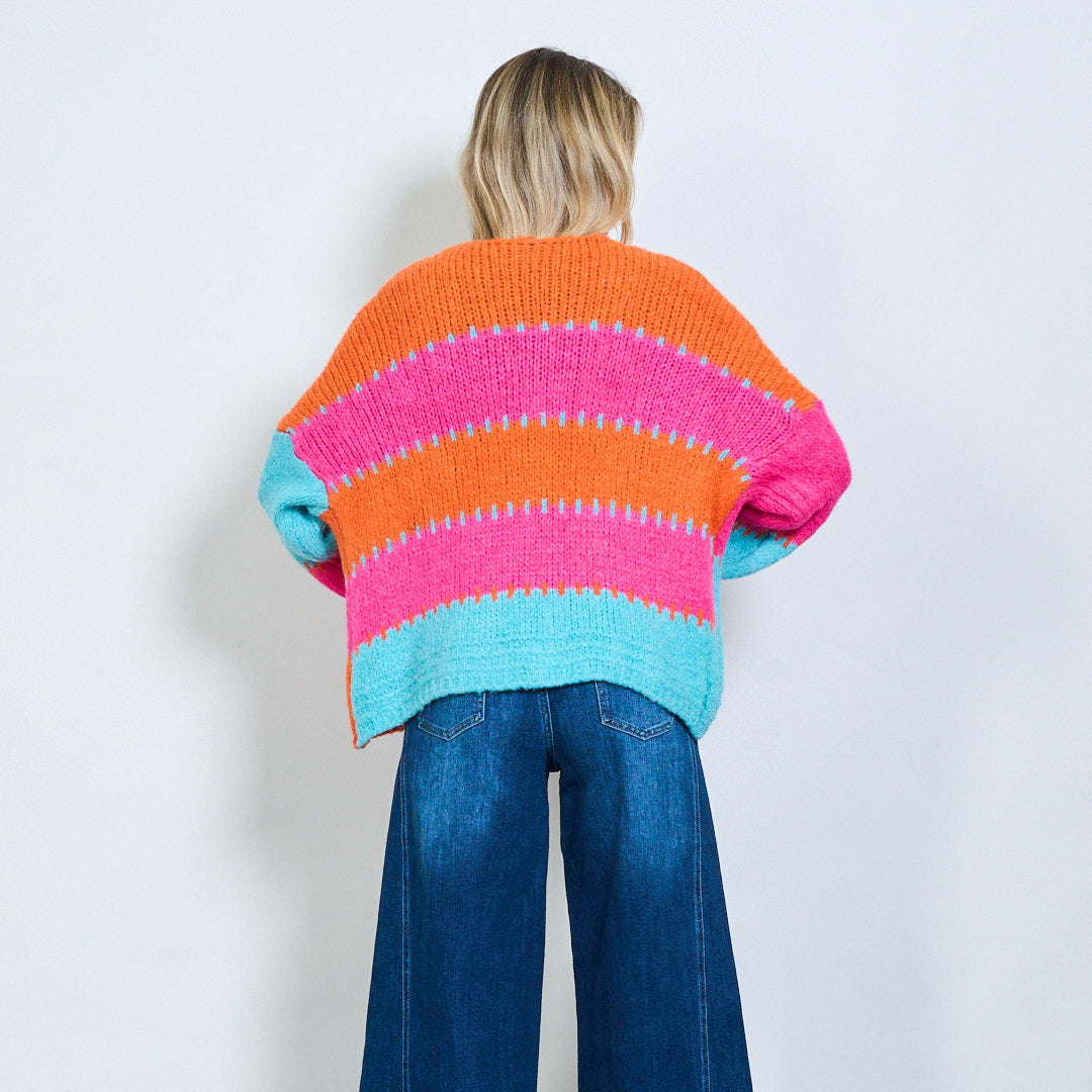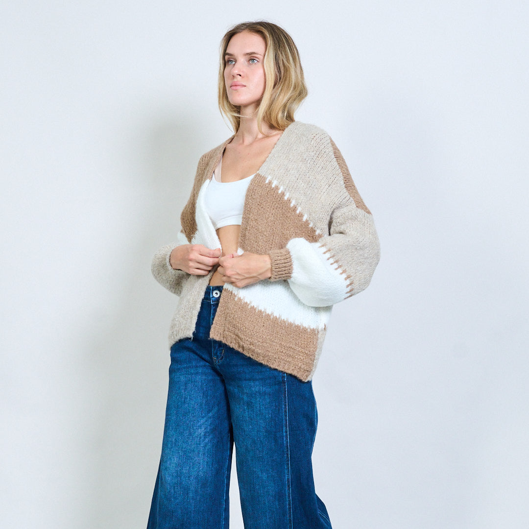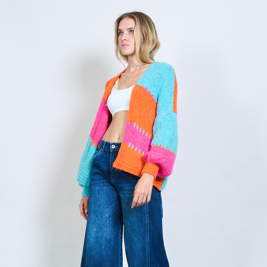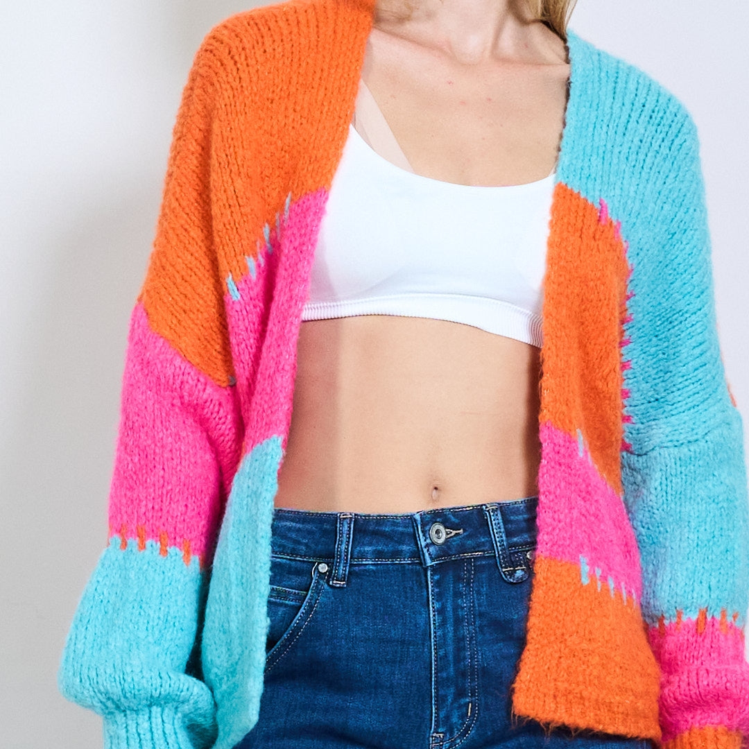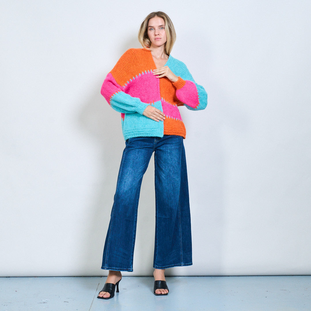 Cardigan tosaigh cniotáilte oscailte cniotáilte le dearadh bloc dath trom mórdhíola mórdhíola