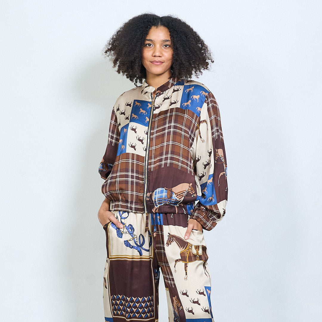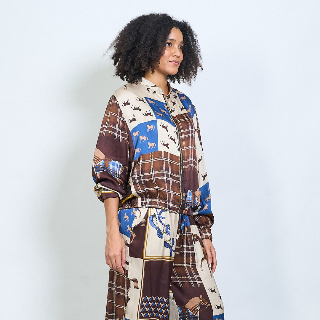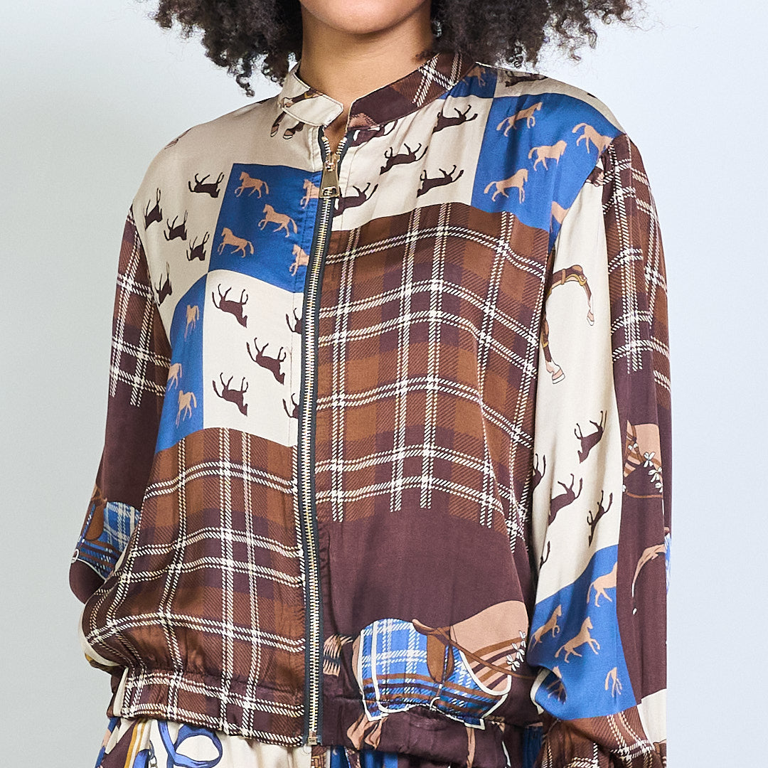Priontáil Eachaíochta Patchwork Priontáil Jacket Zip-Up Satin