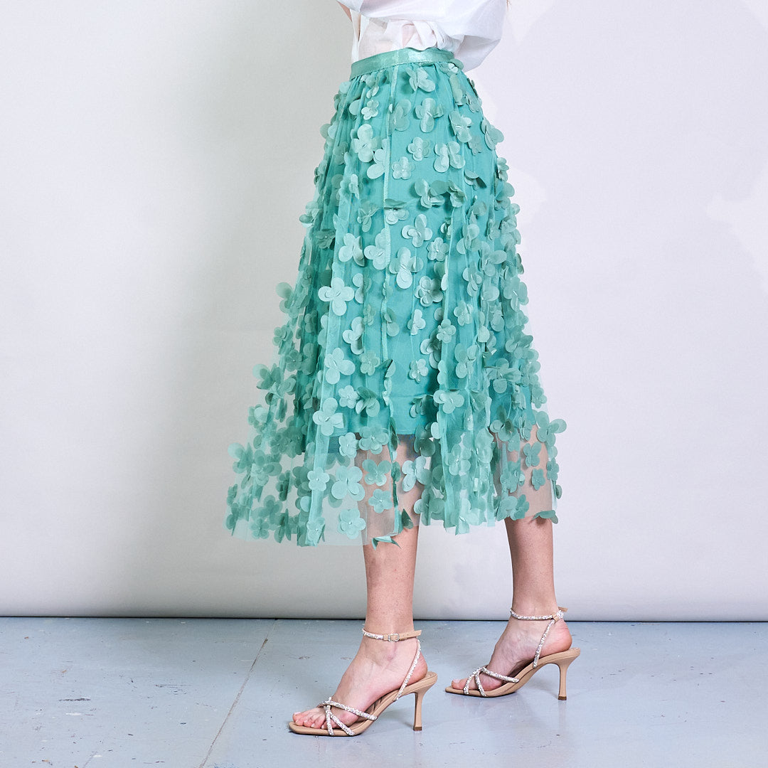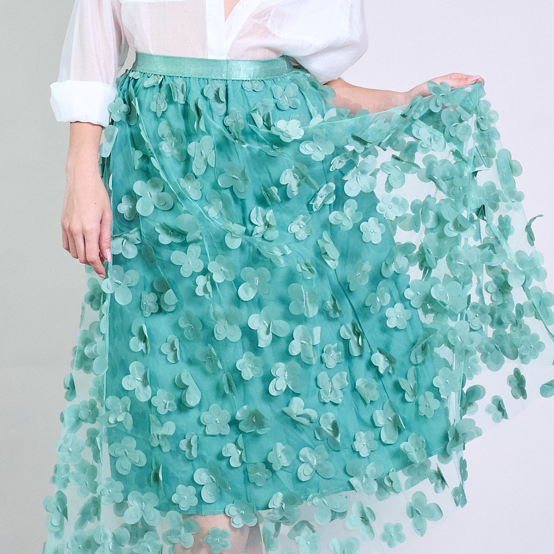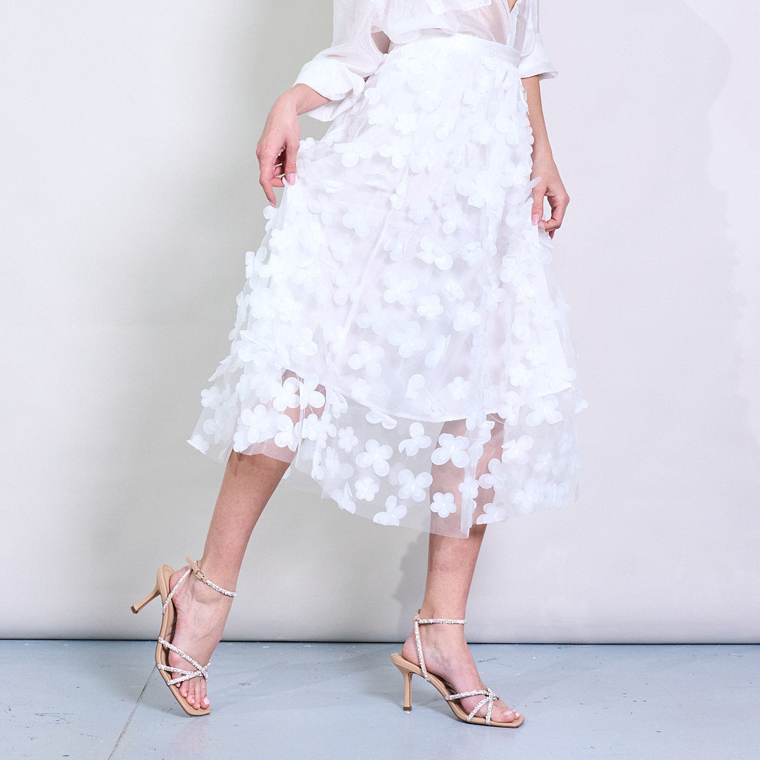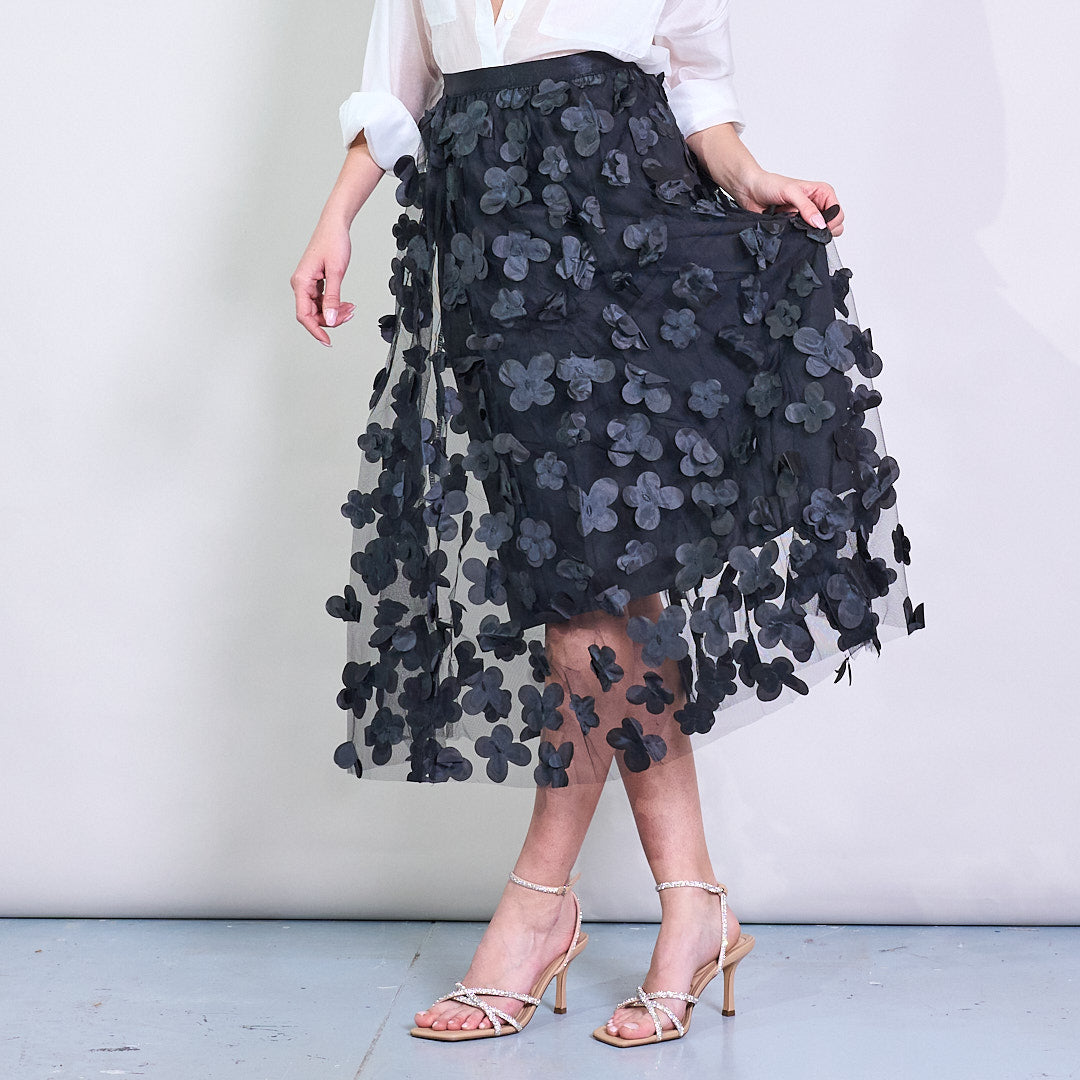 - Sciorta midi mogalra galánta le appliqués bláthanna 3D le haghaidh teagmháil whimsical