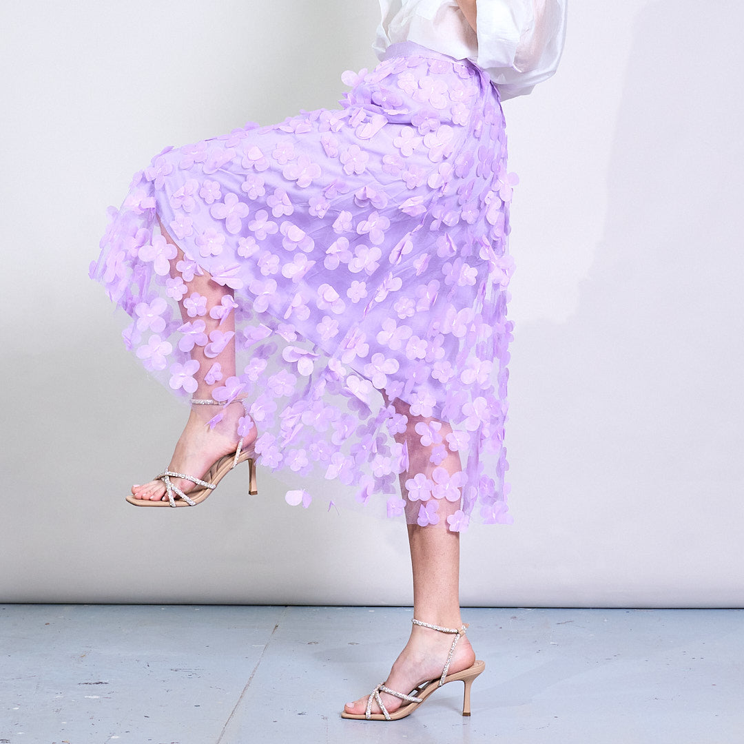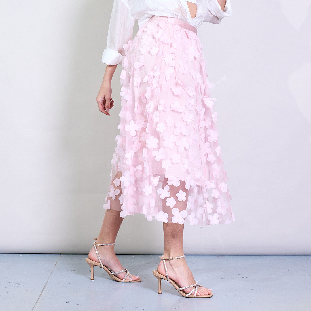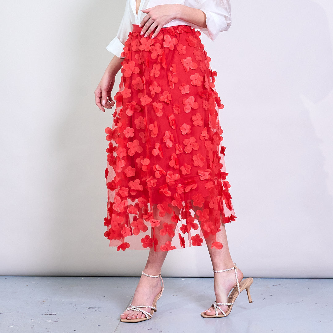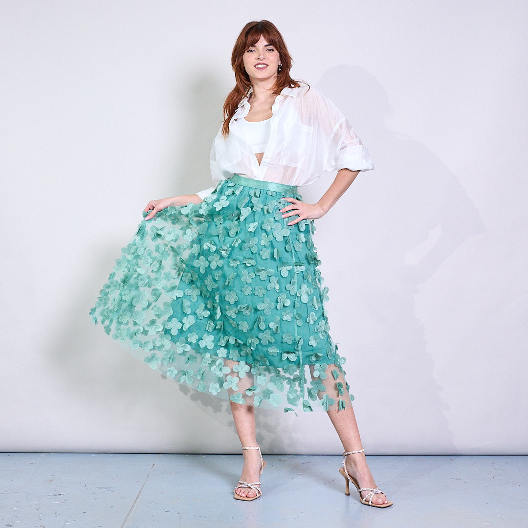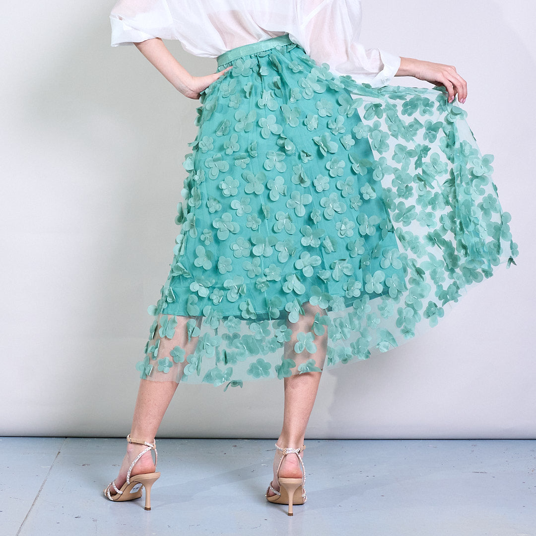 - Sciorta midi mogalra galánta le appliqués bláthanna 3D le haghaidh teagmháil whimsical