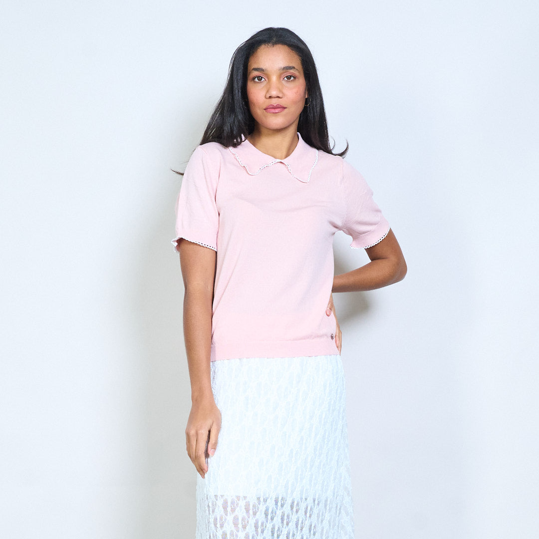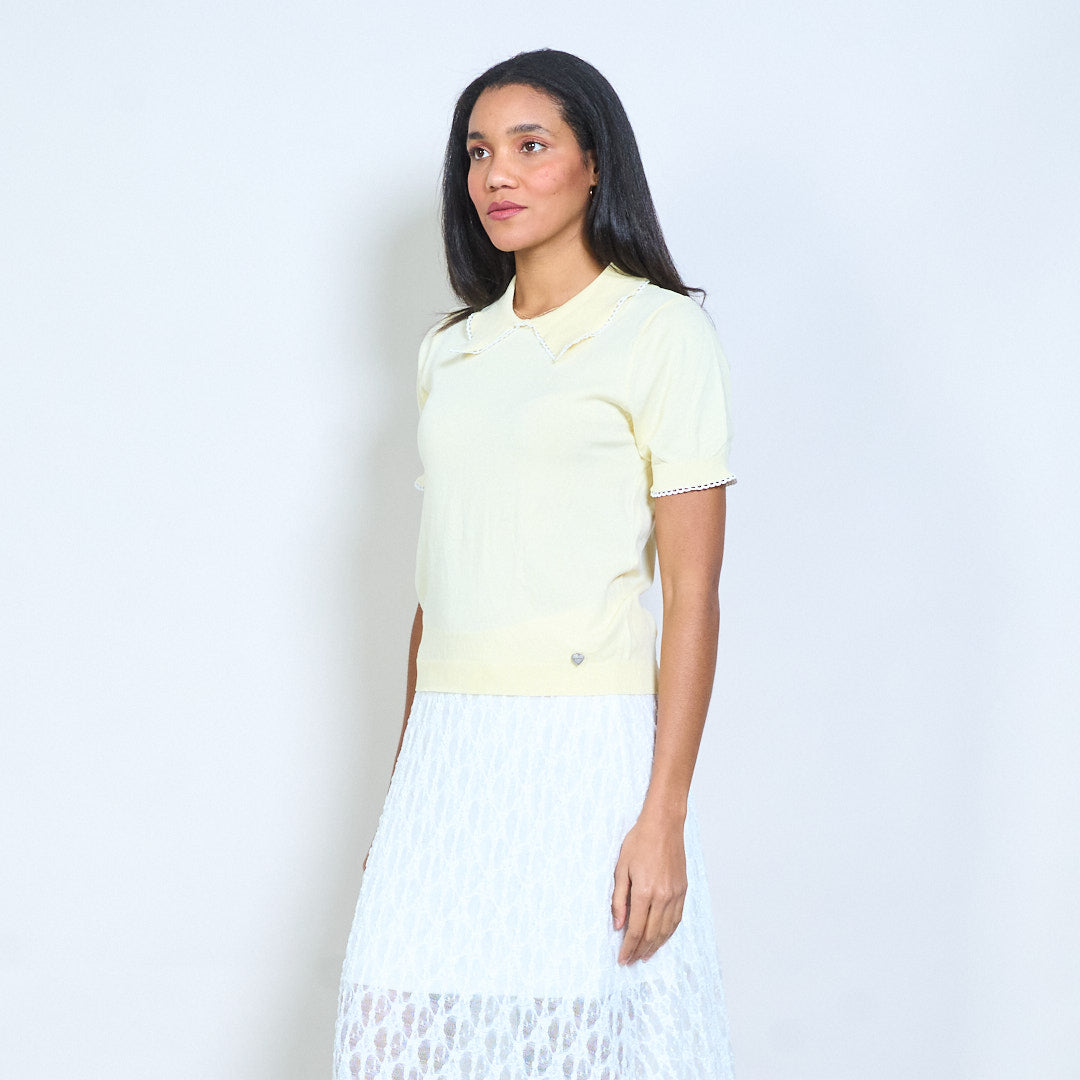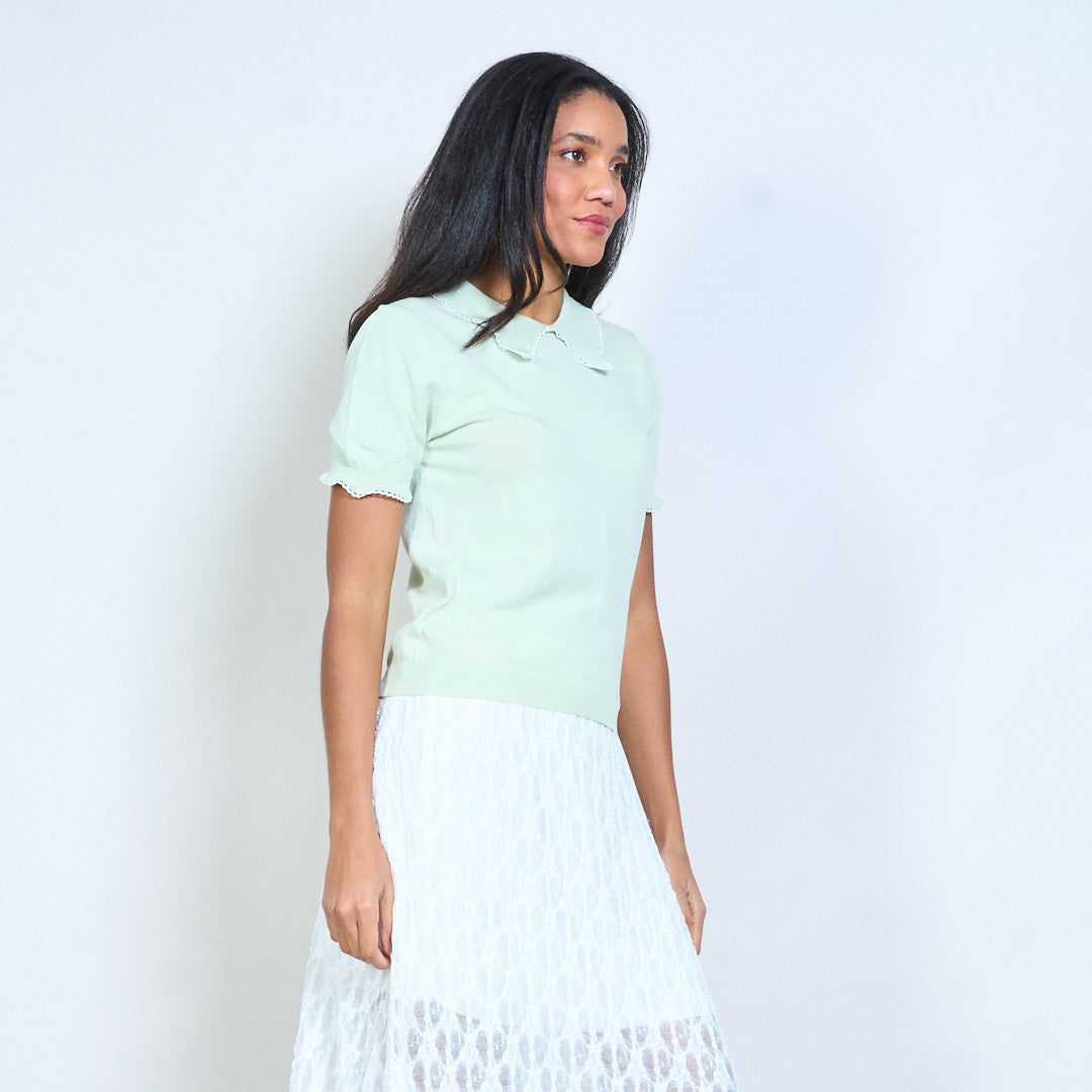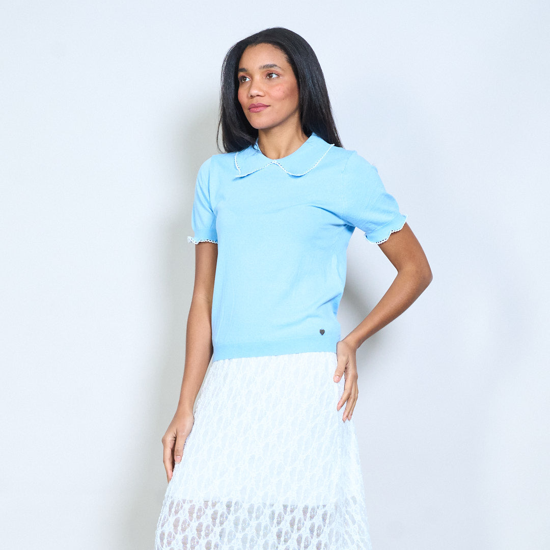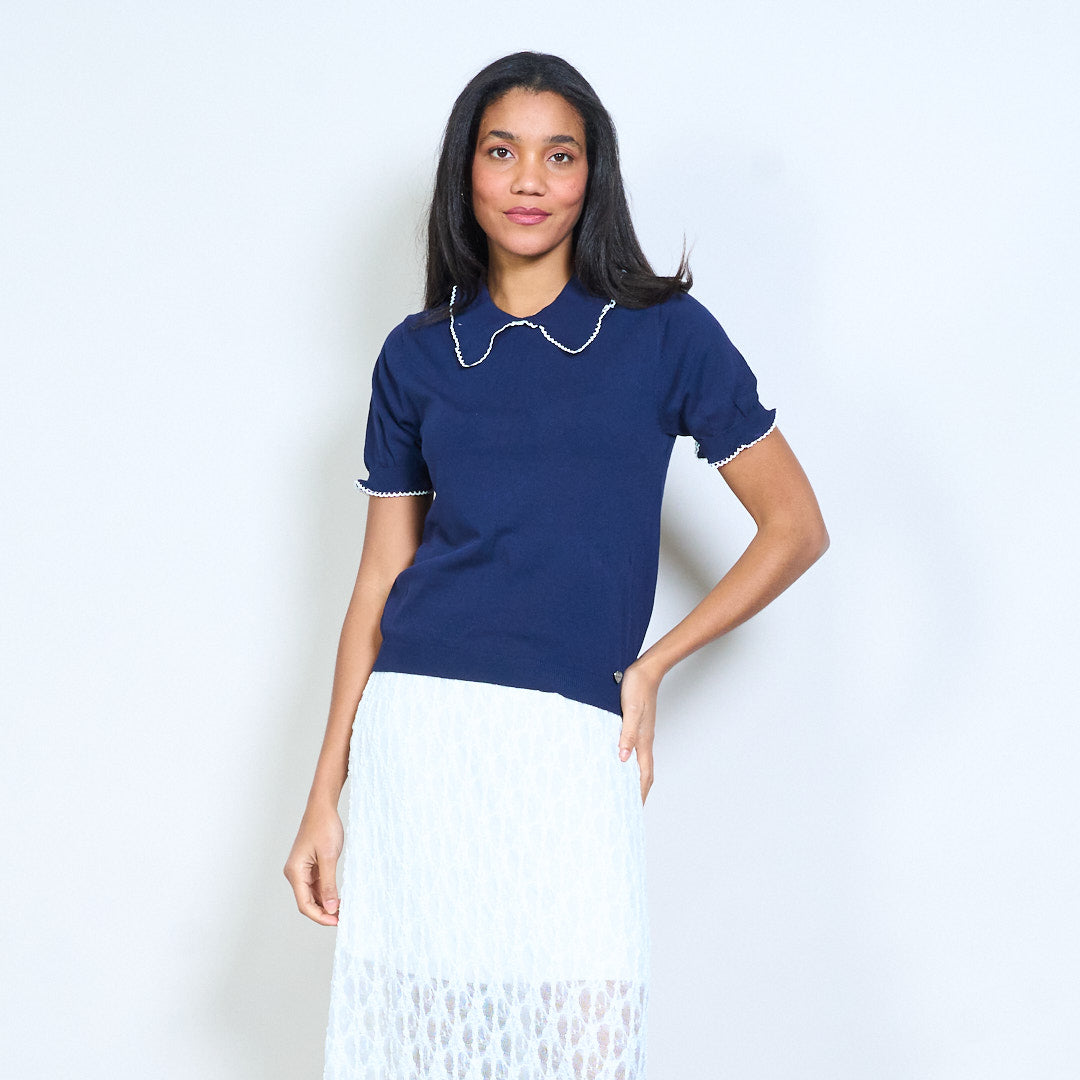 Barr cniotáilte le muinchille gearr le coiléar scalloped mionsonraí mórdhíola