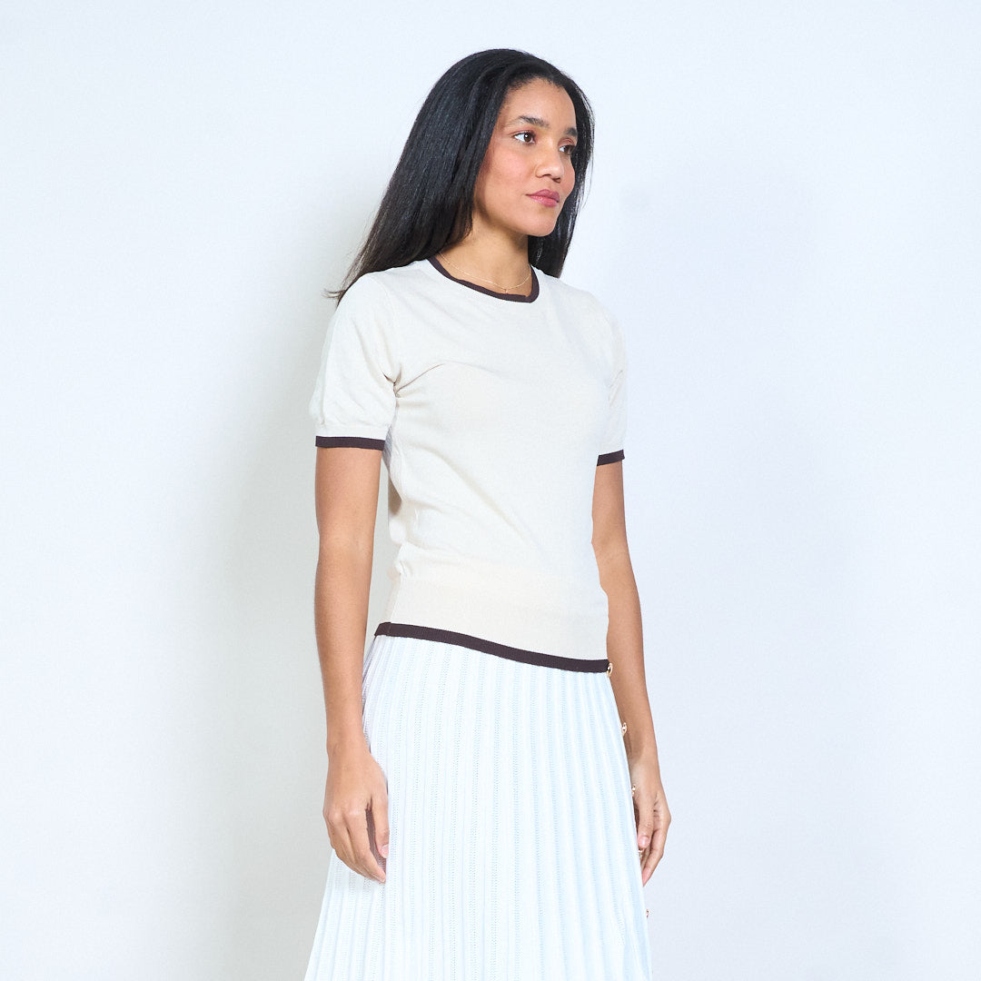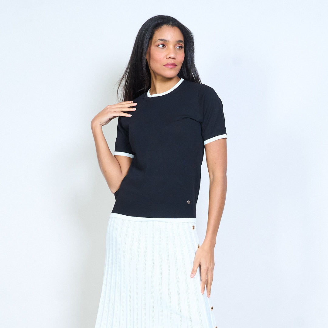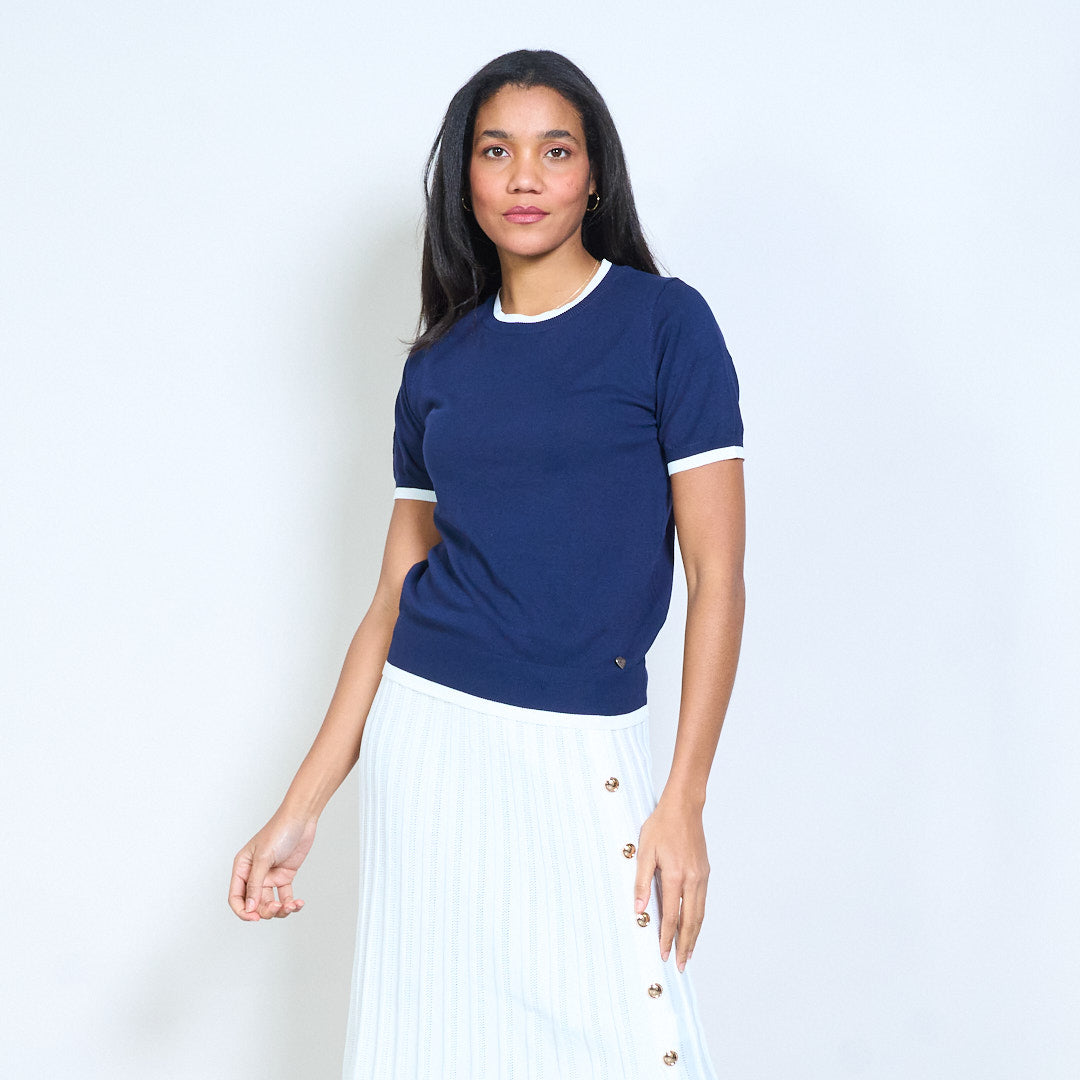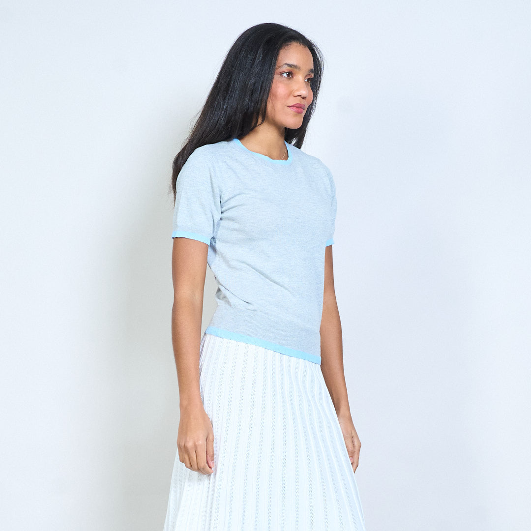 Mullach cniotáilte le muinchille gearr le mionsonraí mórdhíola Baile Átha Troim codarsnachta