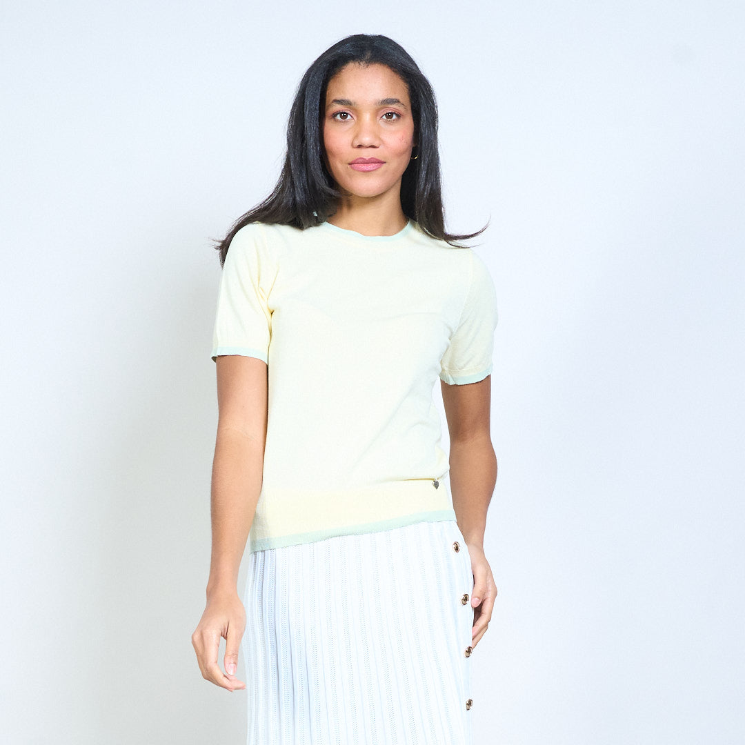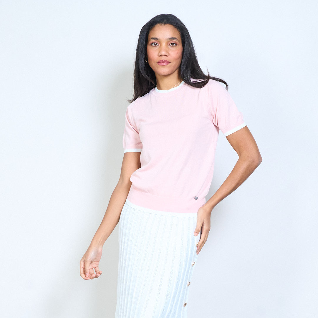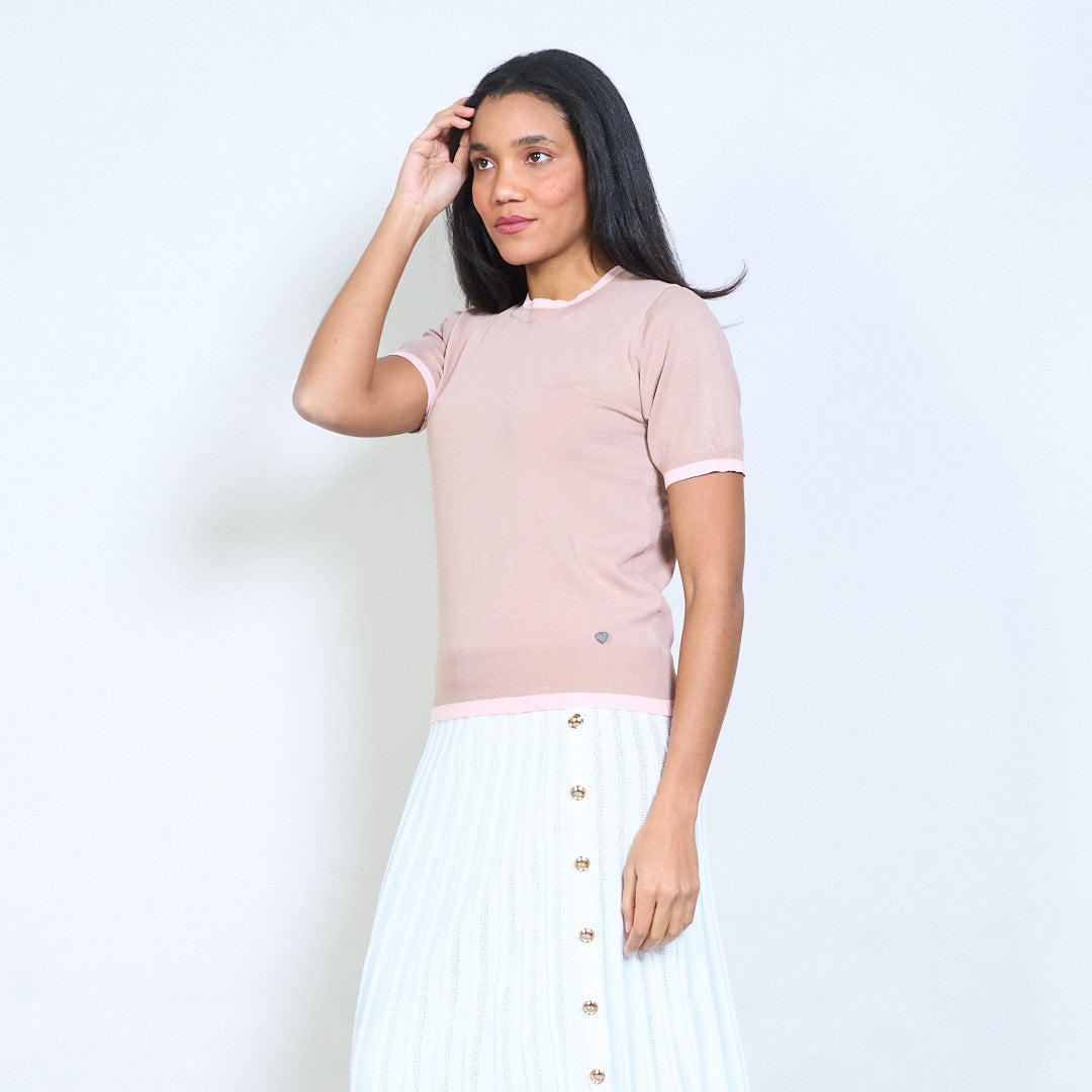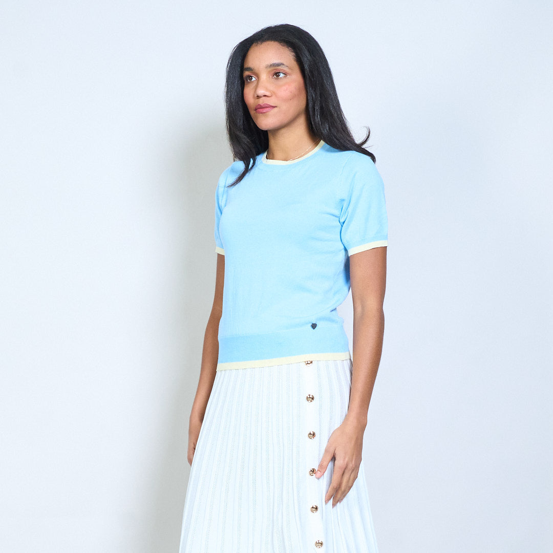 Mullach cniotáilte le muinchille gearr le mionsonraí mórdhíola Baile Átha Troim codarsnachta
