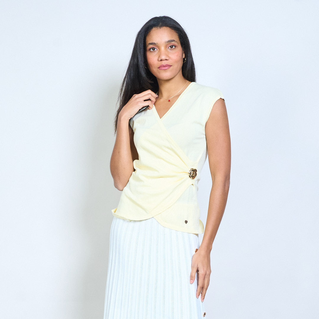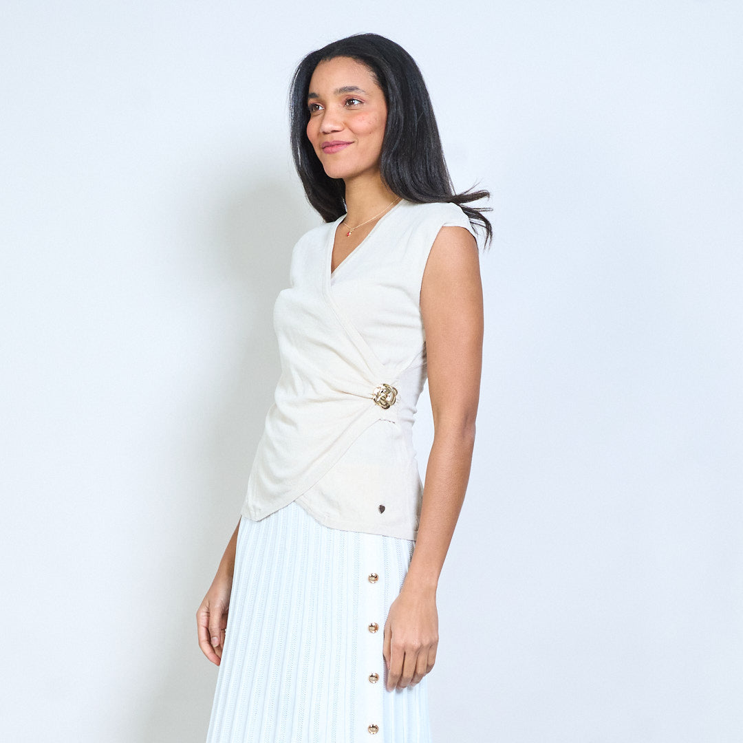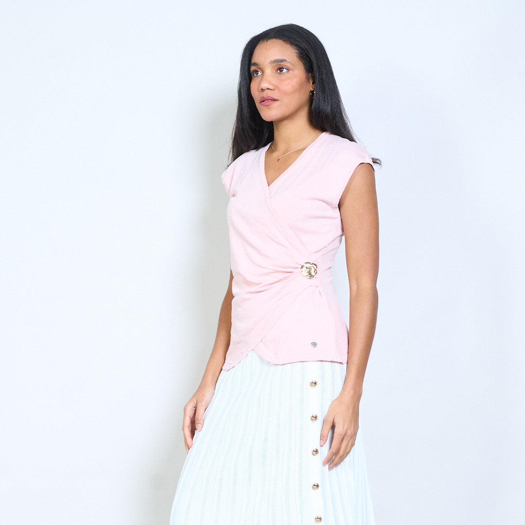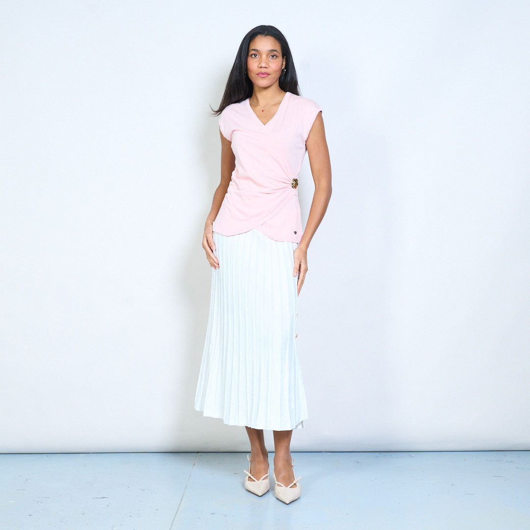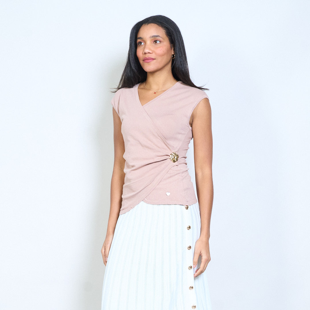 - Barr cniotáilte deartha le tosaigh fillte-stíl agus neckline V domhain