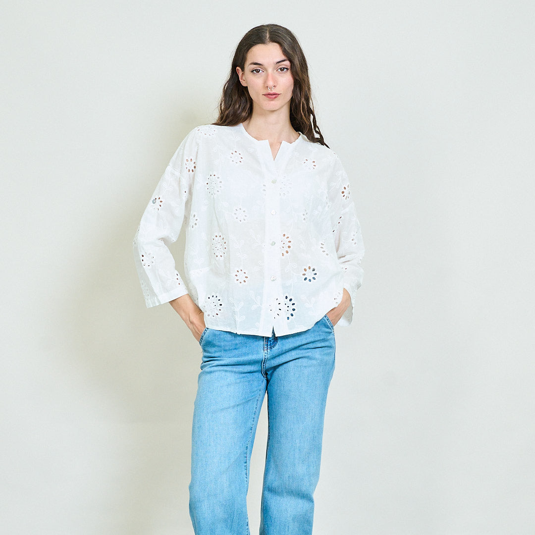 Bróidnéireacht Eyelet Floral Cnaipe Neamhshiméadrach Blouse Blouse Mórdhíola Mórdhíola