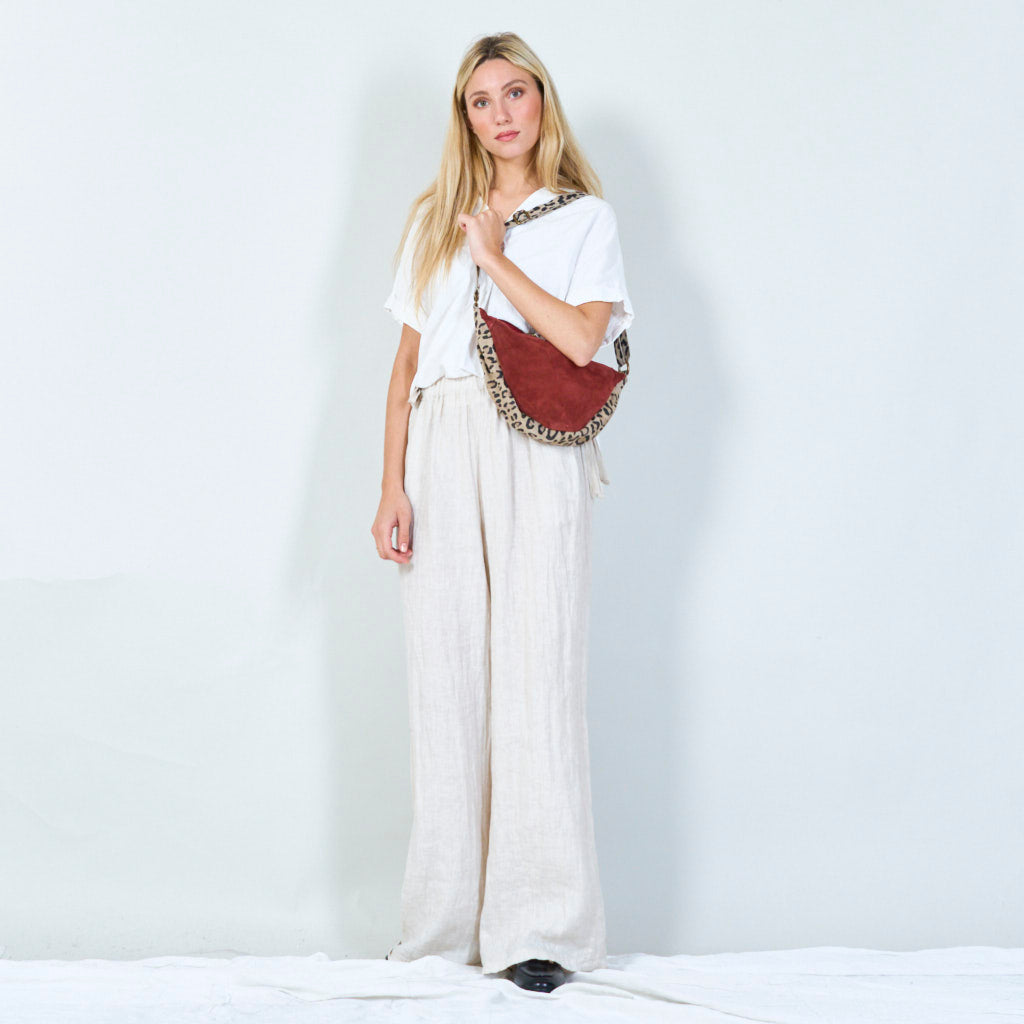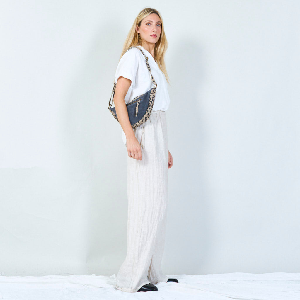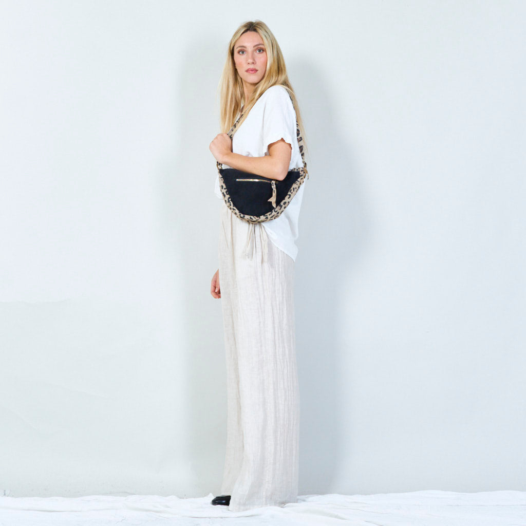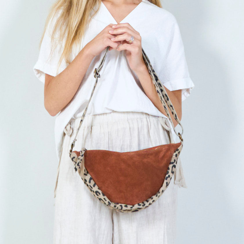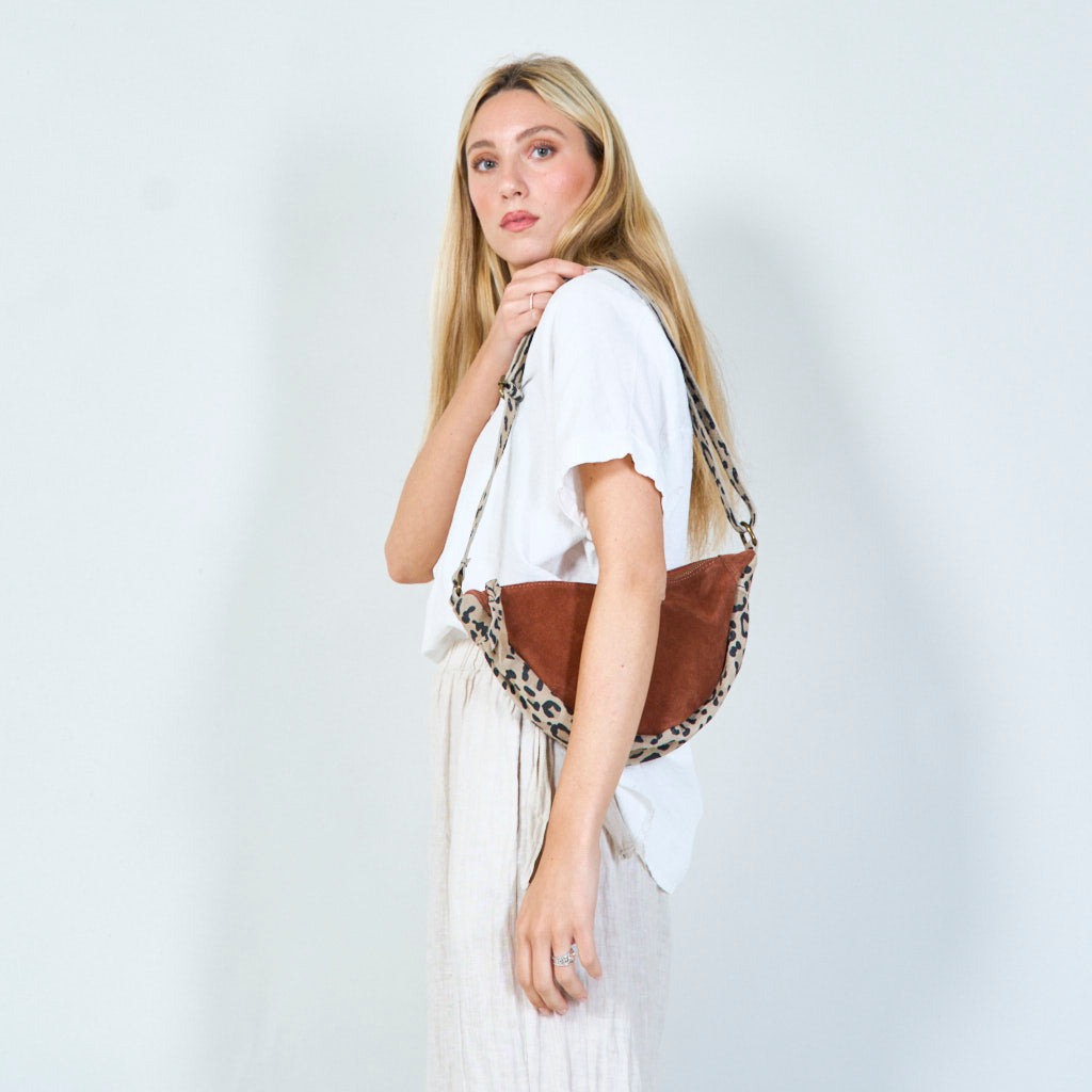• Meascán uathúil de chanbhás suede agus cló liopard