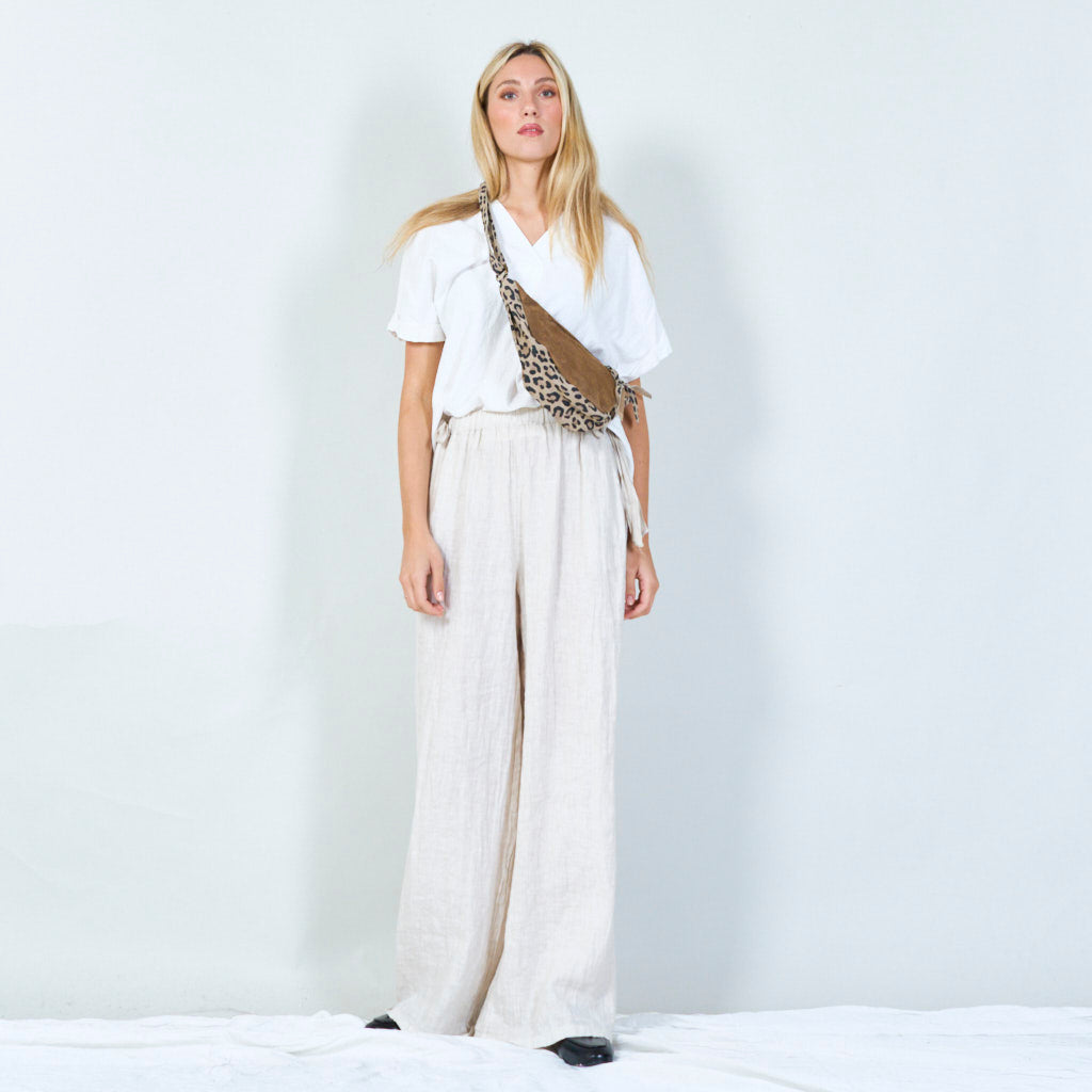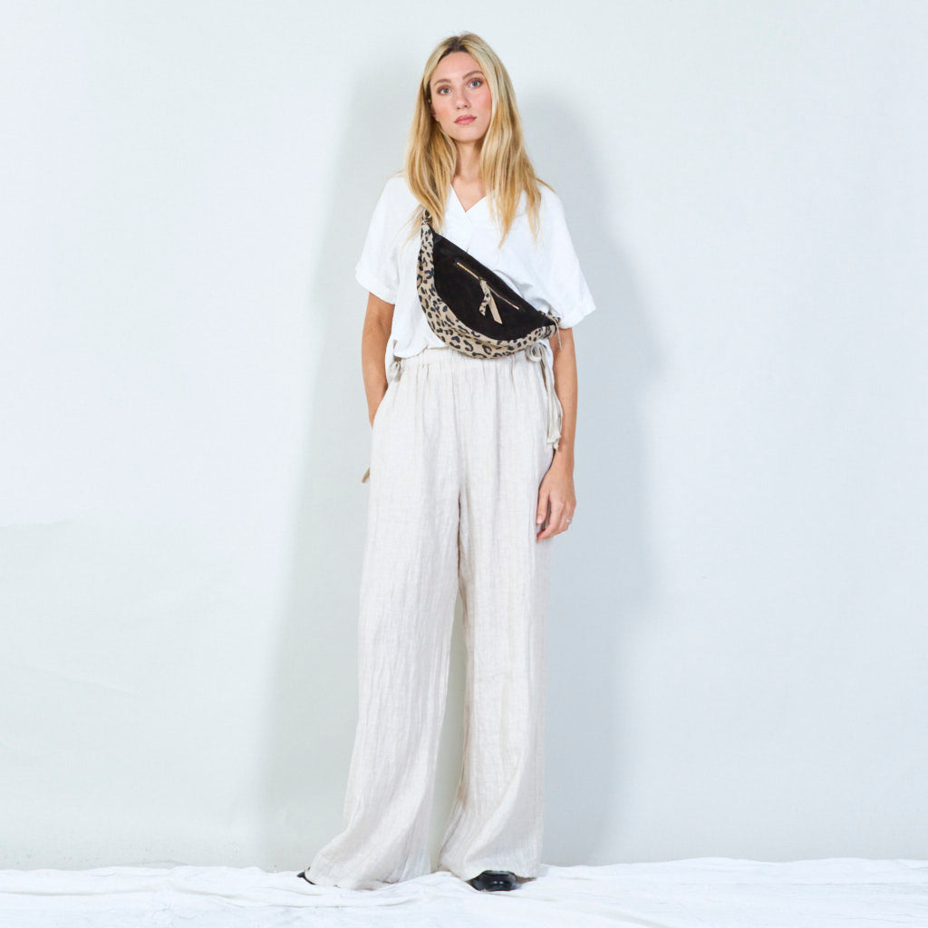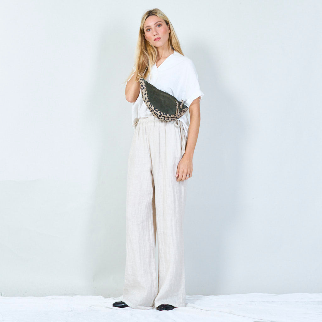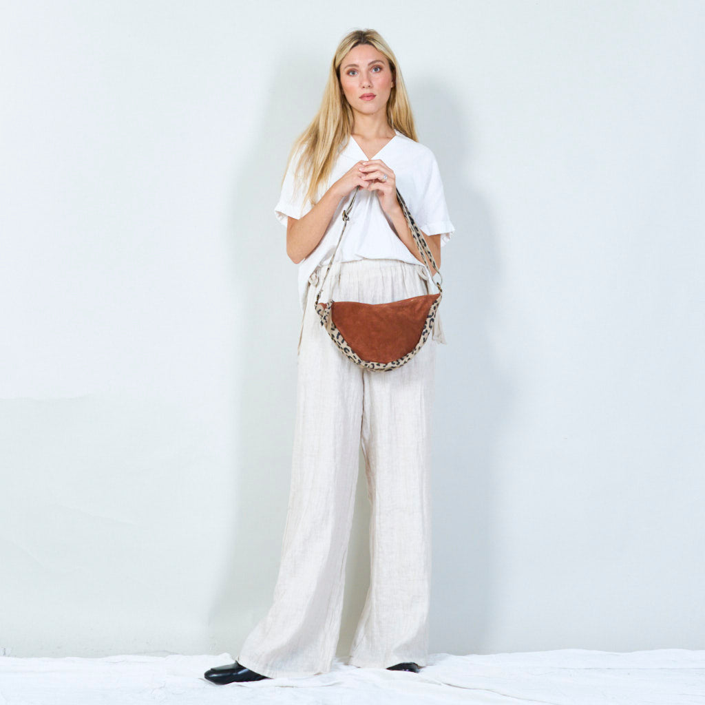 • Meascán uathúil de chanbhás suede agus cló liopard