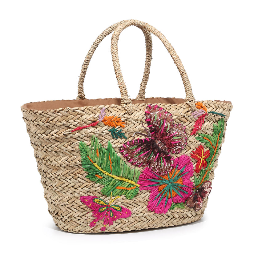 Féileacán trópaiceach trópaiceach agus mála tuí Floral lámhdhéanta le mionsonraí sequin mórdhíola