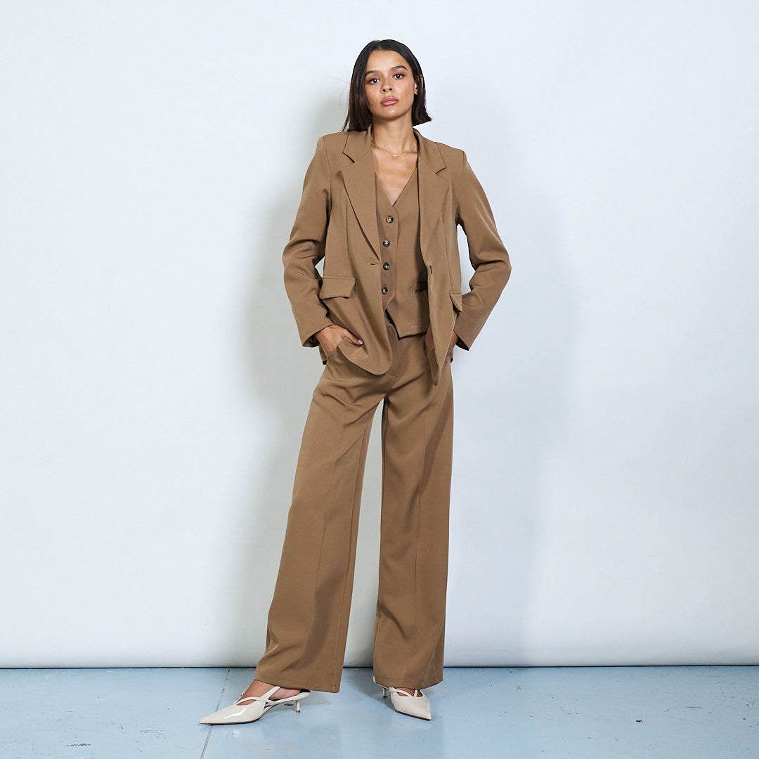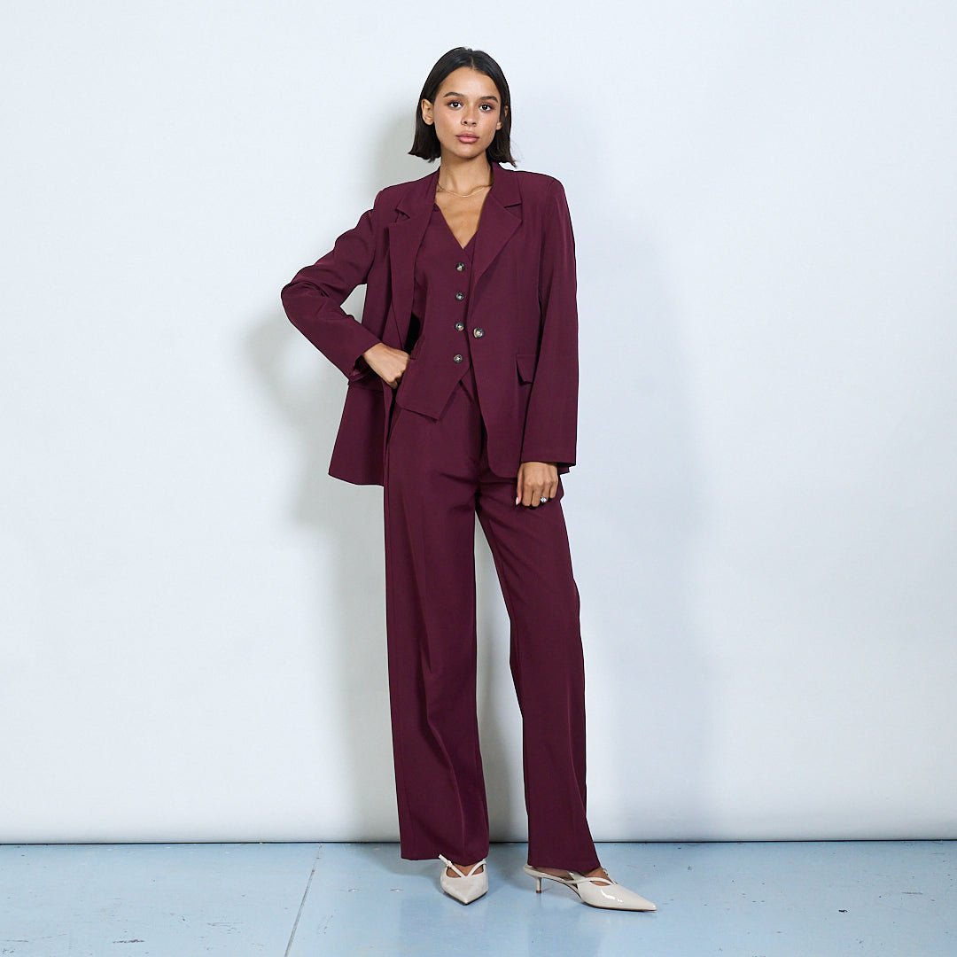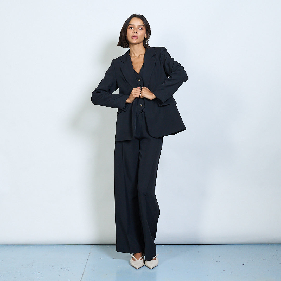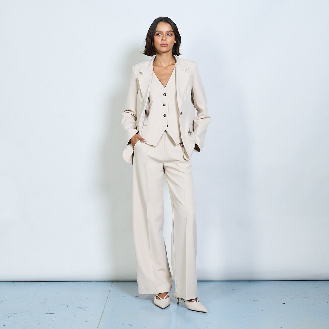 - Sraith oiriúnaithe 3-phíosa galánta lena n-áirítear blazer, vest, agus bríste