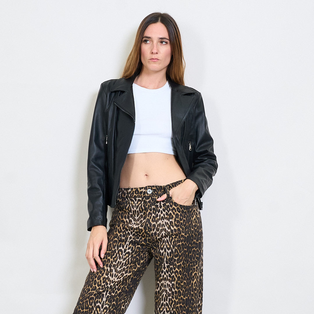 Seaicéad biker leathair feistithe le mórdhíola zip neamhshiméadrach