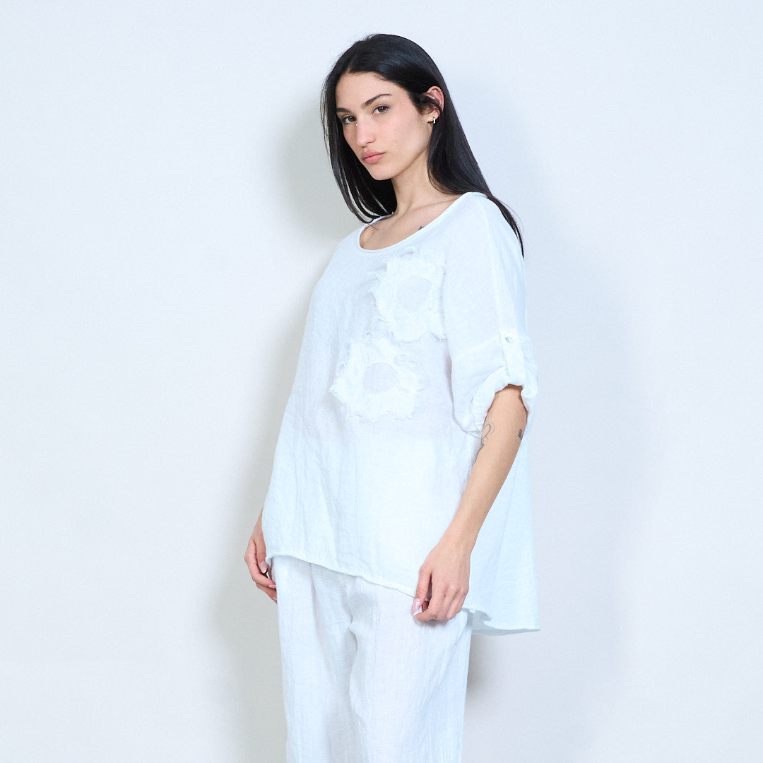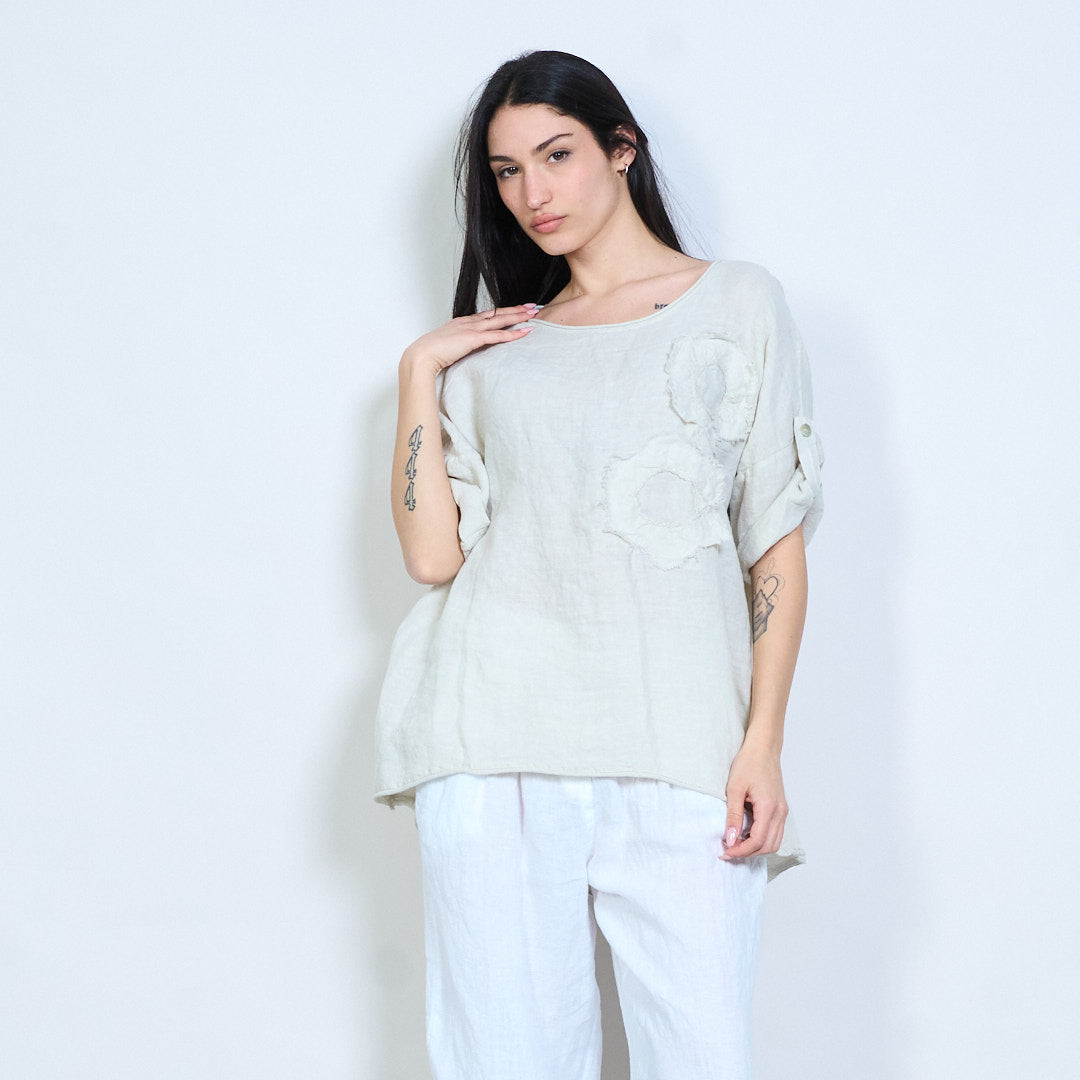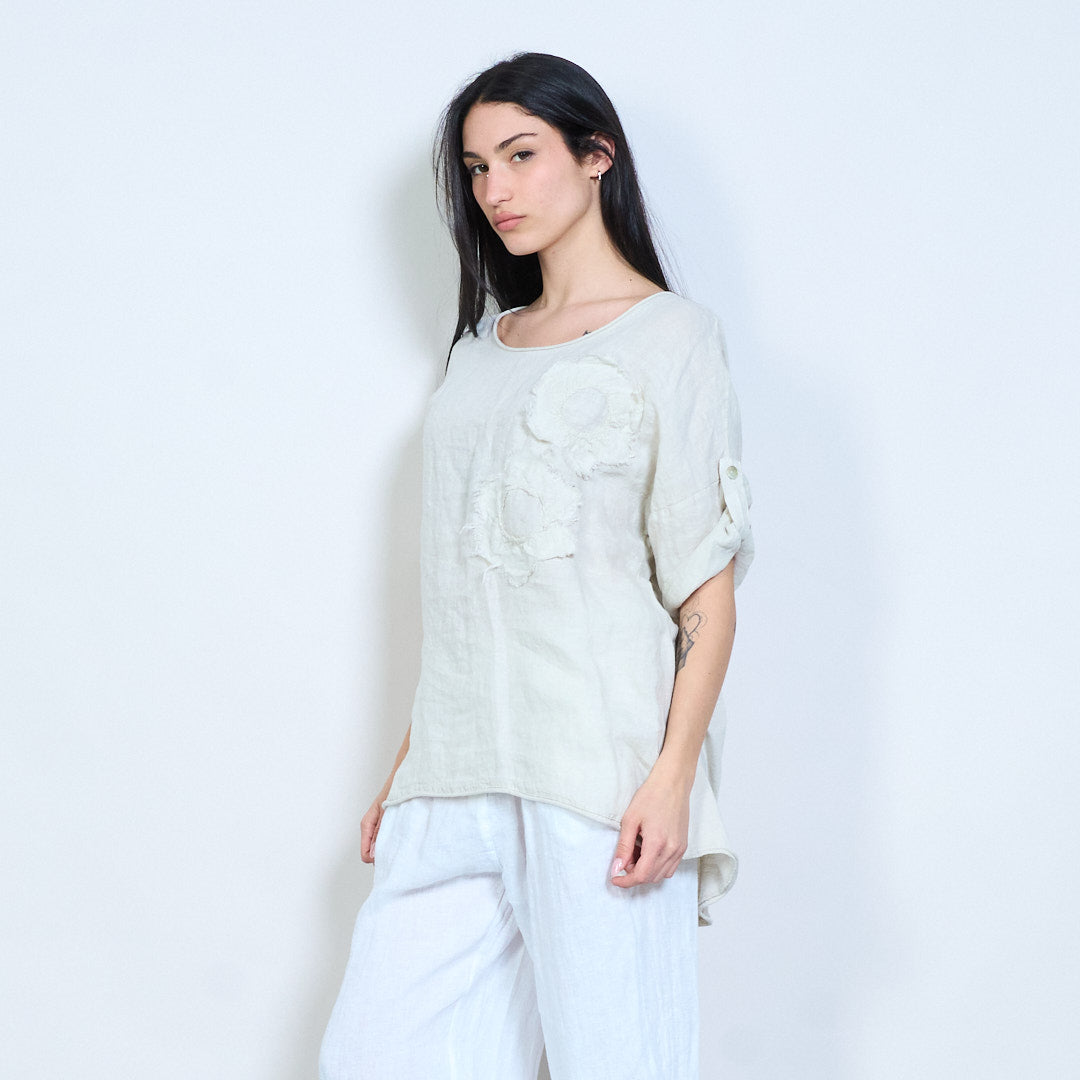Appliqué uigeach bláthanna oiriúnach scaoilte barr sleeve gearr mórdhíola