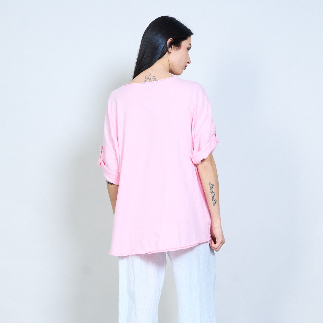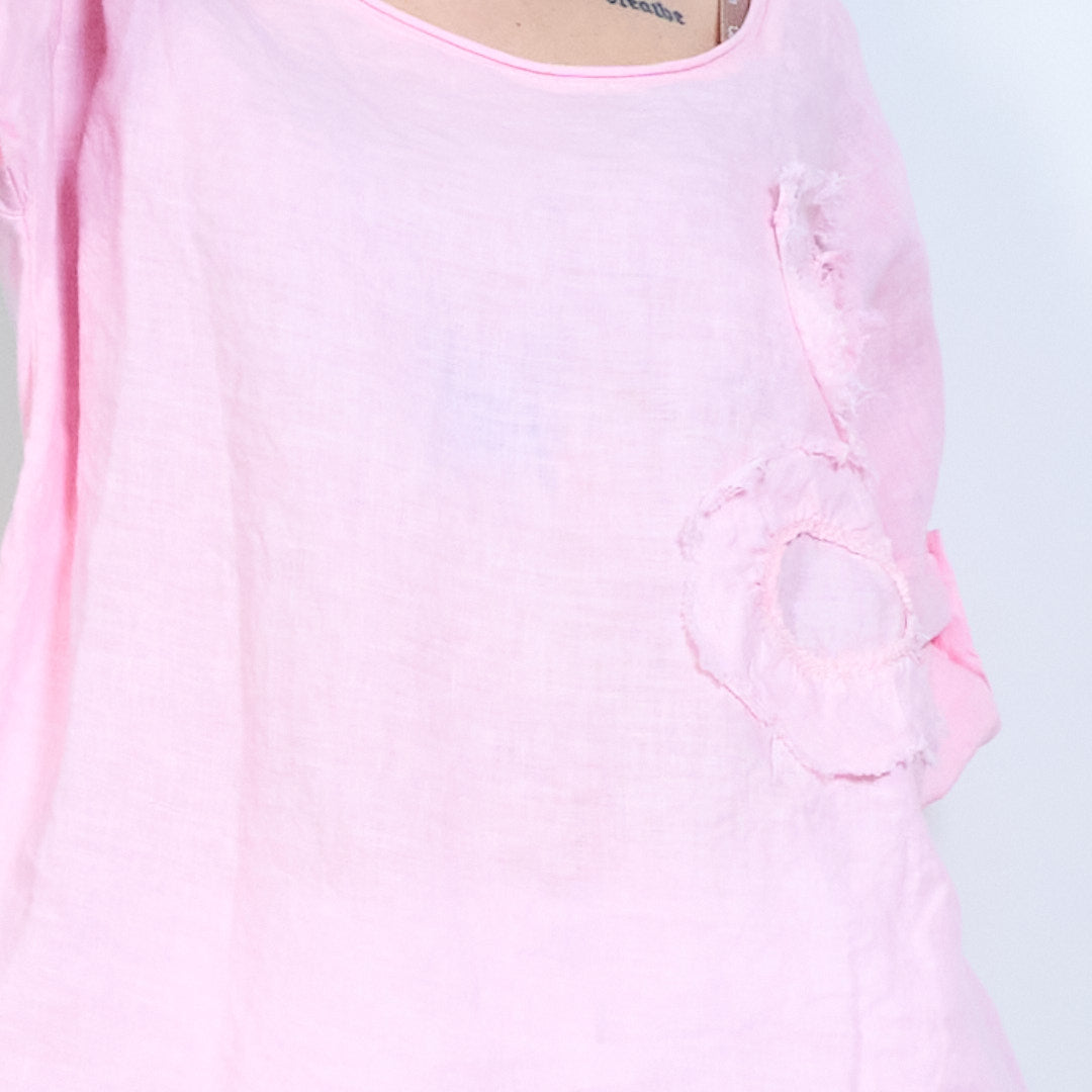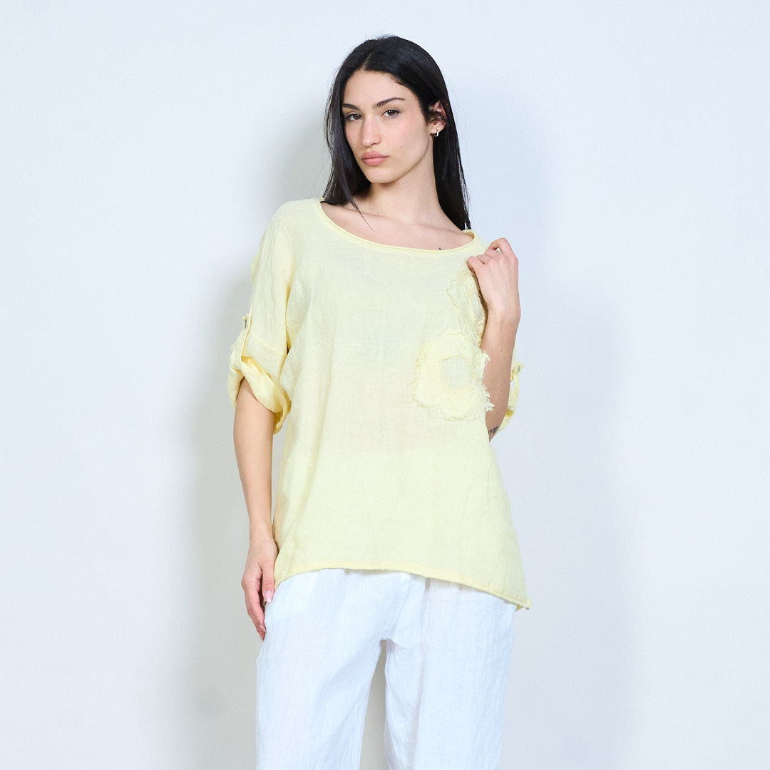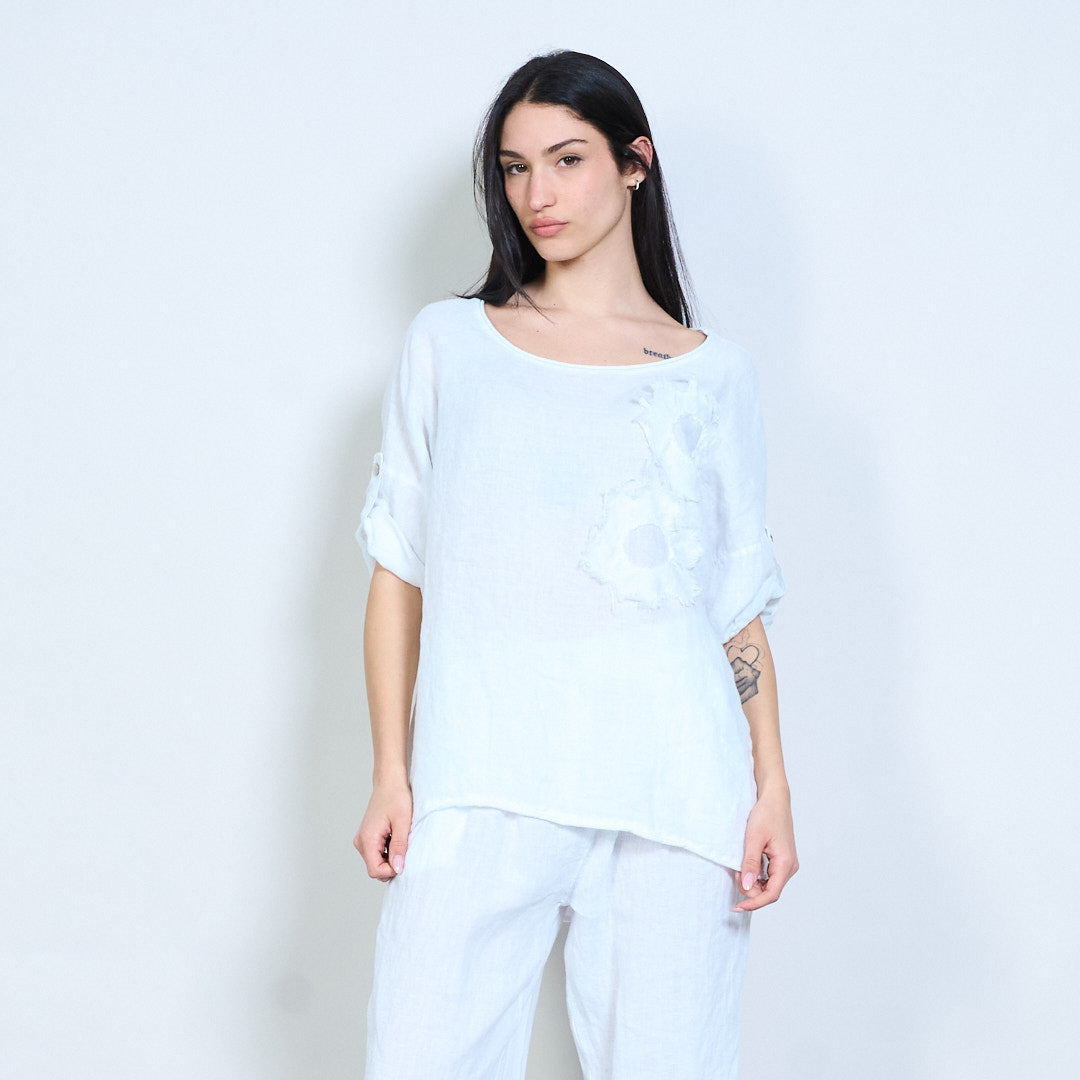 Appliqué uigeach bláthanna oiriúnach scaoilte barr sleeve gearr mórdhíola