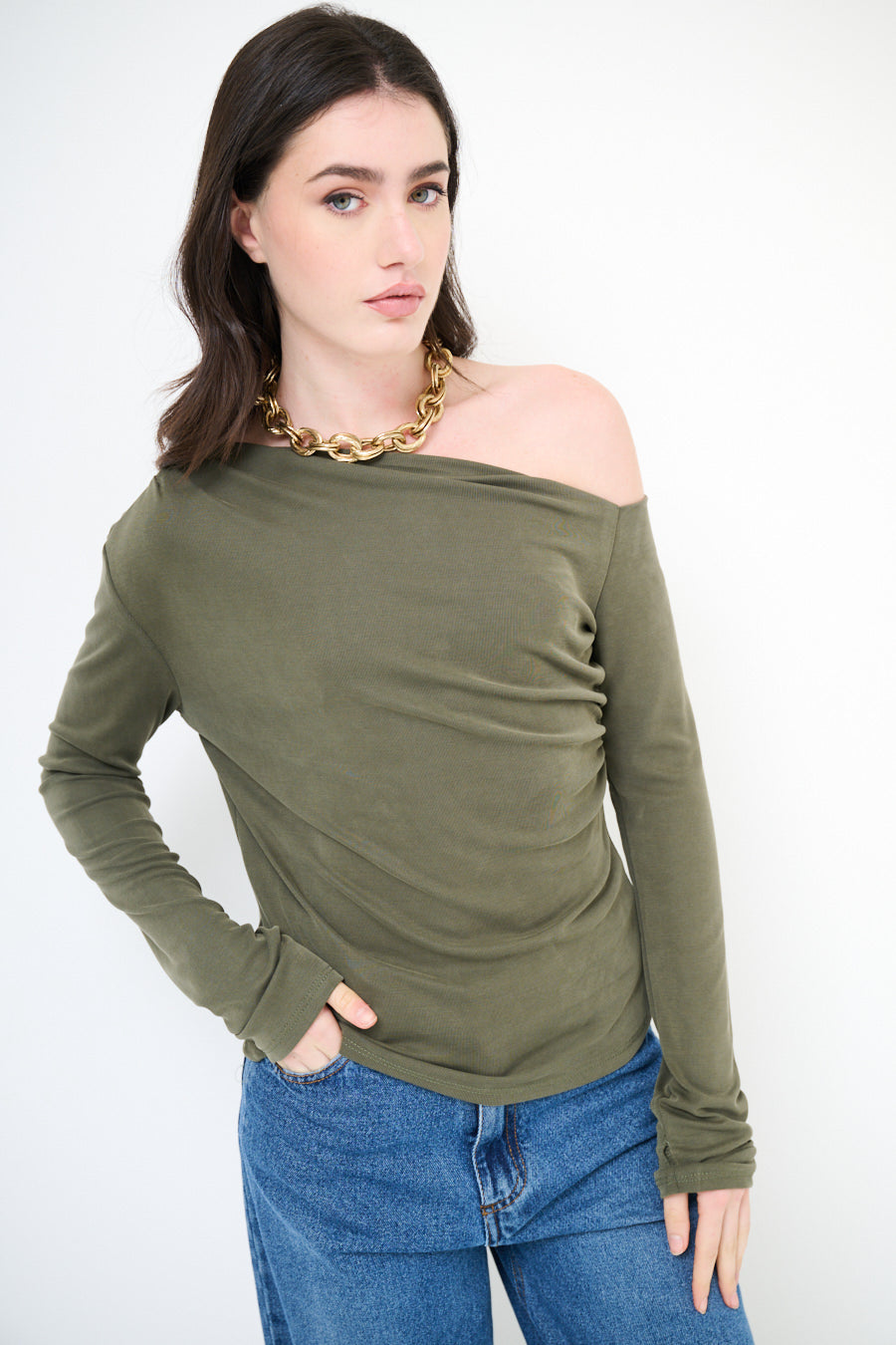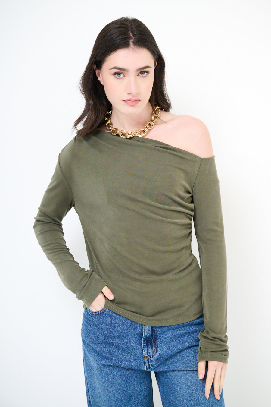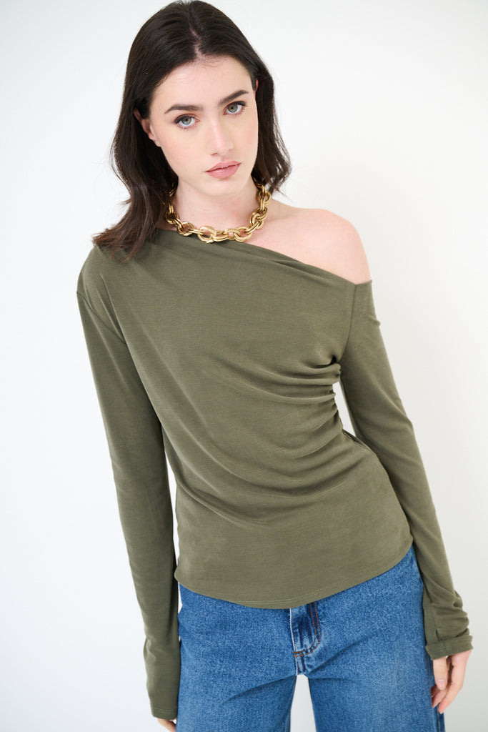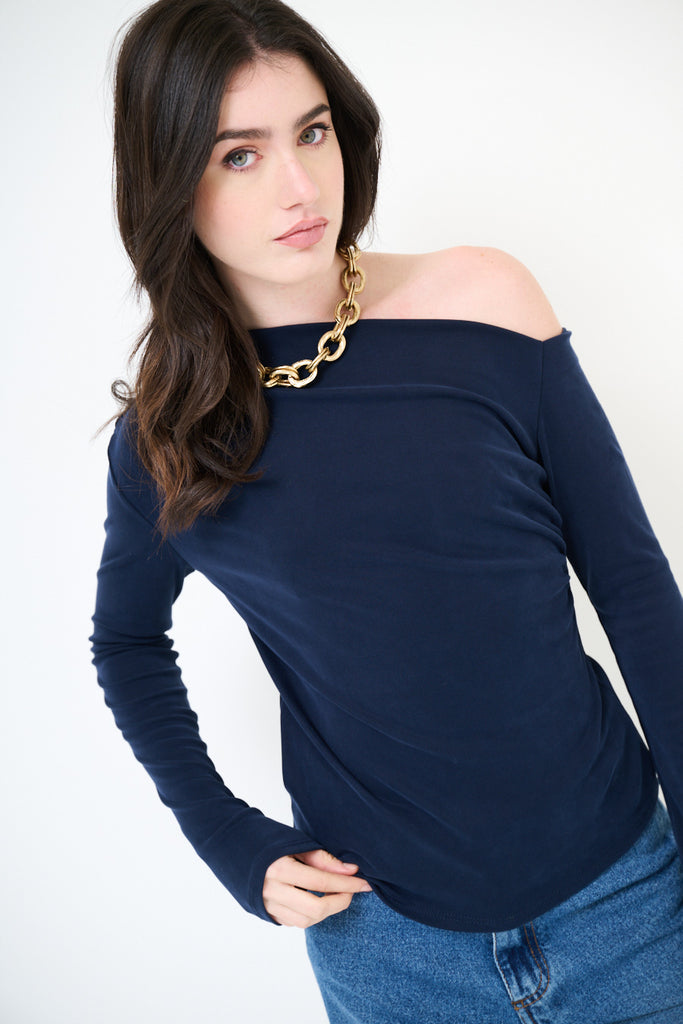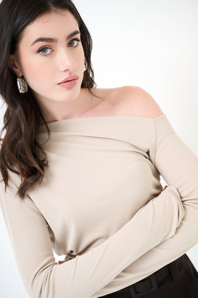 - Cuireann neckline lasmuigh den ghualainn teagmháil baininscneach galánta agus nua-aimseartha