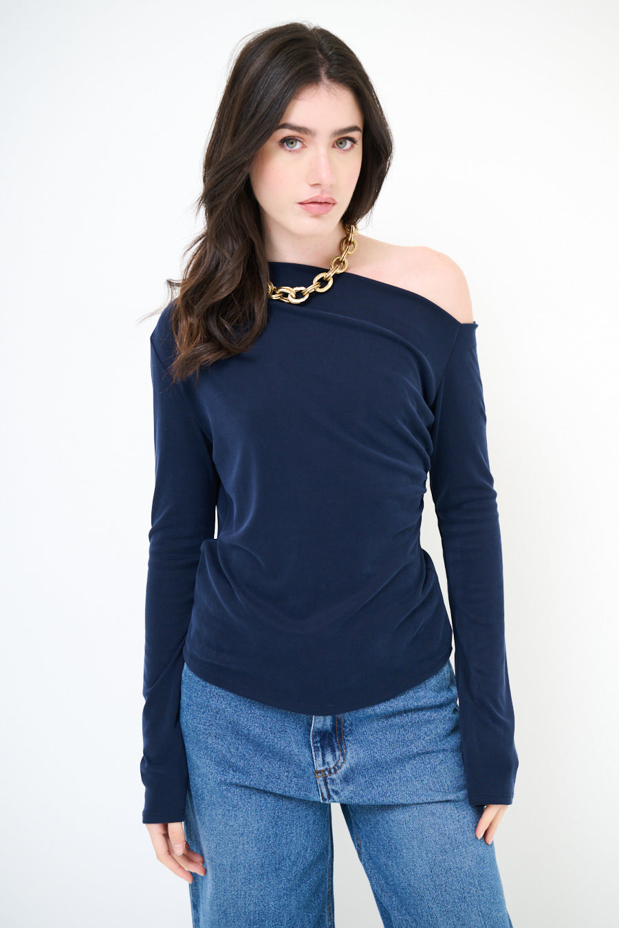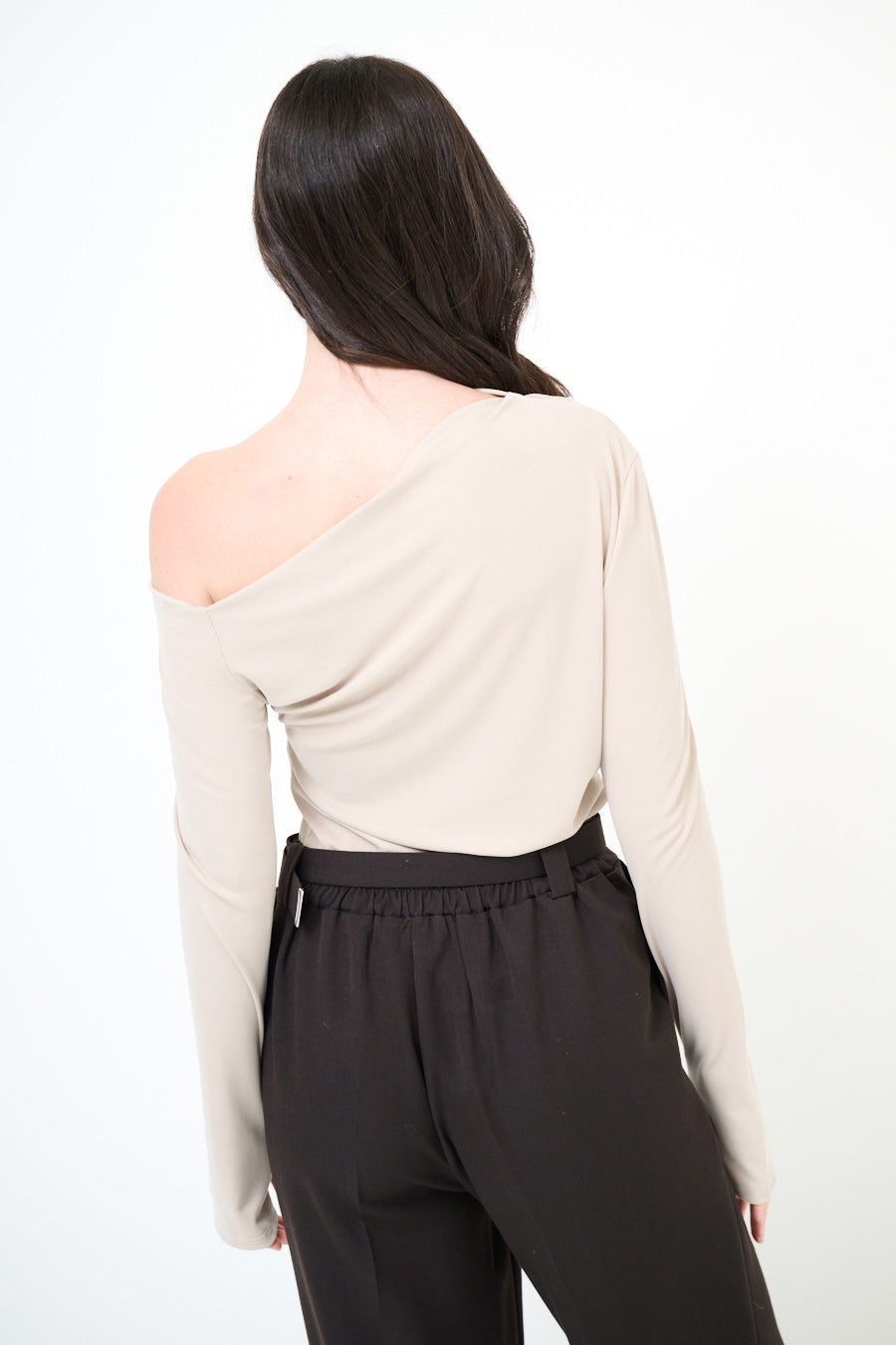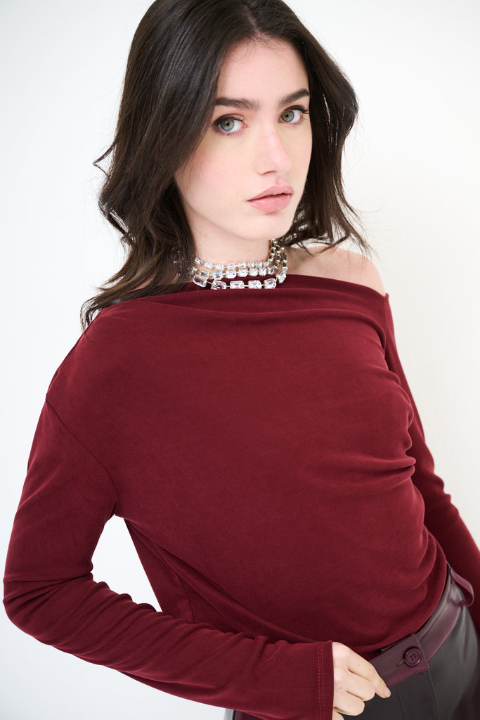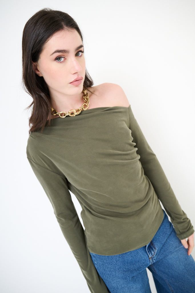 - Cuireann neckline lasmuigh den ghualainn teagmháil baininscneach galánta agus nua-aimseartha