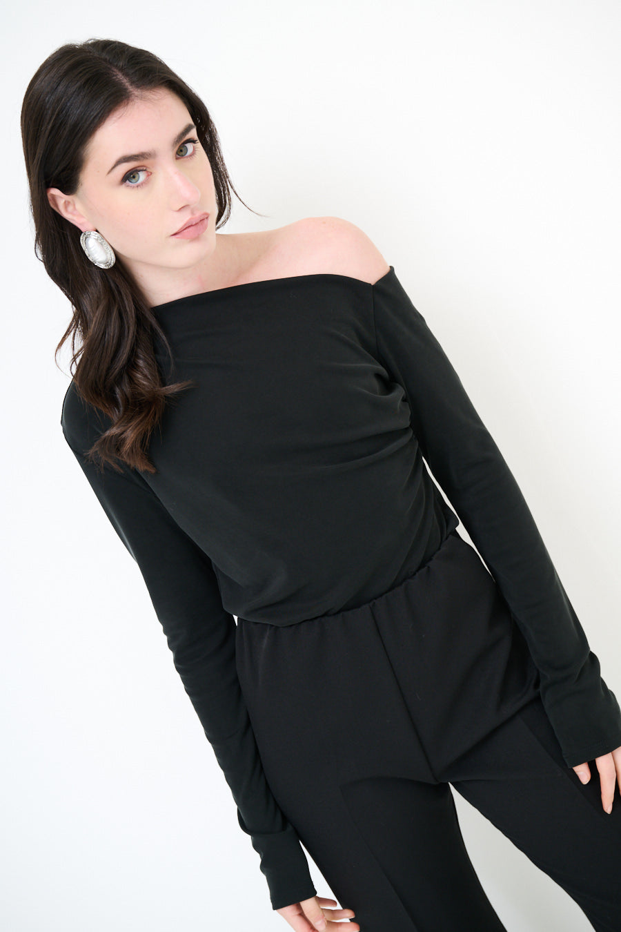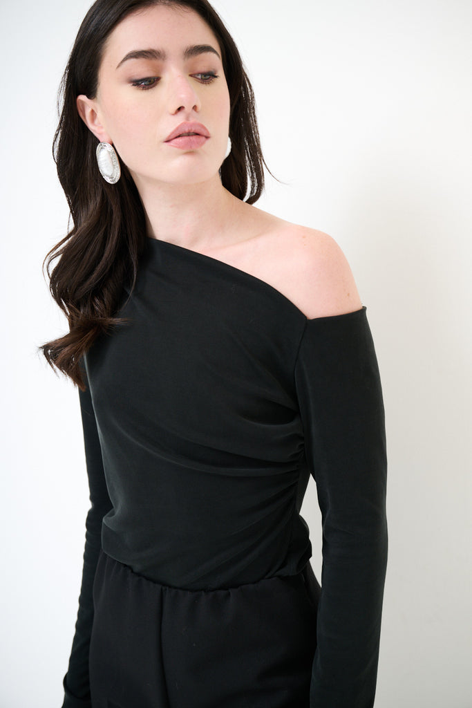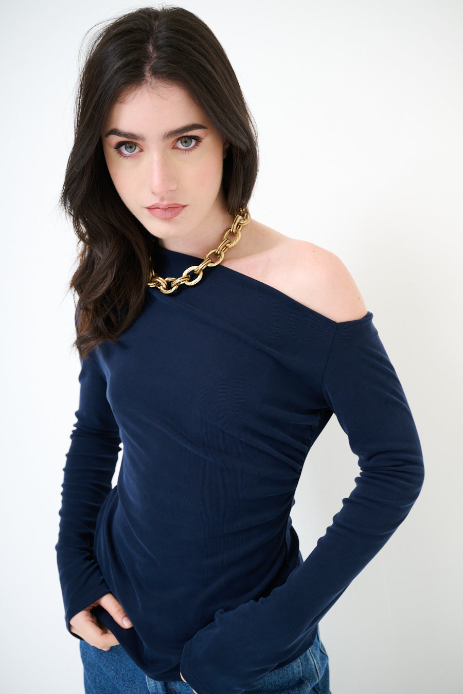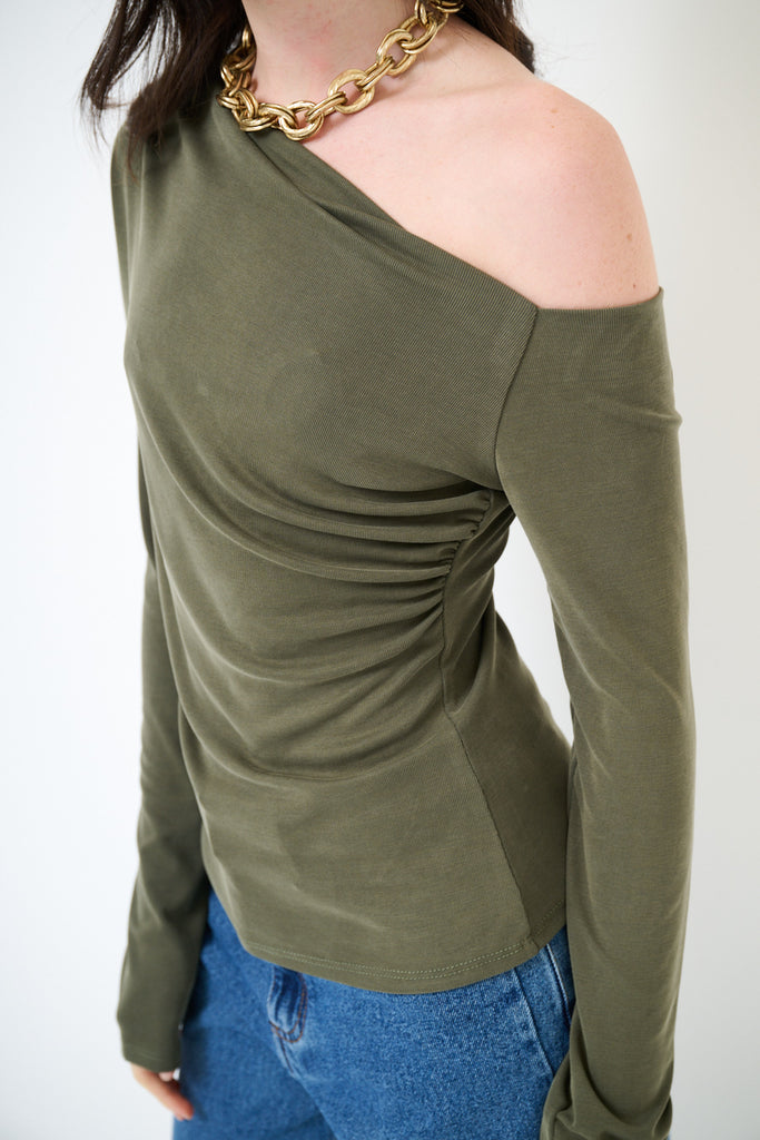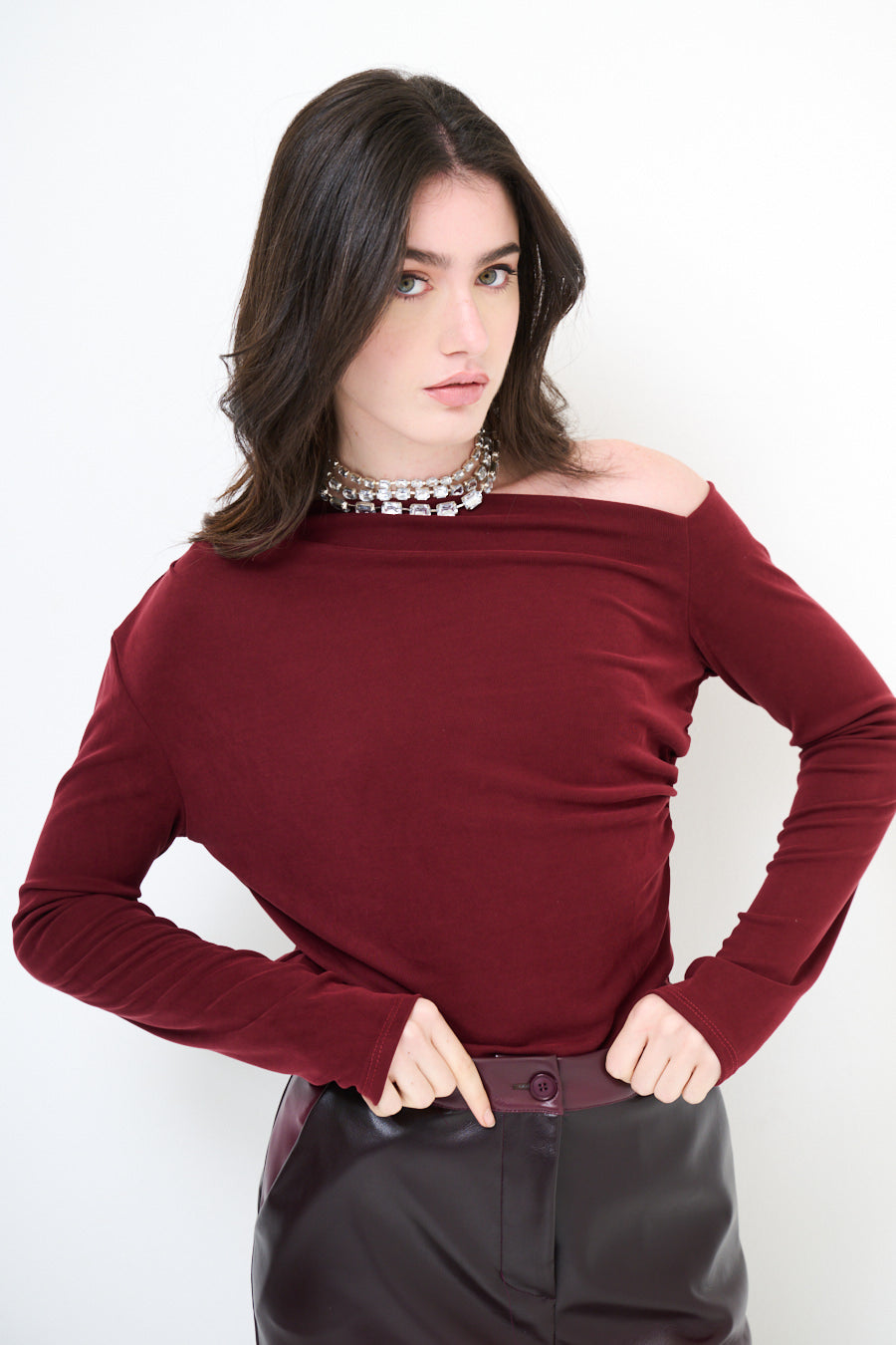 - Cuireann neckline lasmuigh den ghualainn teagmháil baininscneach galánta agus nua-aimseartha
