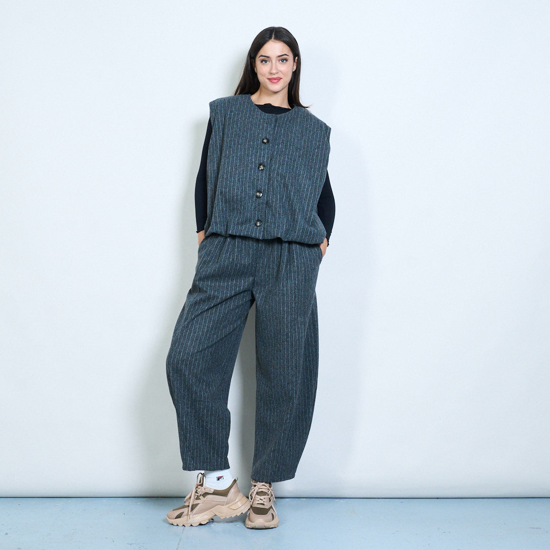 - Tá patrún pinstripe ingearach scagtha aige le haghaidh cuma cliste oiriúnaithe