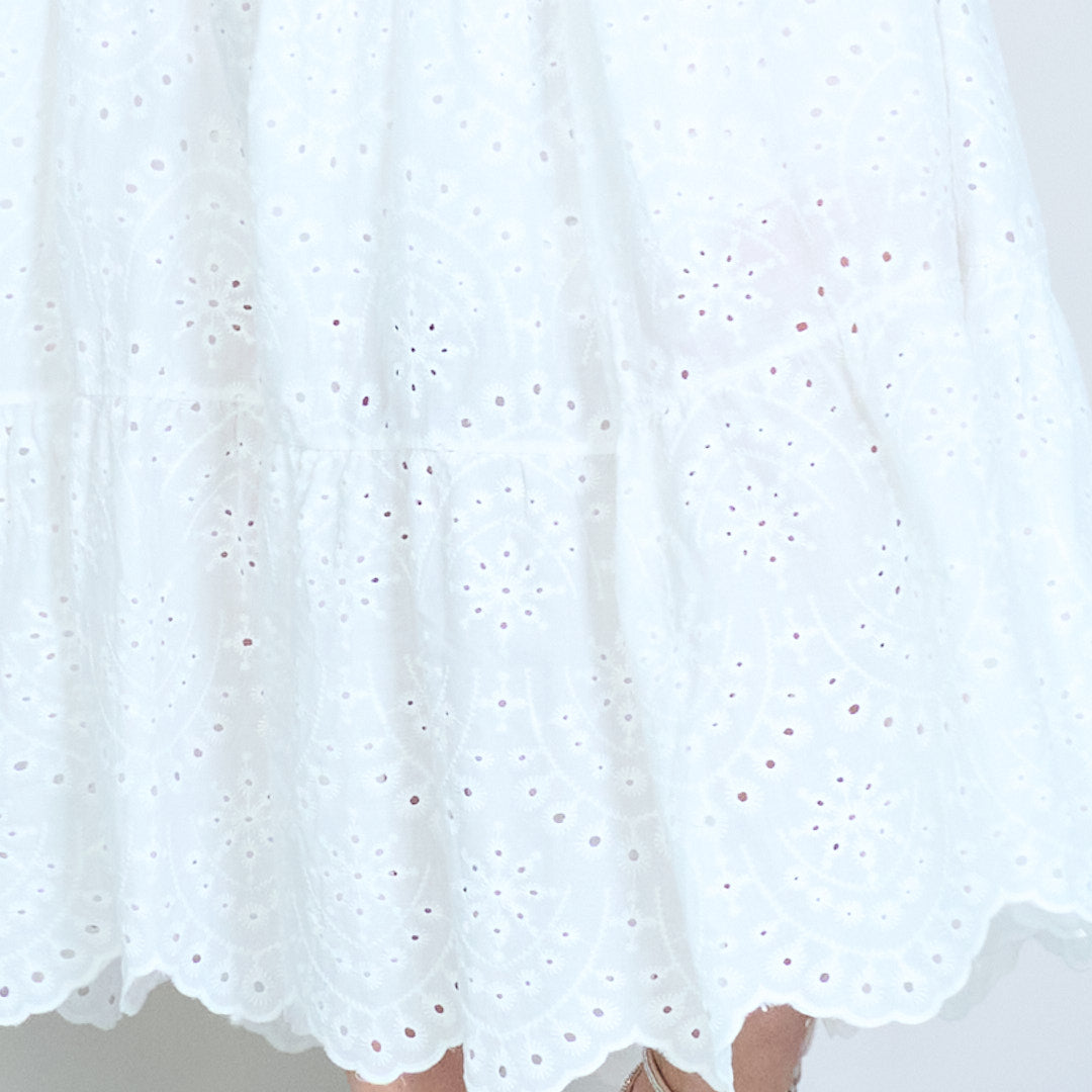 - Cruthaíonn patrún Floral eyelet uigeacht íogair ar fud an sciorta