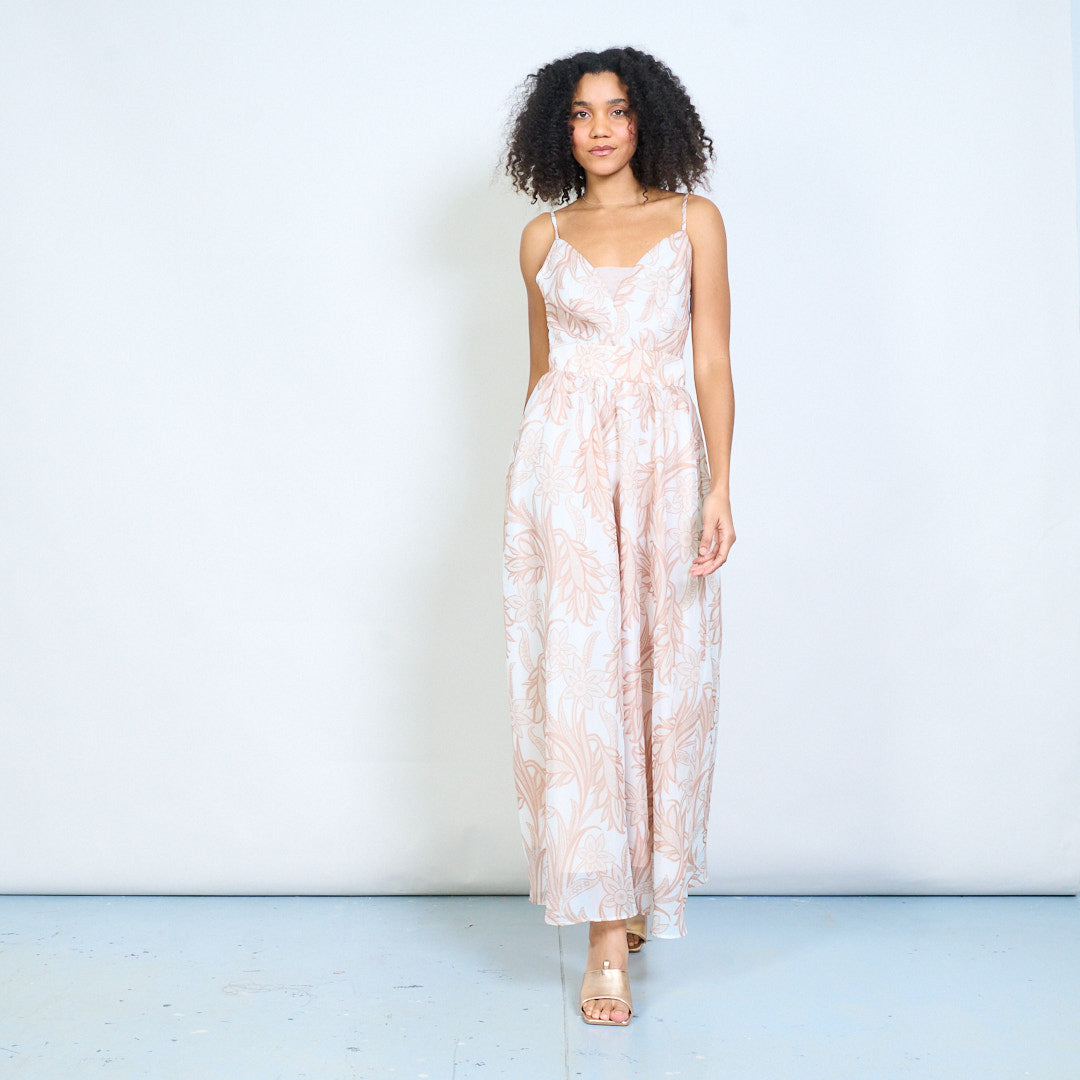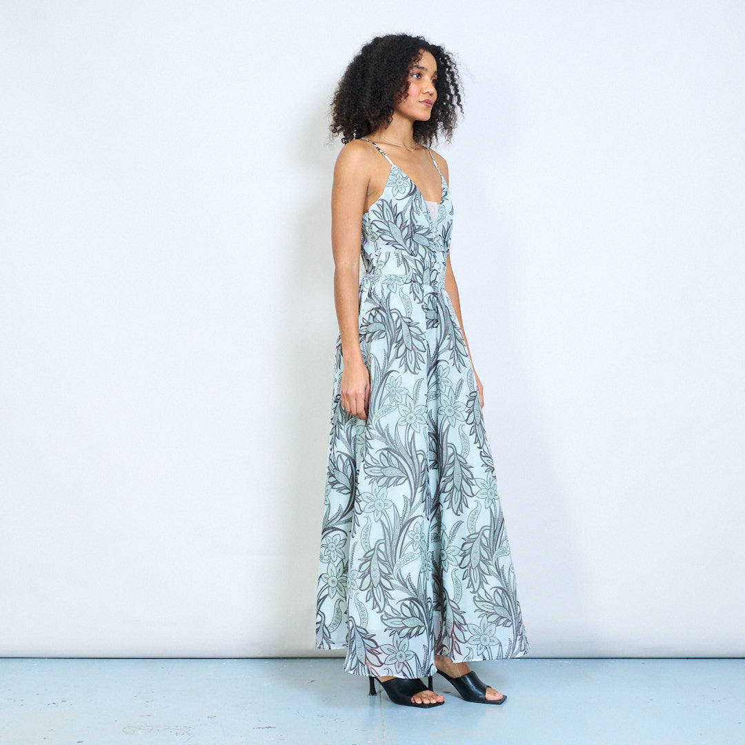 - Gúna maxi sleeveless le cló bláthanna galánta