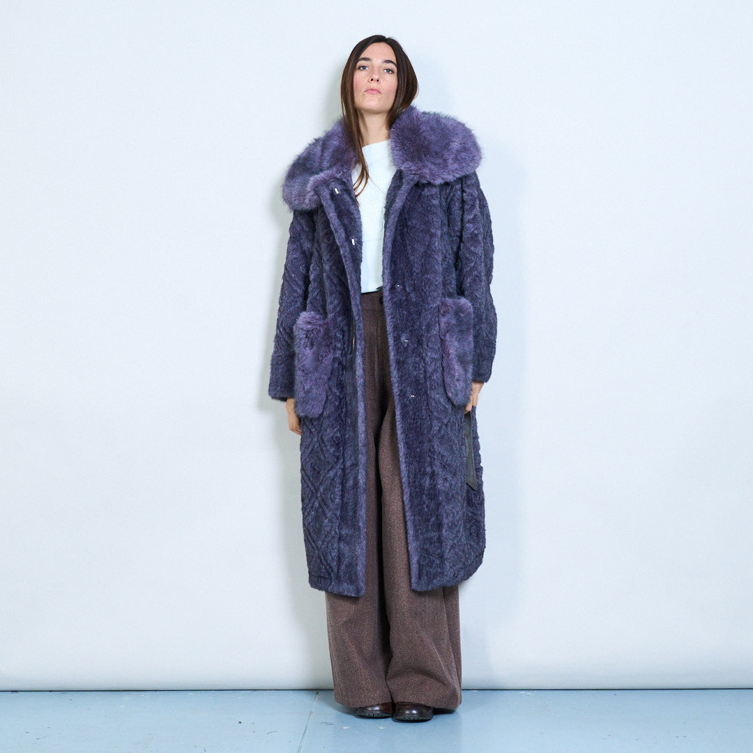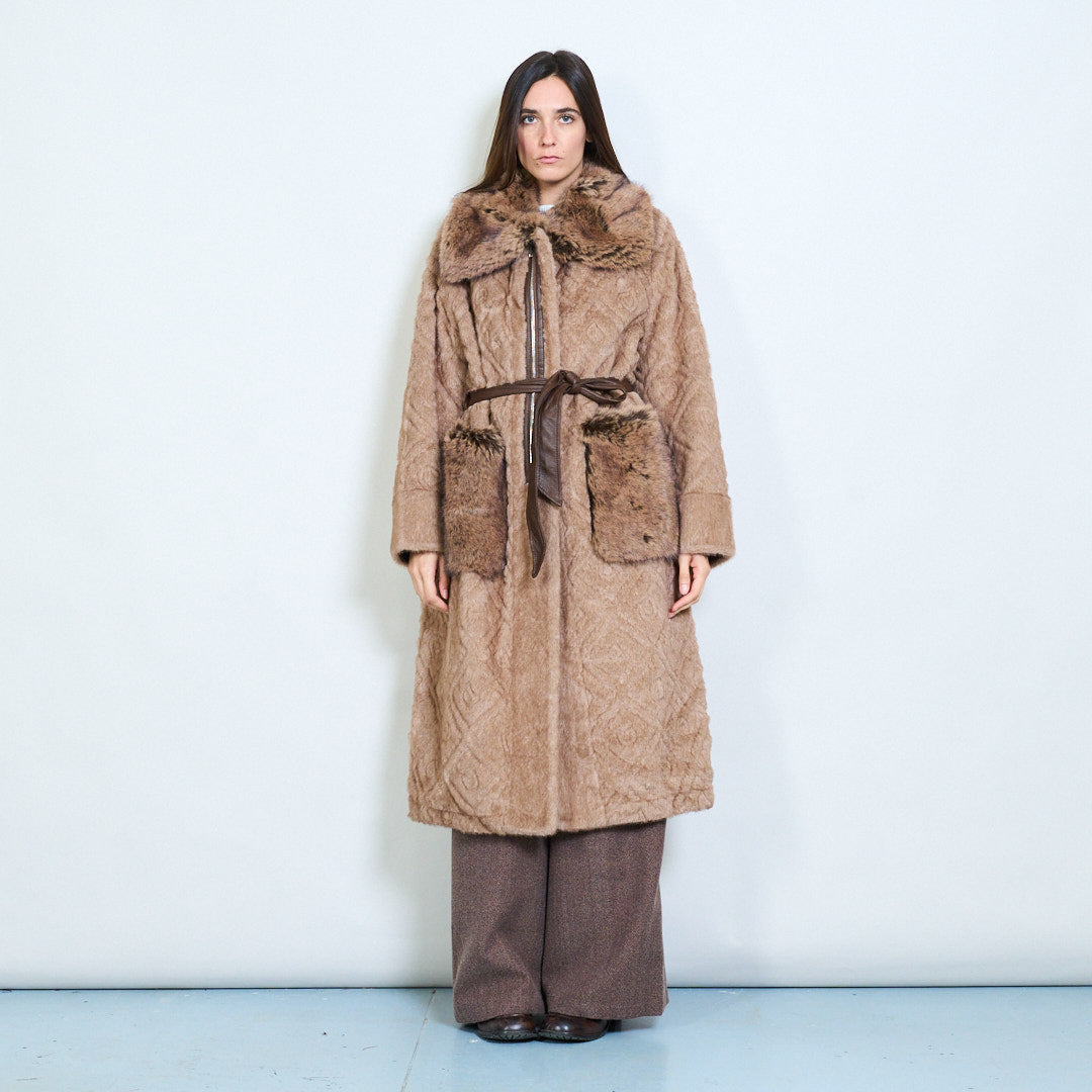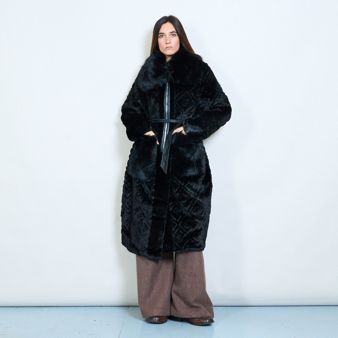 Cóta Belted Cuilte Diamond le Plush Collar Mórdhíola