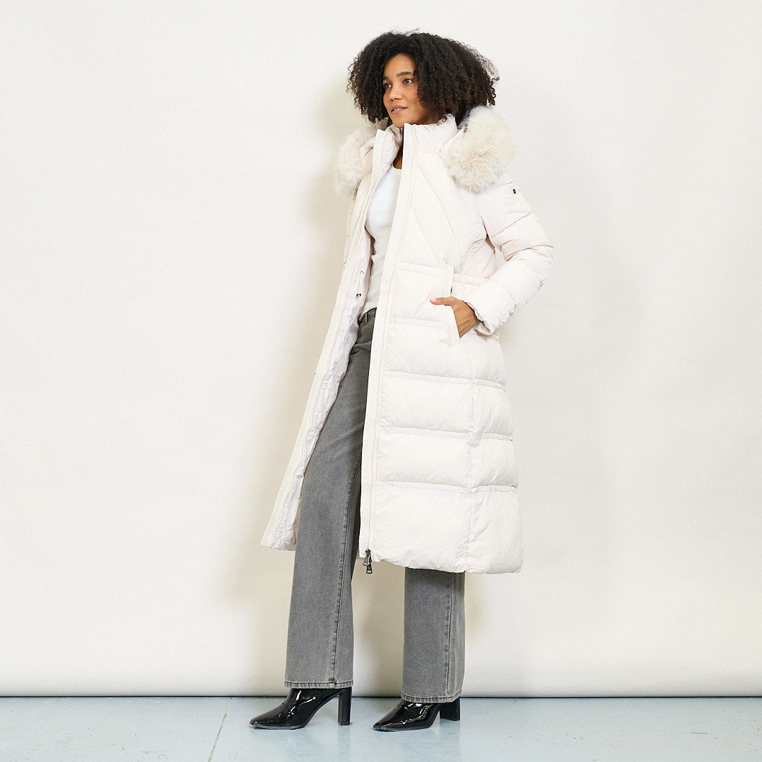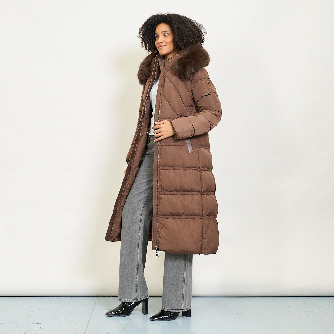 Cóta padded cuilteáilte fada le cochall fionnaidh faux agus fuála mórdhíola V-painéil