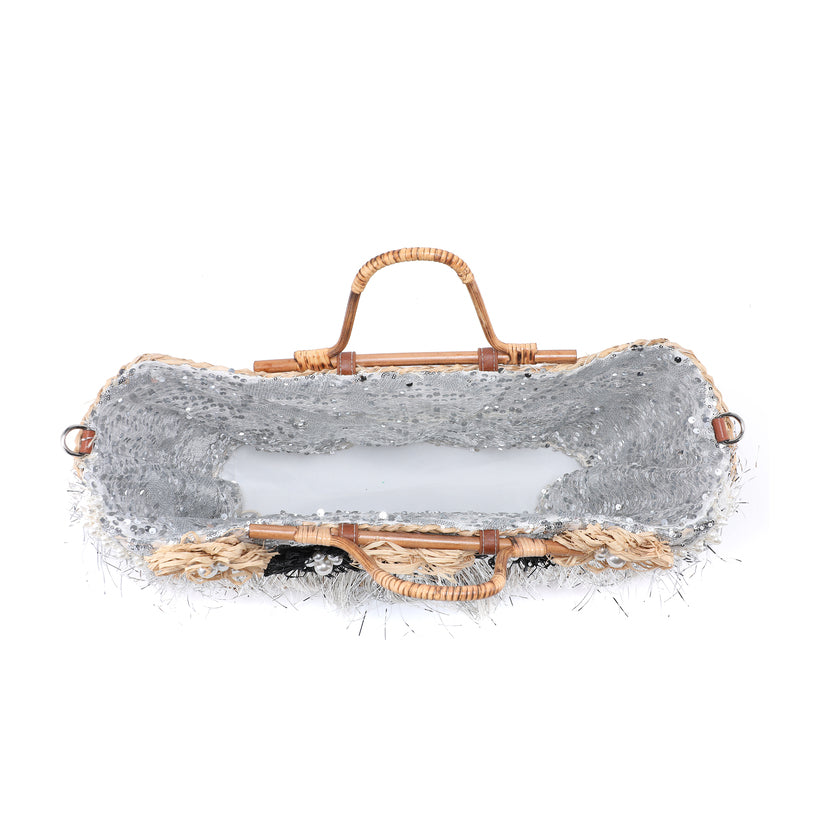 - Maisithe le Appliques Flower Block Black agus Beige Raffia, críochnaithe le hionaid Pearl