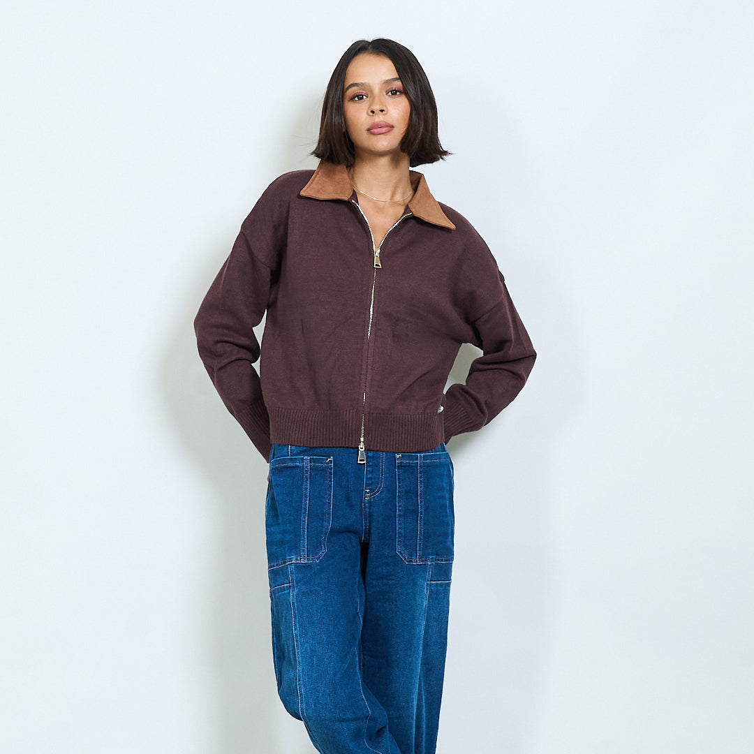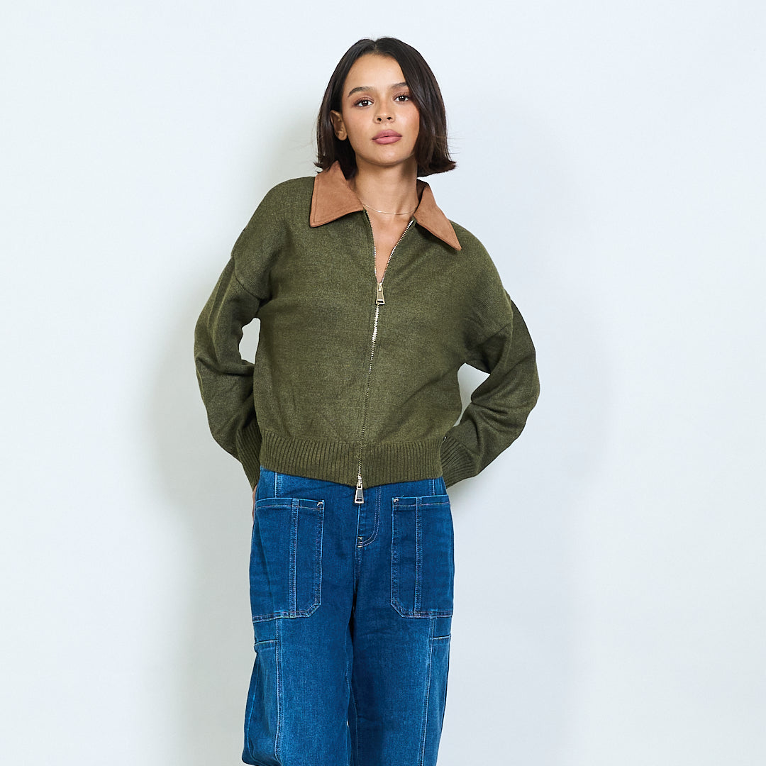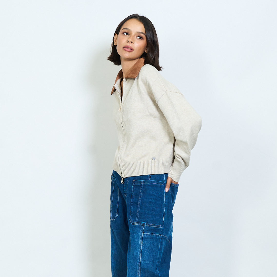 - Cardigan cniotáilte le dúnadh zip tosaigh