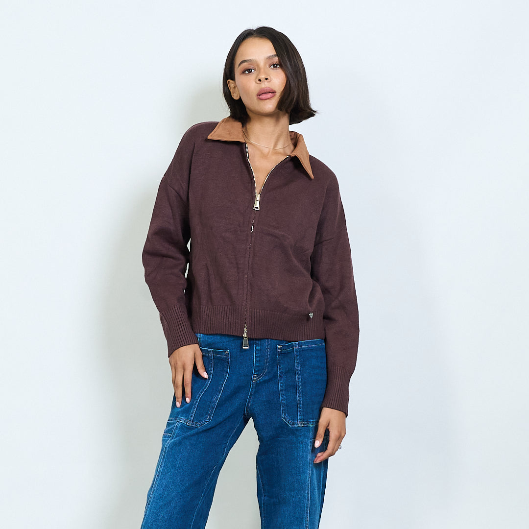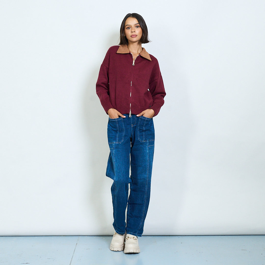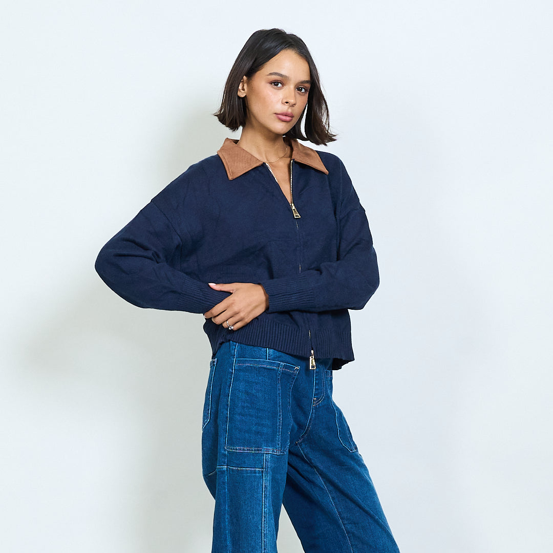 - Cardigan cniotáilte le dúnadh zip tosaigh