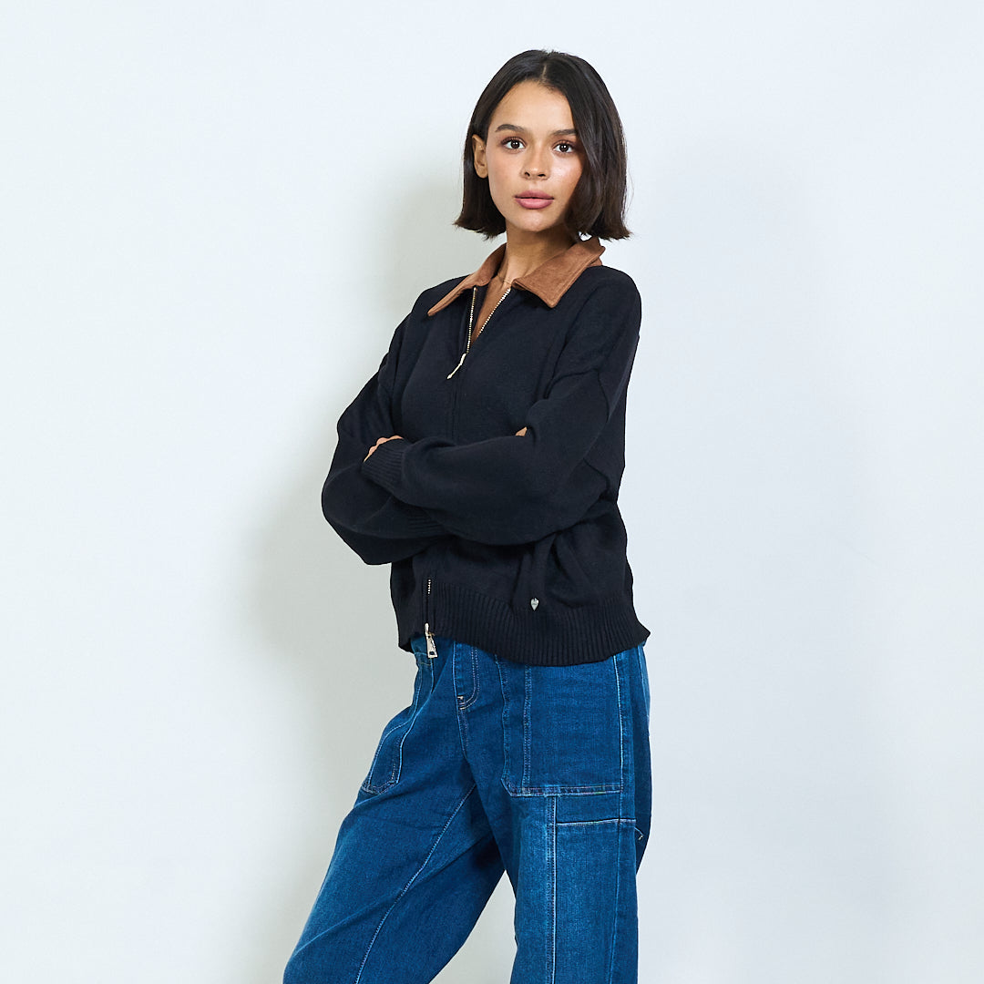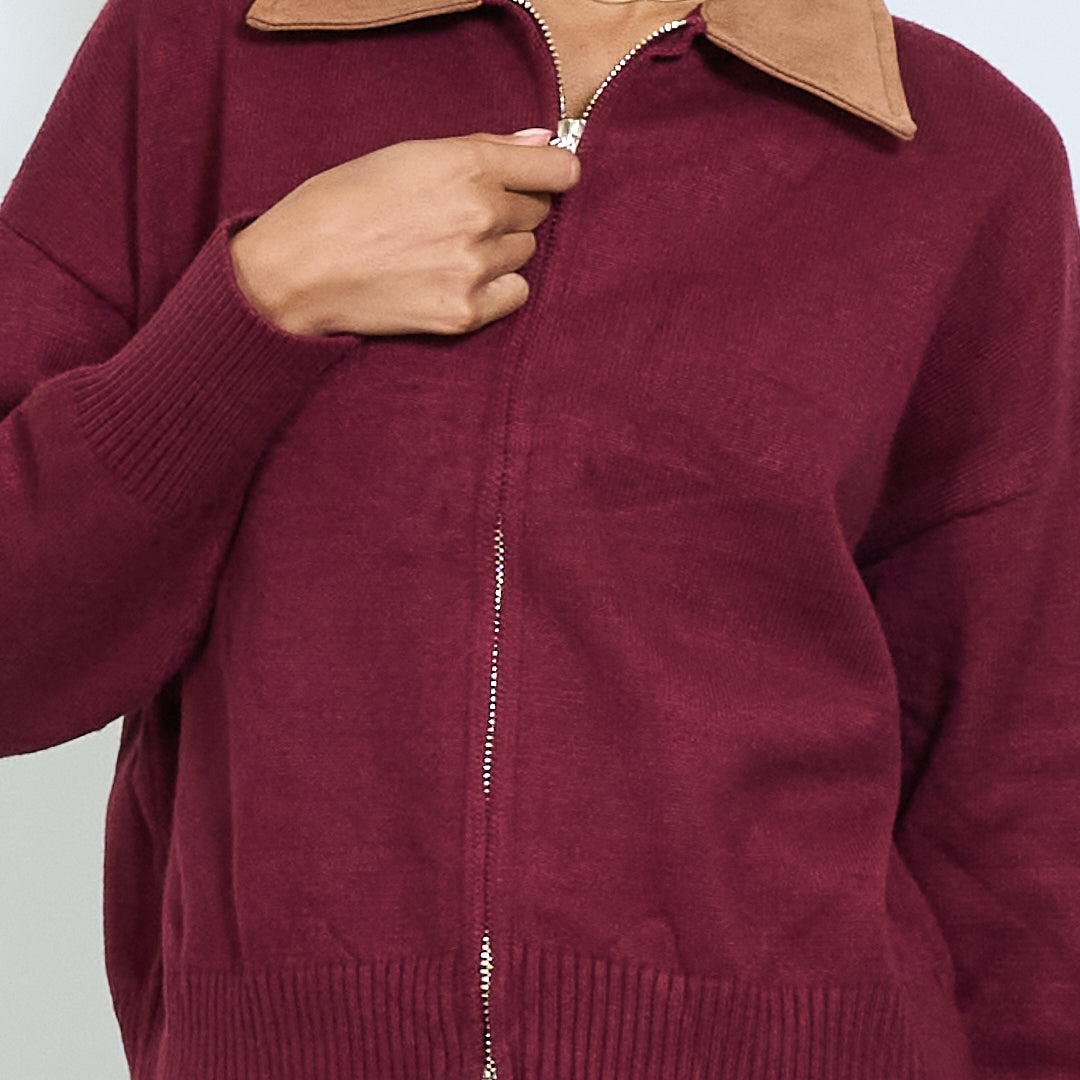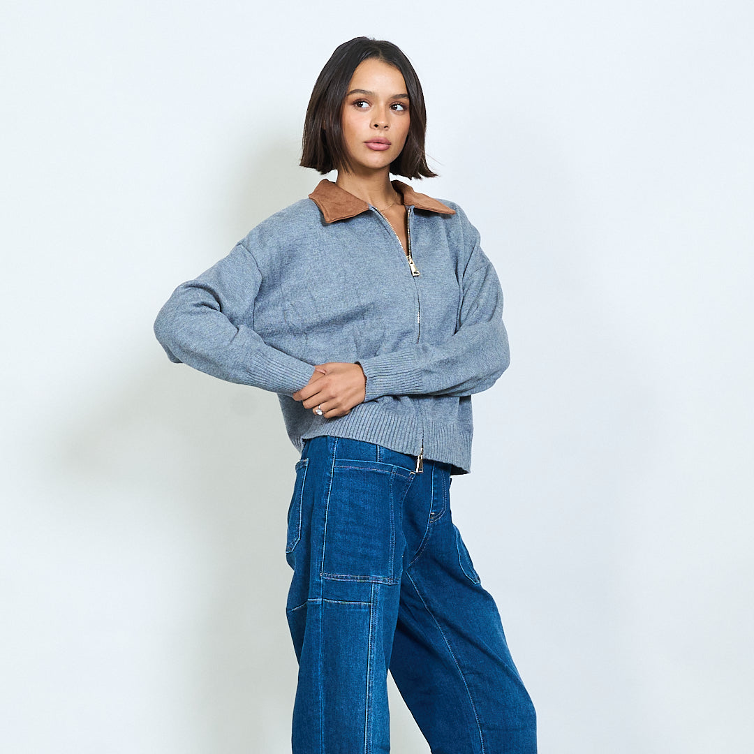 Cardigan cniotáilte zip-up le codarsnacht suede collar mórdhíola