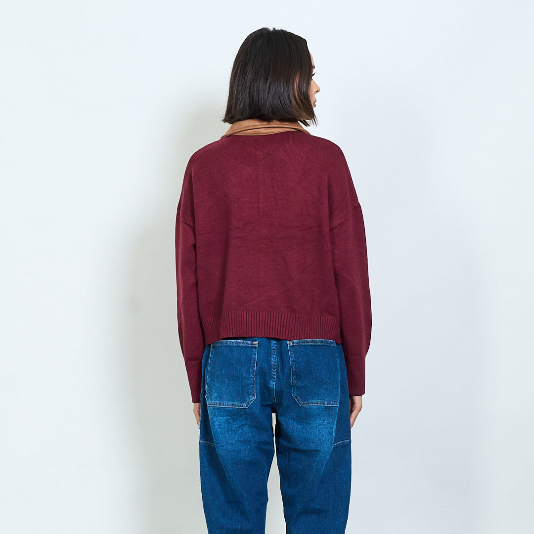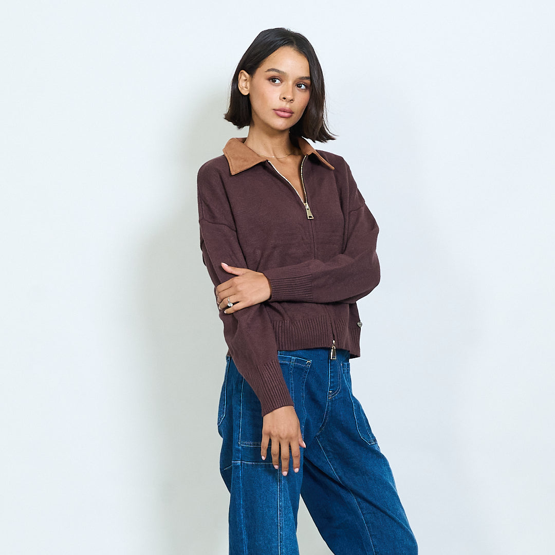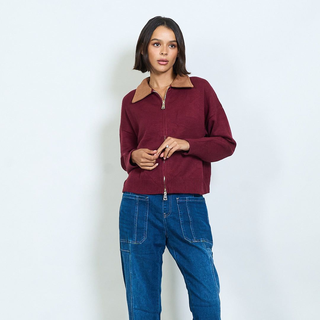 Cardigan cniotáilte zip-up le codarsnacht suede collar mórdhíola