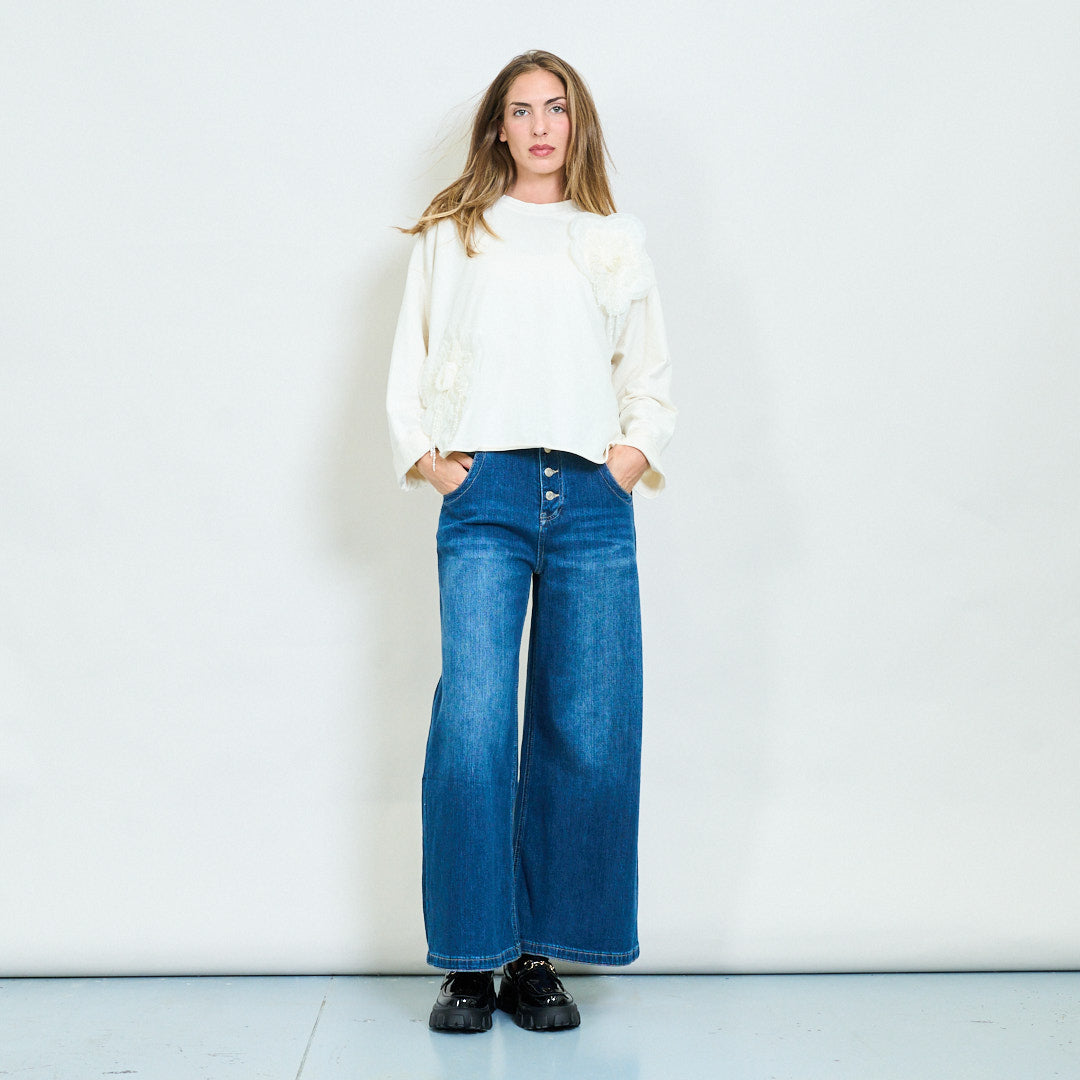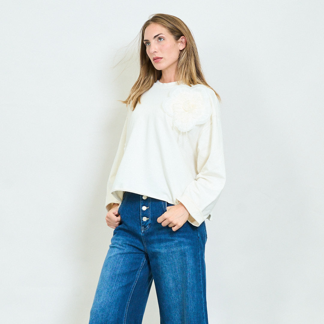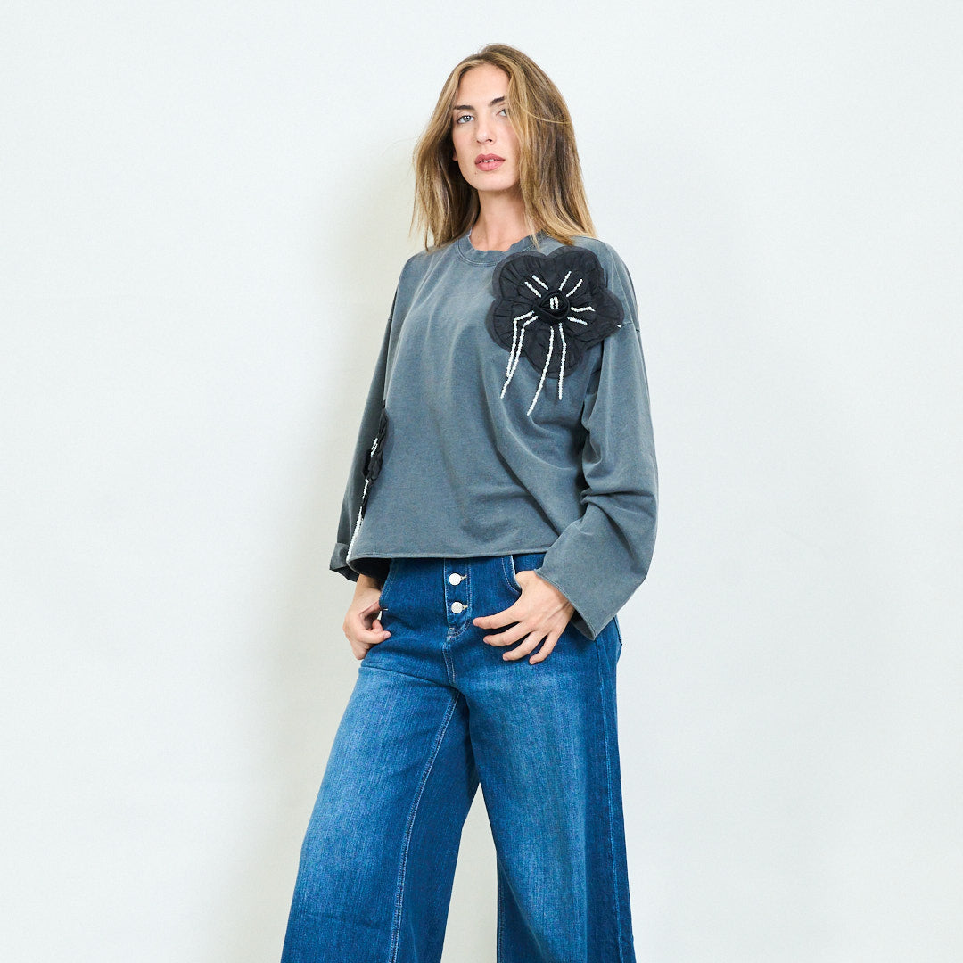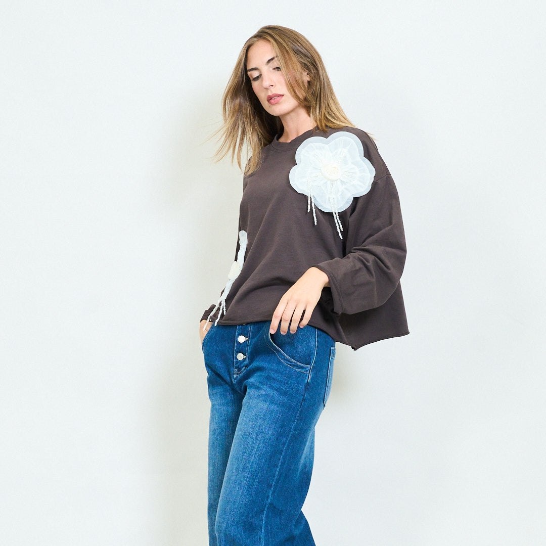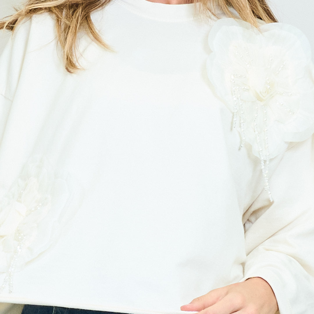 Sweatshirt ró -mhór le 3D Floral Pearl Appliqués Mórdhíola
