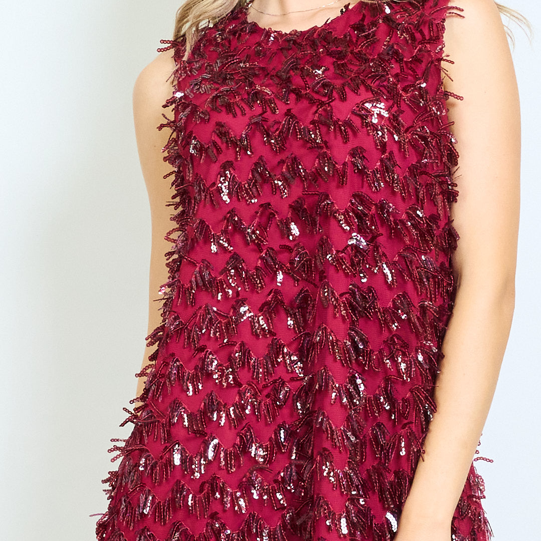 Vendita all'ingrosso di mini abito senza maniche impreziosito da frange di paillettes