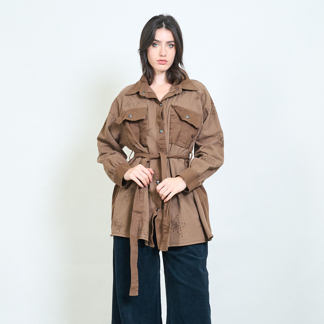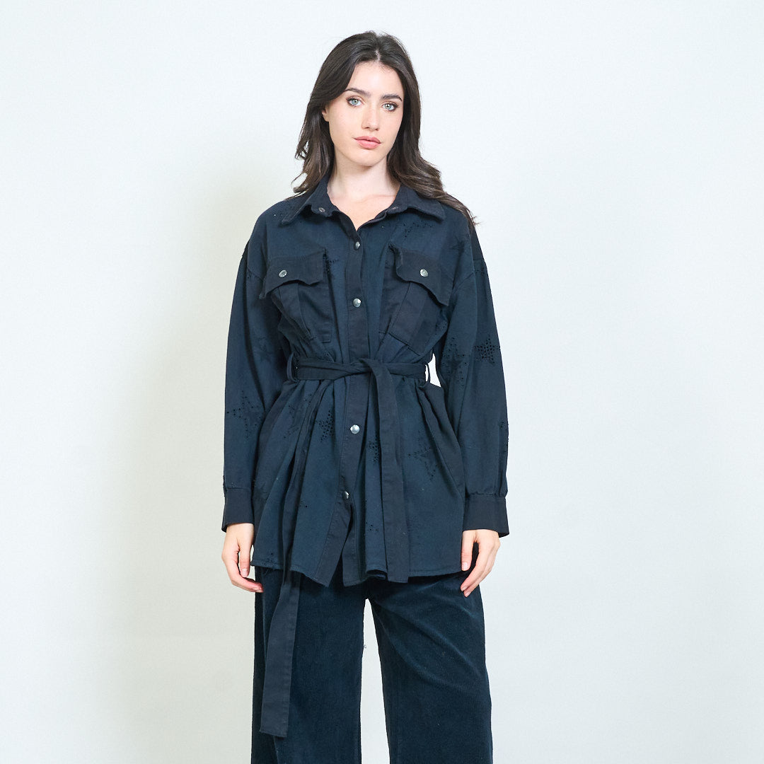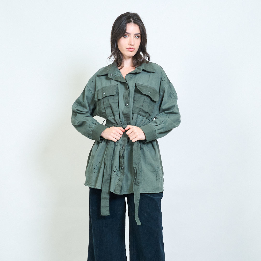 Vendita all'ingrosso di giacche-camicie con cintura ricamate con occhielli