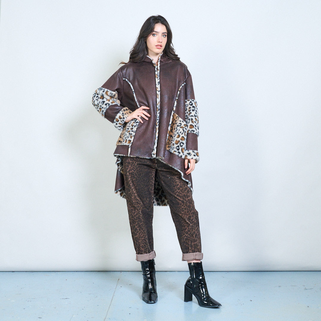 - Tessuto effetto scamosciato a contrasto abbinato a pannelli con stampa leopardata
