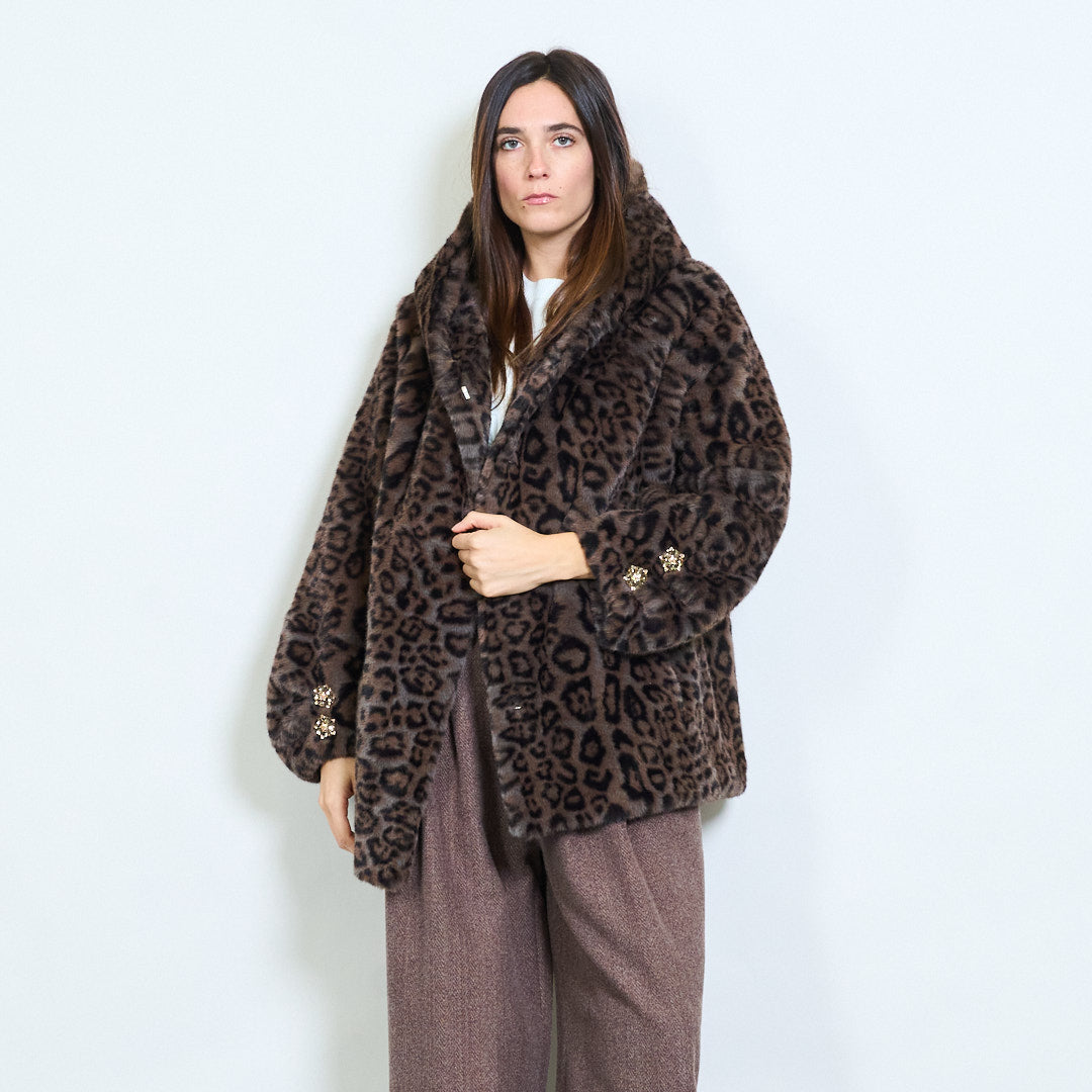 Vendita all'ingrosso di giacche invernali con cappuccio in pelliccia sintetica con stampa leopardata