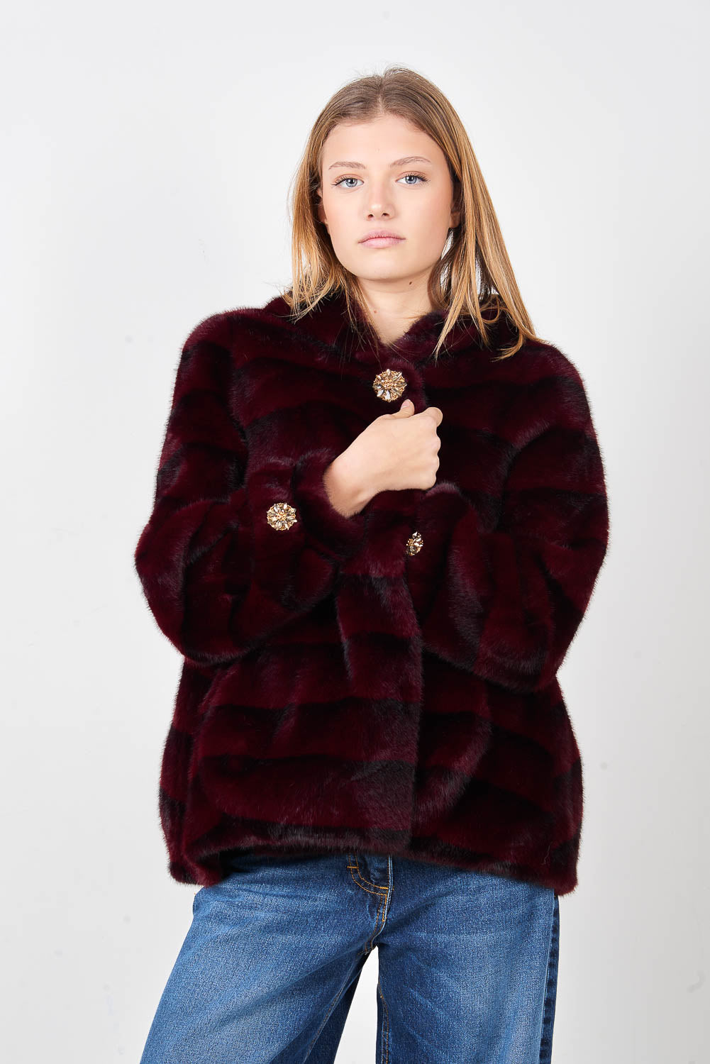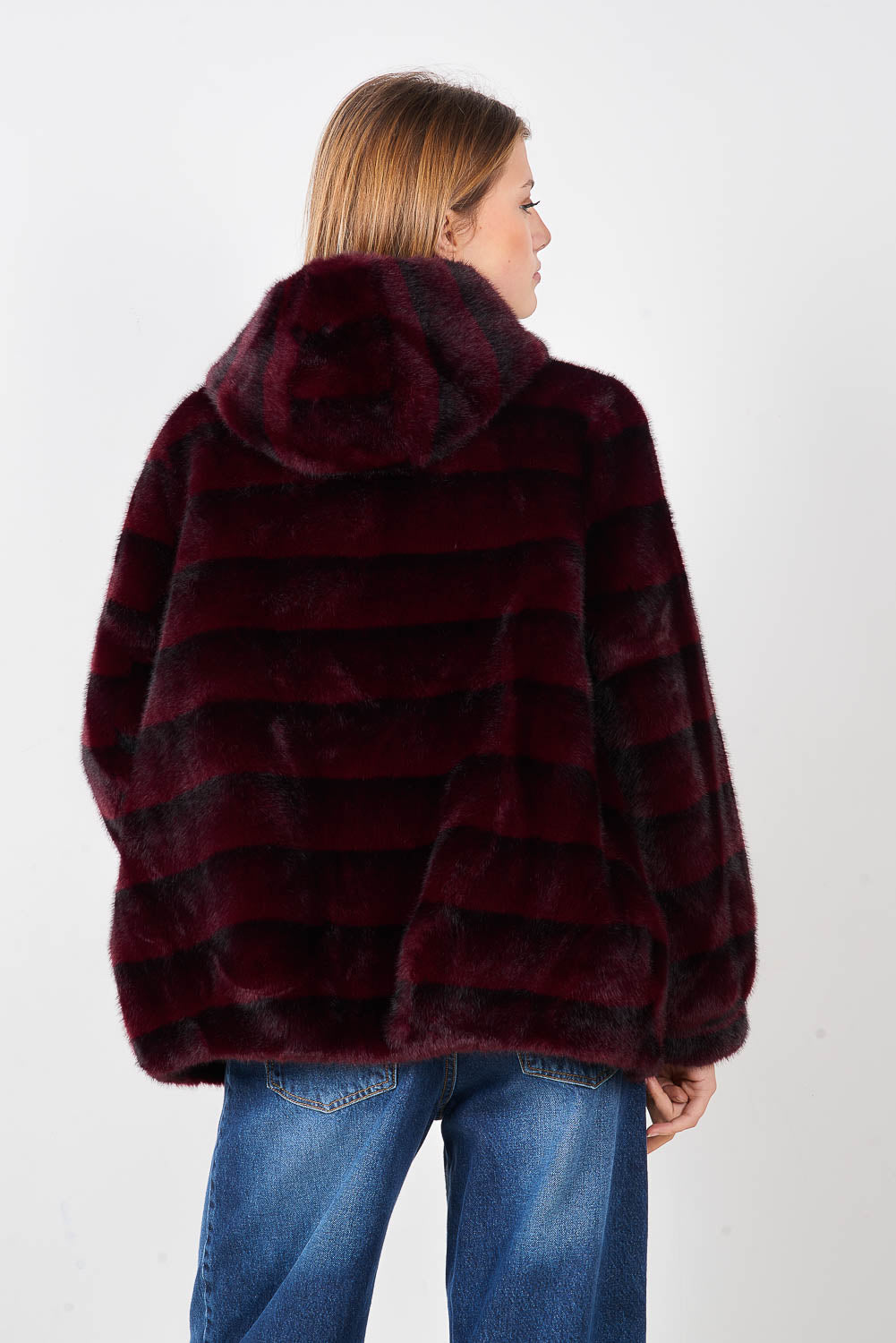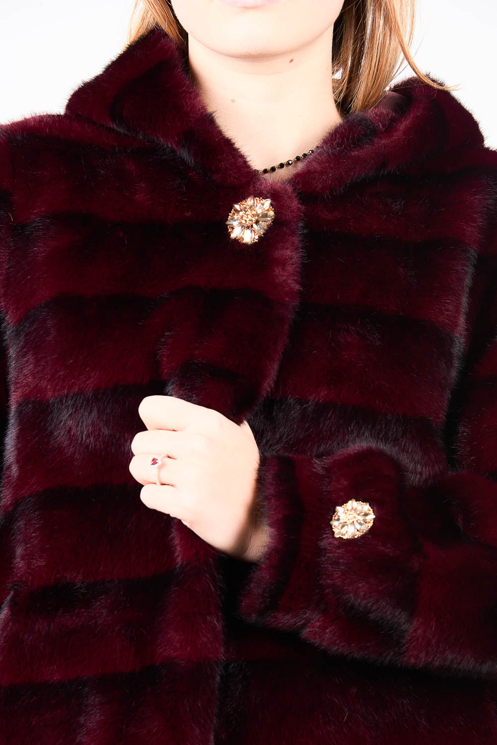 Giacca frontale in peluche con cappuccio a righe con bottoni testurizzati e accenti decorativi all'ingrosso