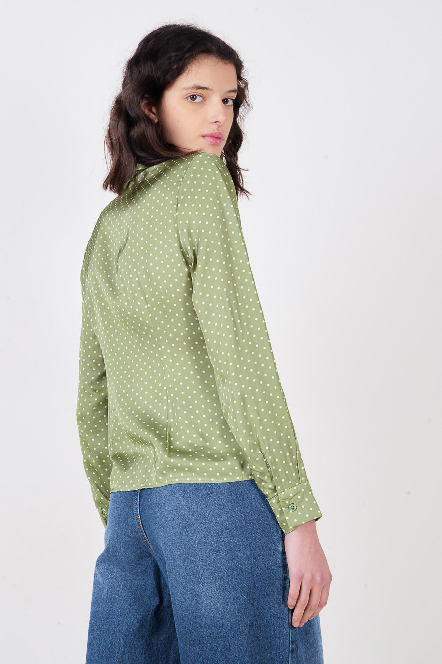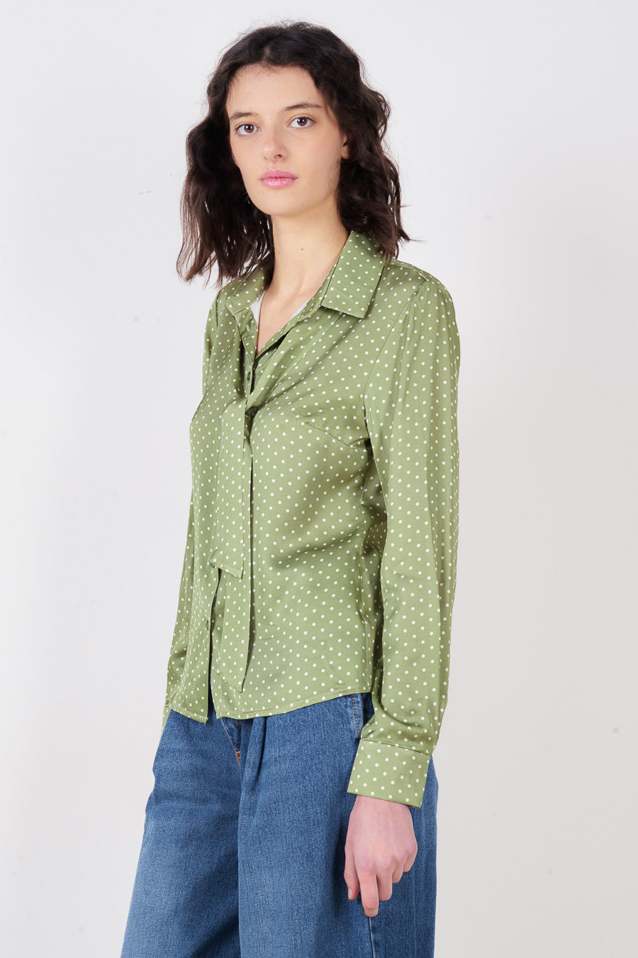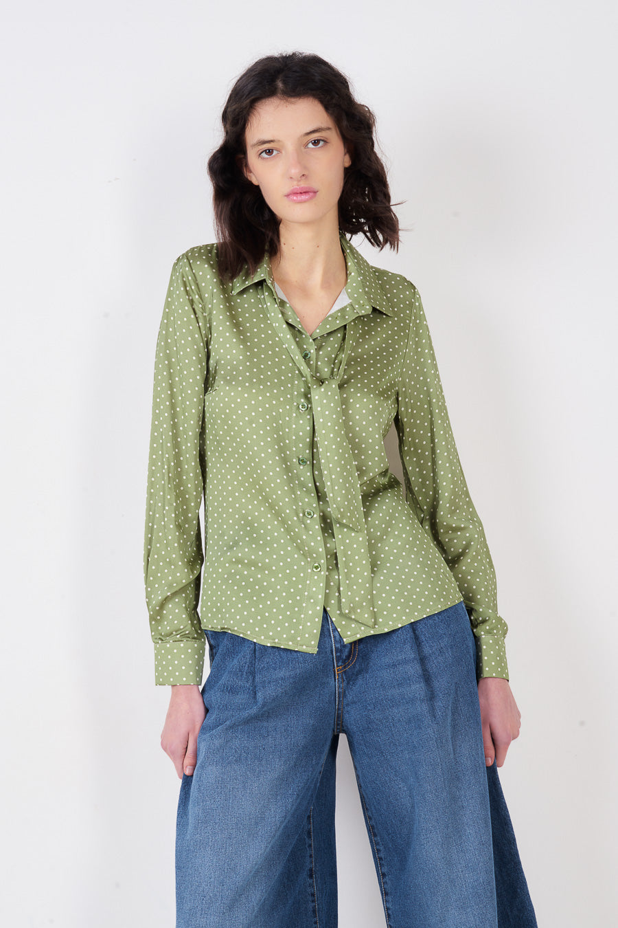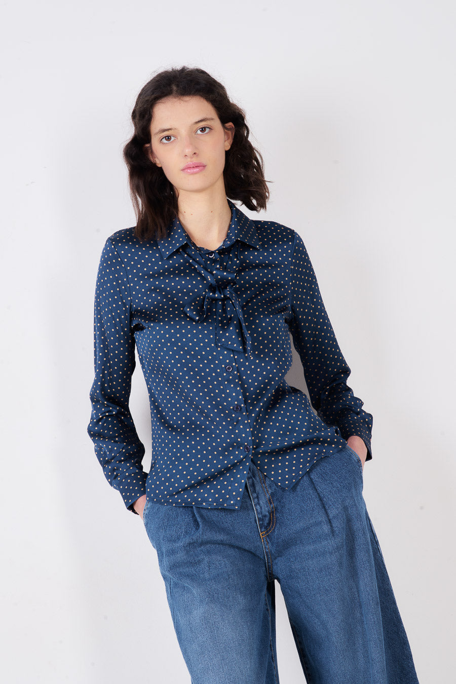 Vendita all'ingrosso di camicetta con bottoni sul collo e cravatta a pois